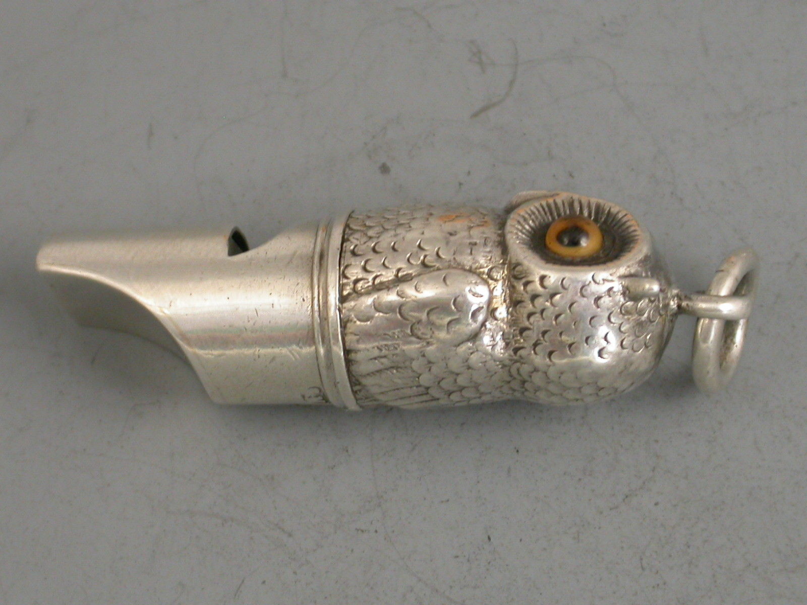 A Victorian novelty silver Whistle formed as an Owl, with amber glass eyes and attached suspension ring.