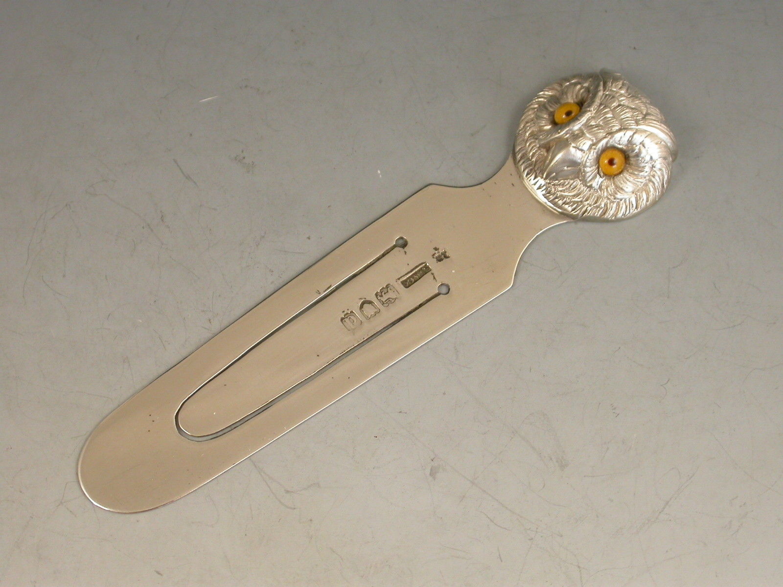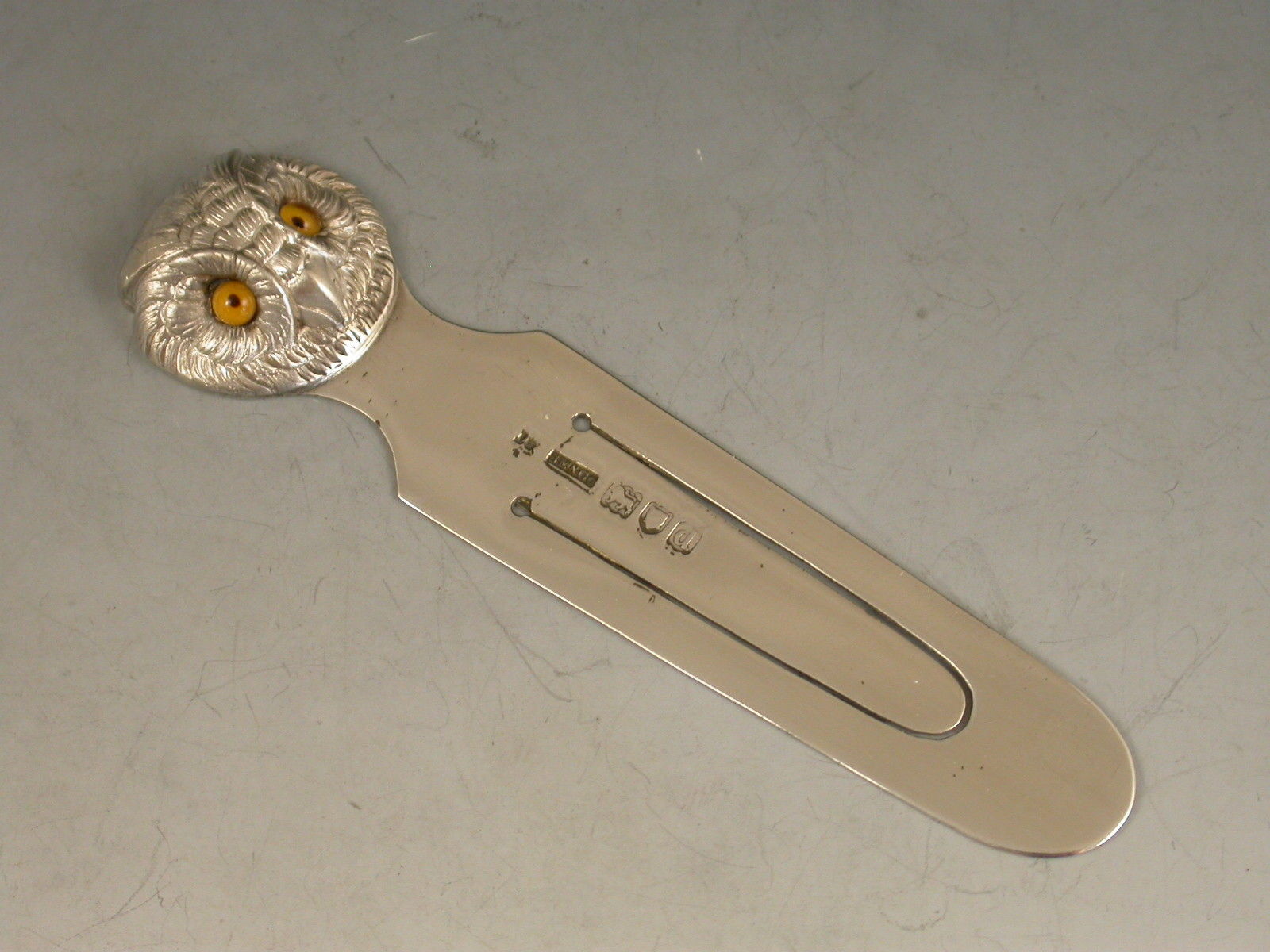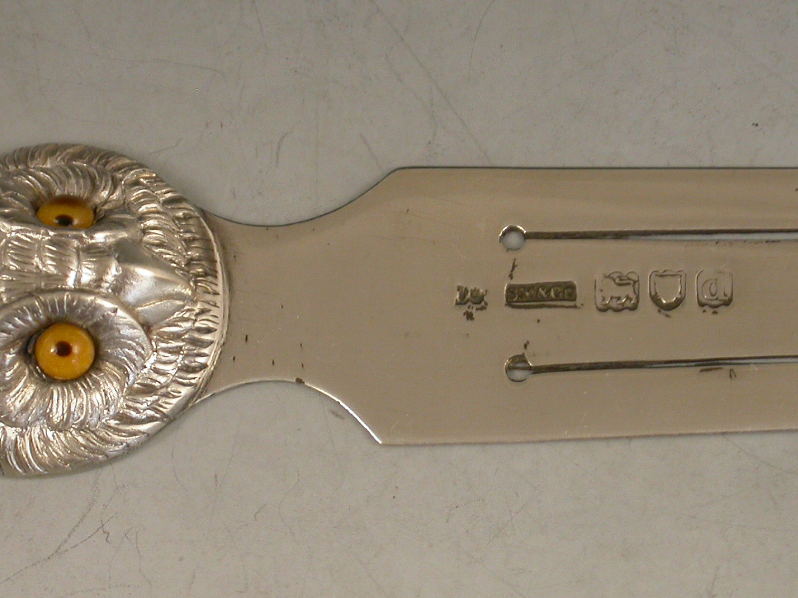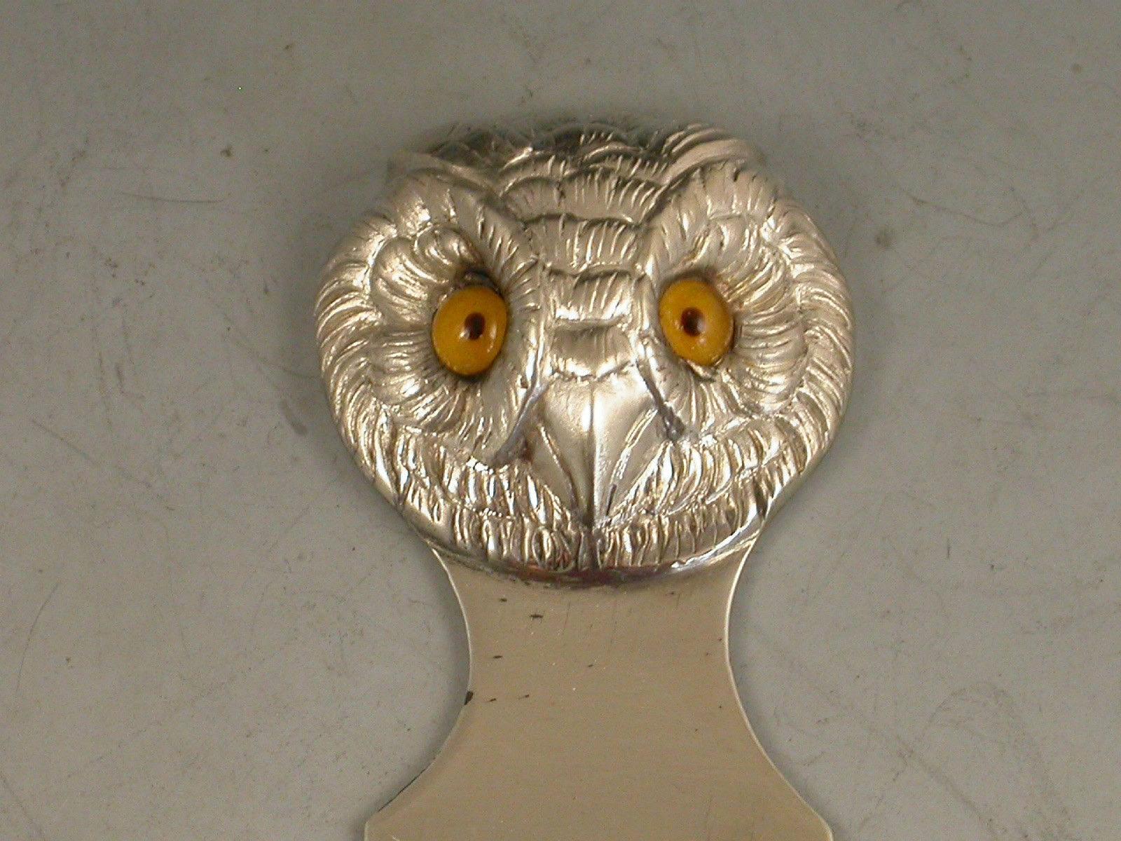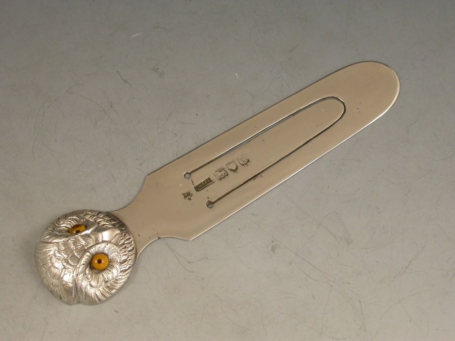 A good Victorian novelty silver Bookmark, the terminal formed as an Owls Head with realistically chased feathers and amber glass eyes.