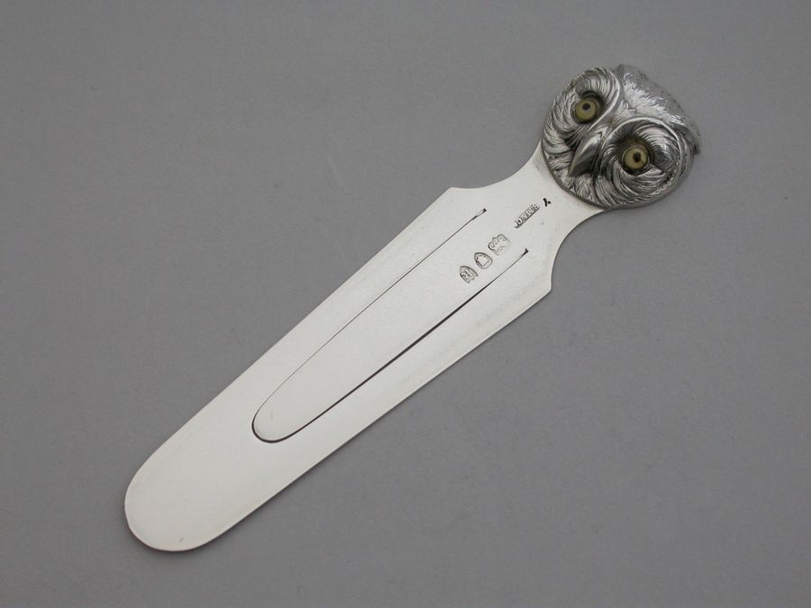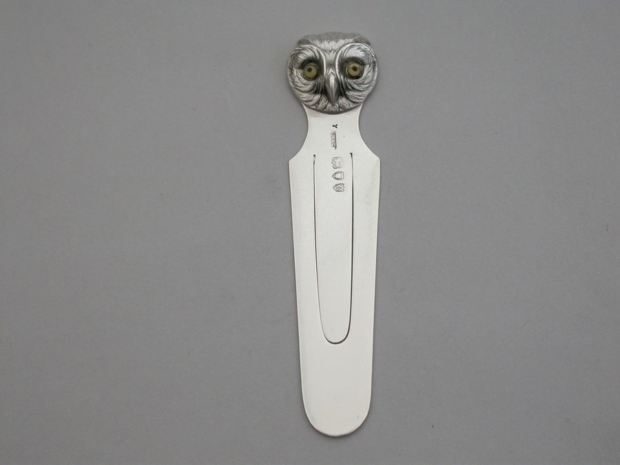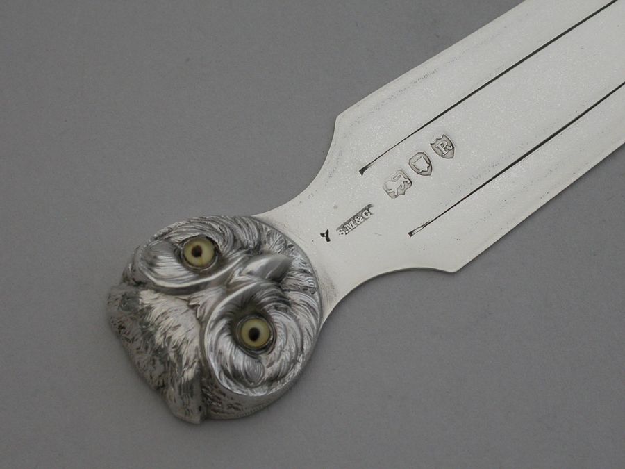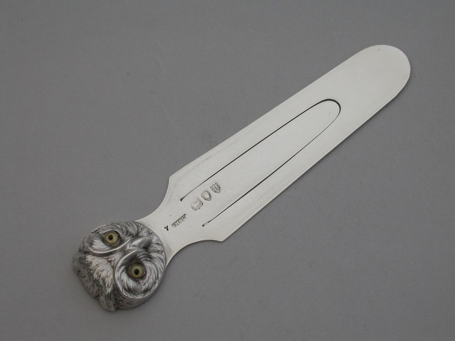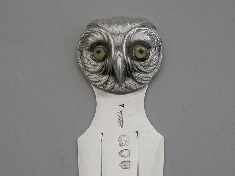 A good Victorian novelty silver Bookmark, the terminal formed as an Owls Head with realistically chased feathers and glass eyes.