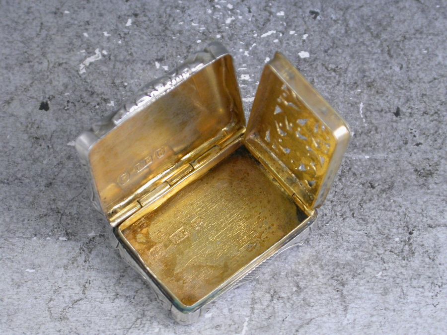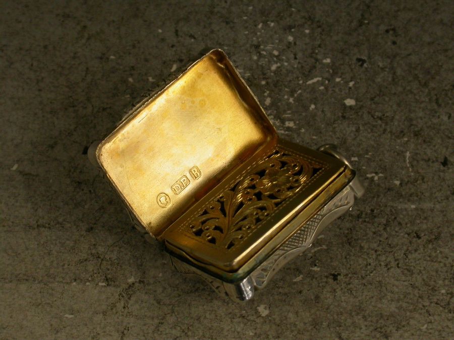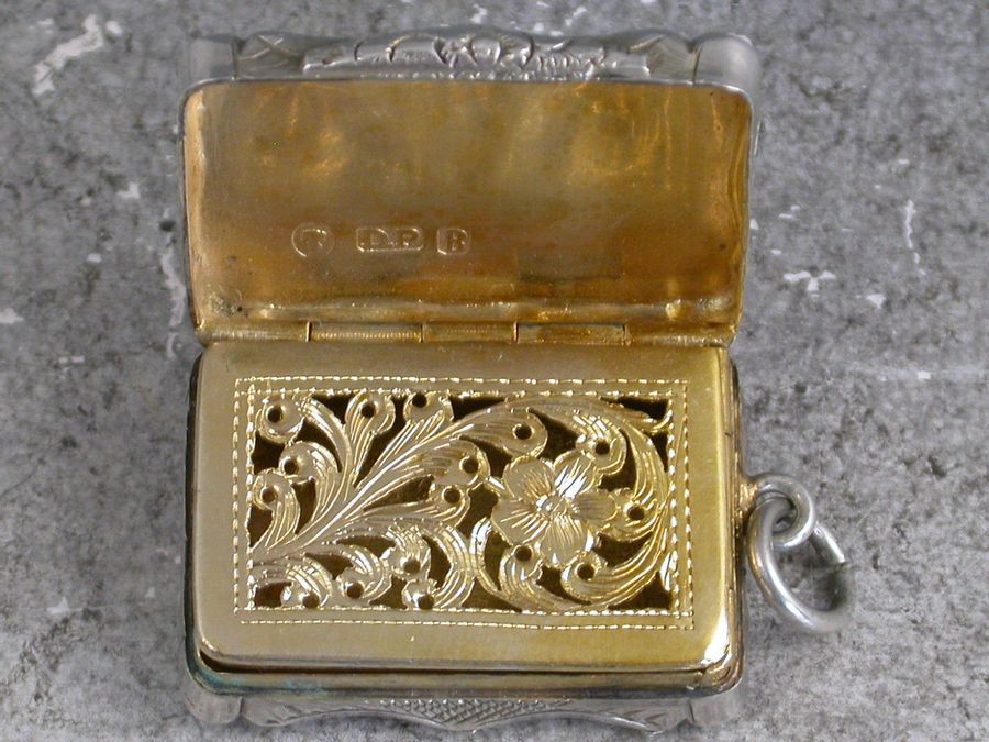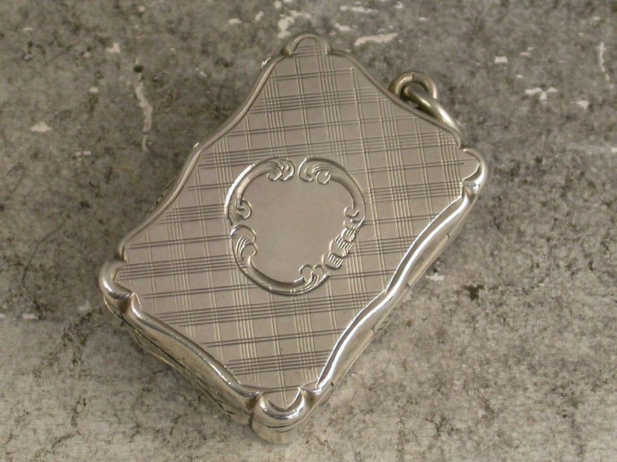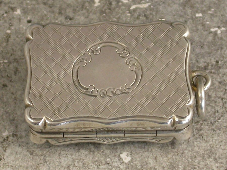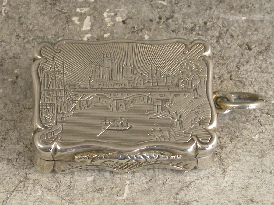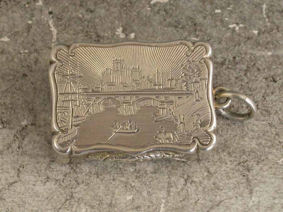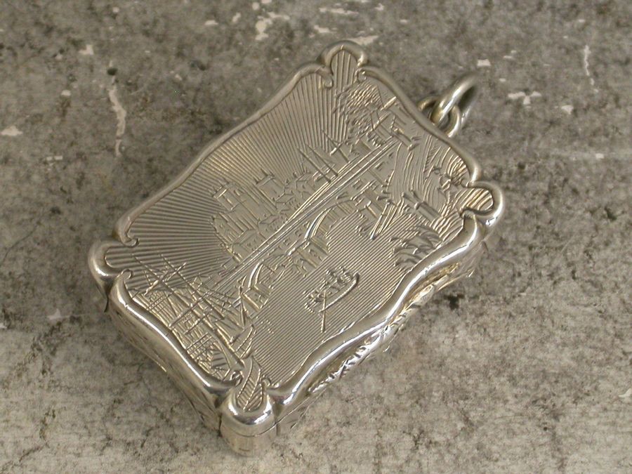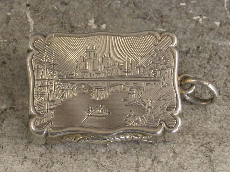 An extremely rare Victorian silver Vinaigrette of shaped rectangular form, the base with engraved tartan decoration surrounding a vacant cartouche, the lid engraved with a scene depicting Selby Bridge in Yorkshire with boats in the foreground, a steam train crossing the bridge and Selby Abbey in the background. Attached suspension ring.