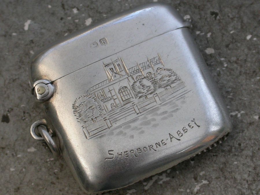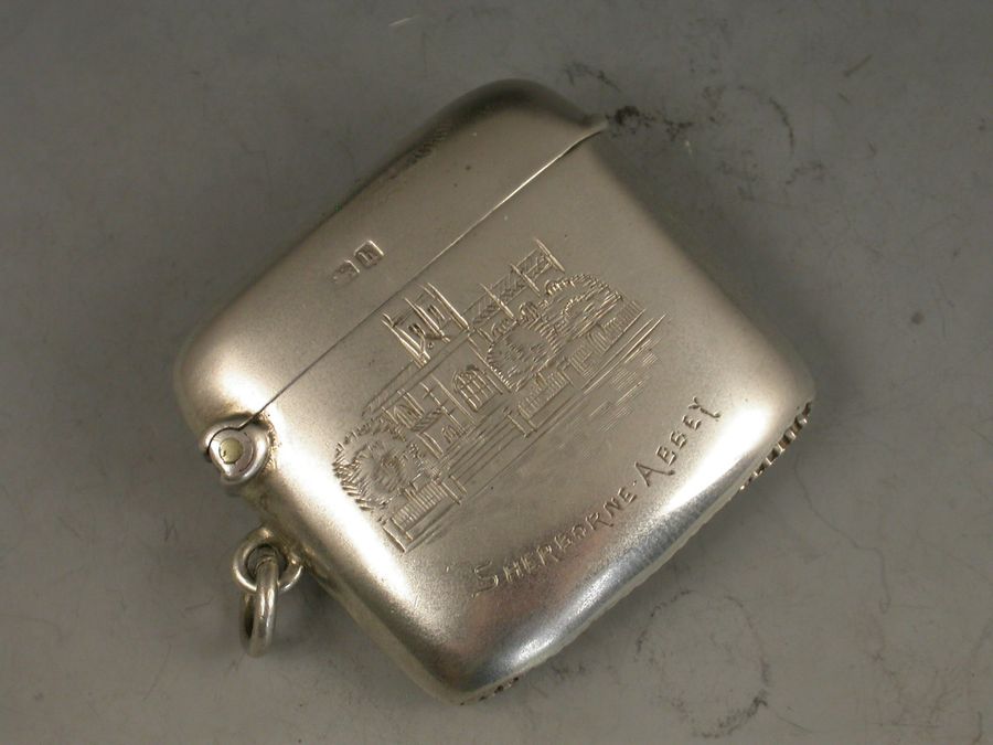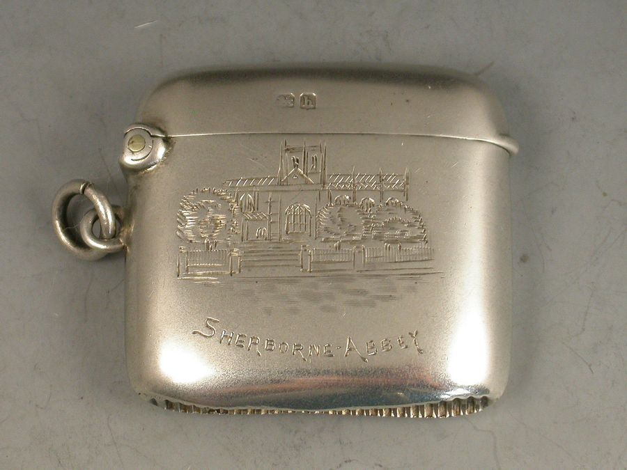 A rare Edwardian silver Vesta Case of rounded rectangular form with attached suspension ring and hinged flip-top lid. The face engraved with Sherborne Abbey.