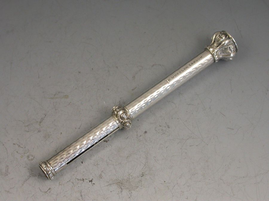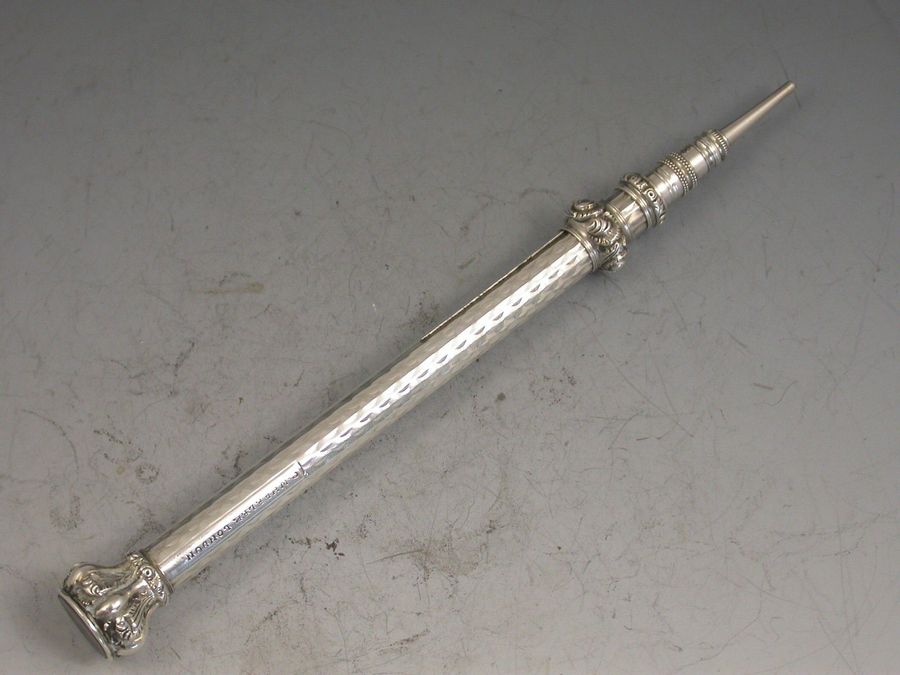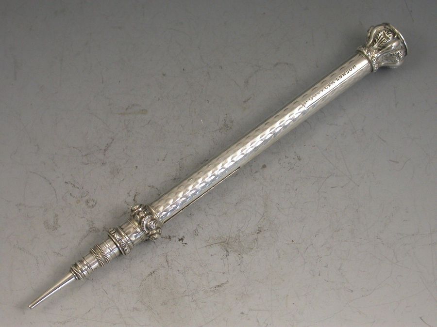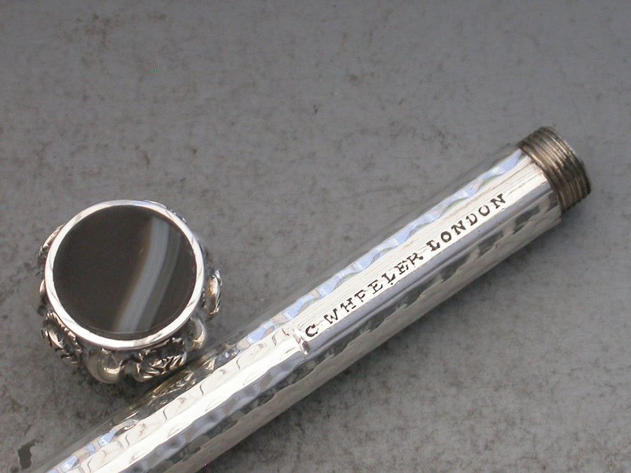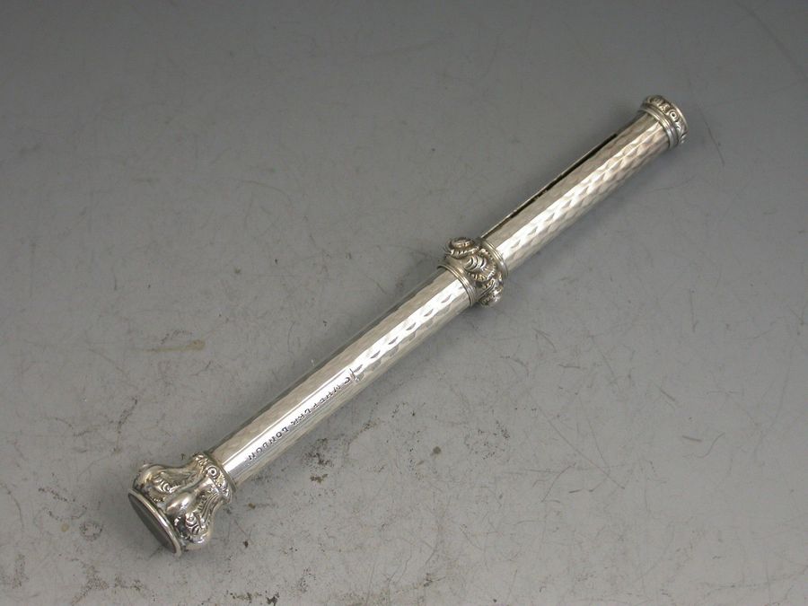 A good Victorian silver sliding Propelling Pencil with bright hammered finish to the body, raised chased decoration to the slider ring and terminal including acanthus leaves, a banded agate seal stone and 'rifled' lead reservoir.