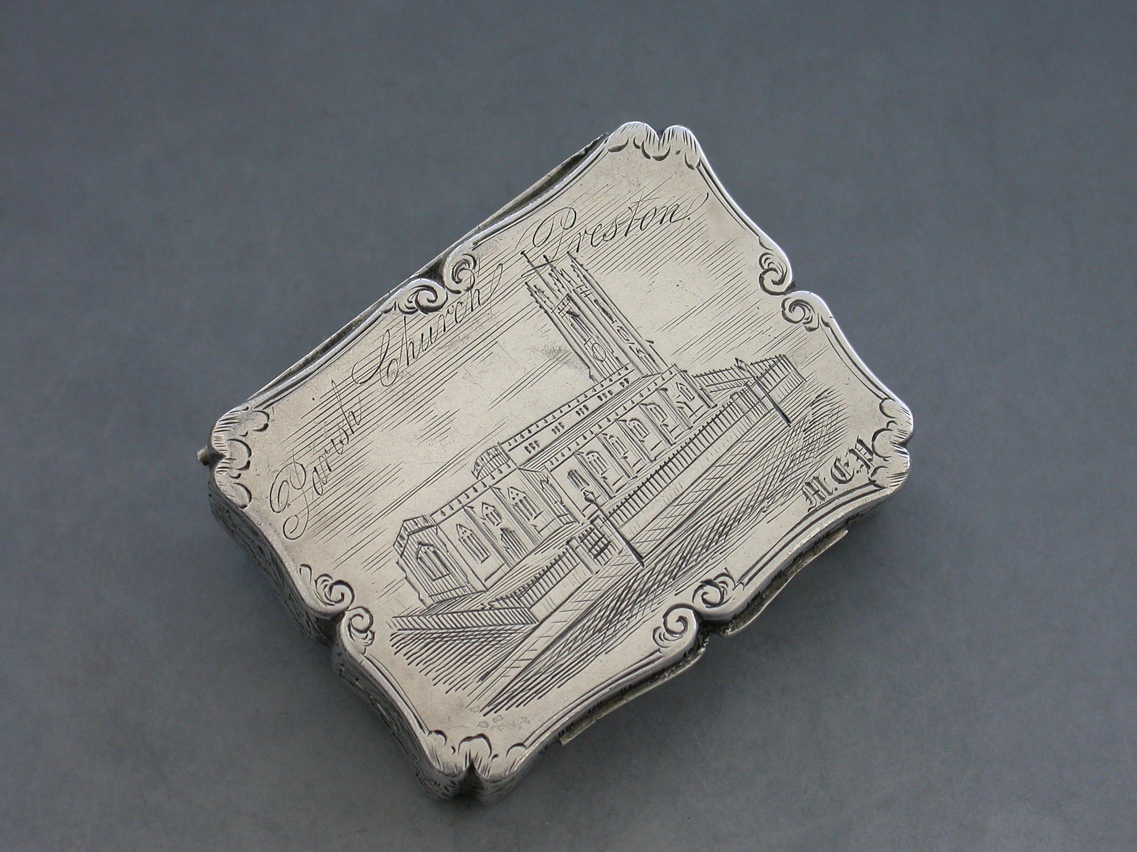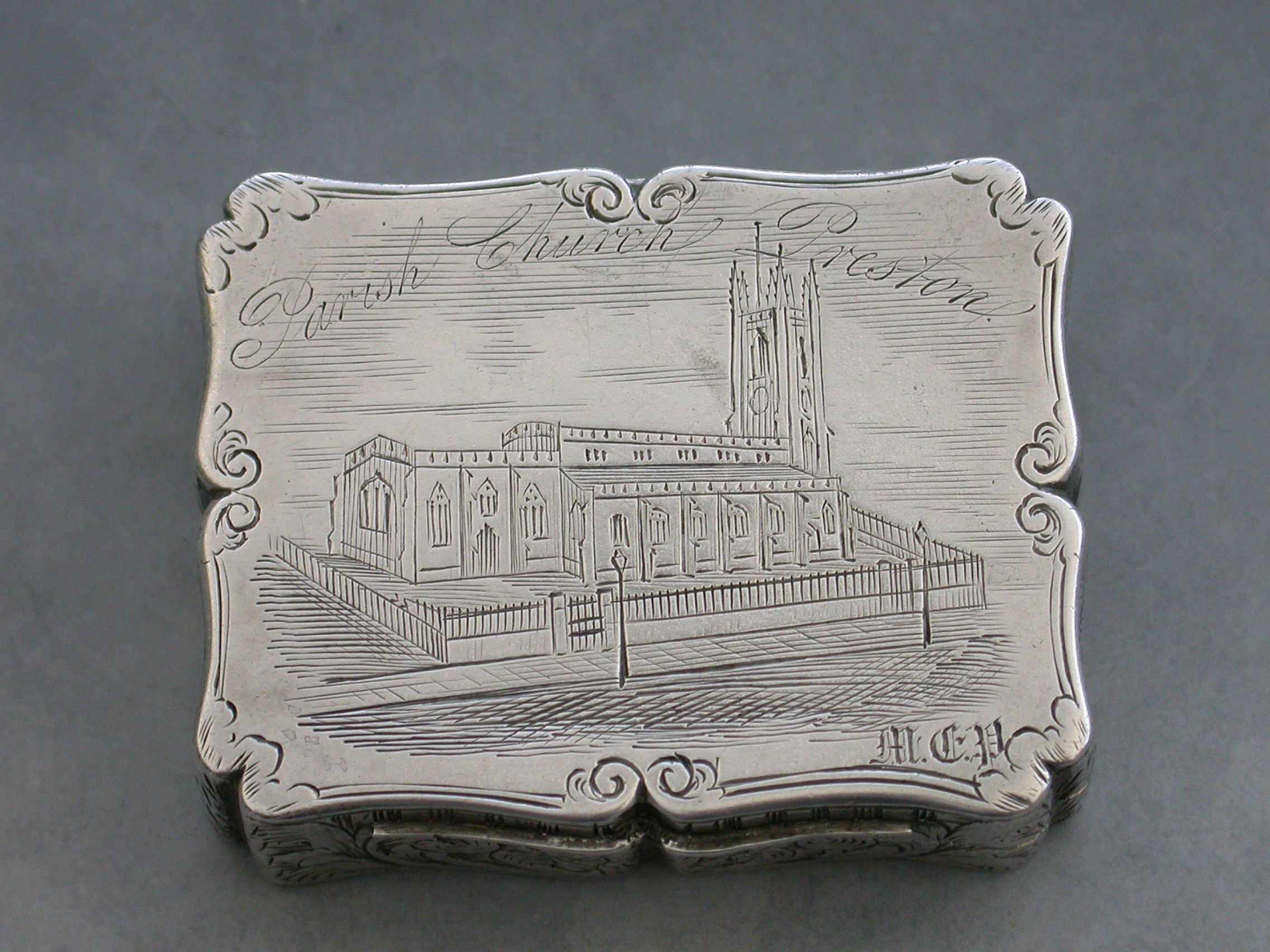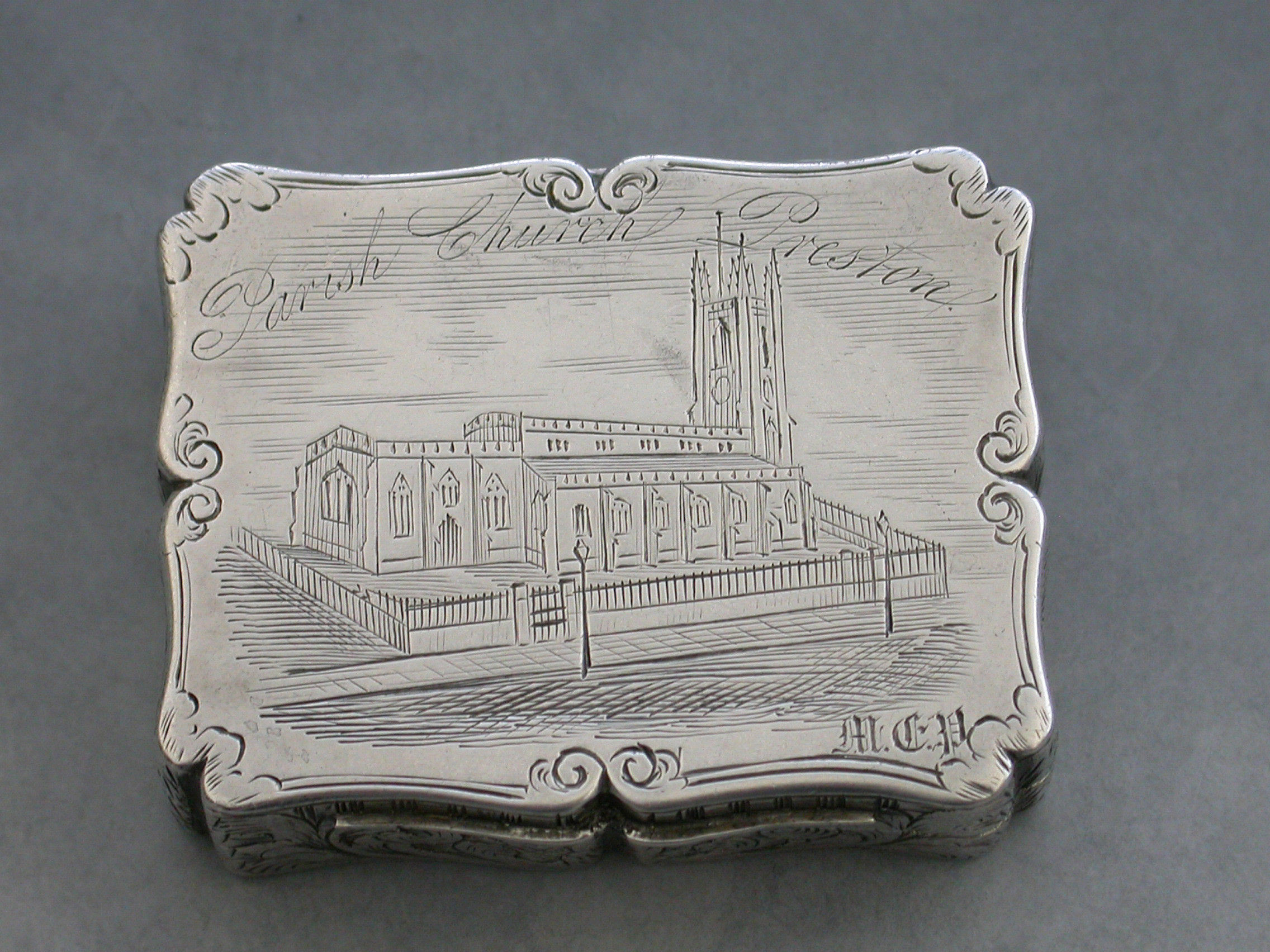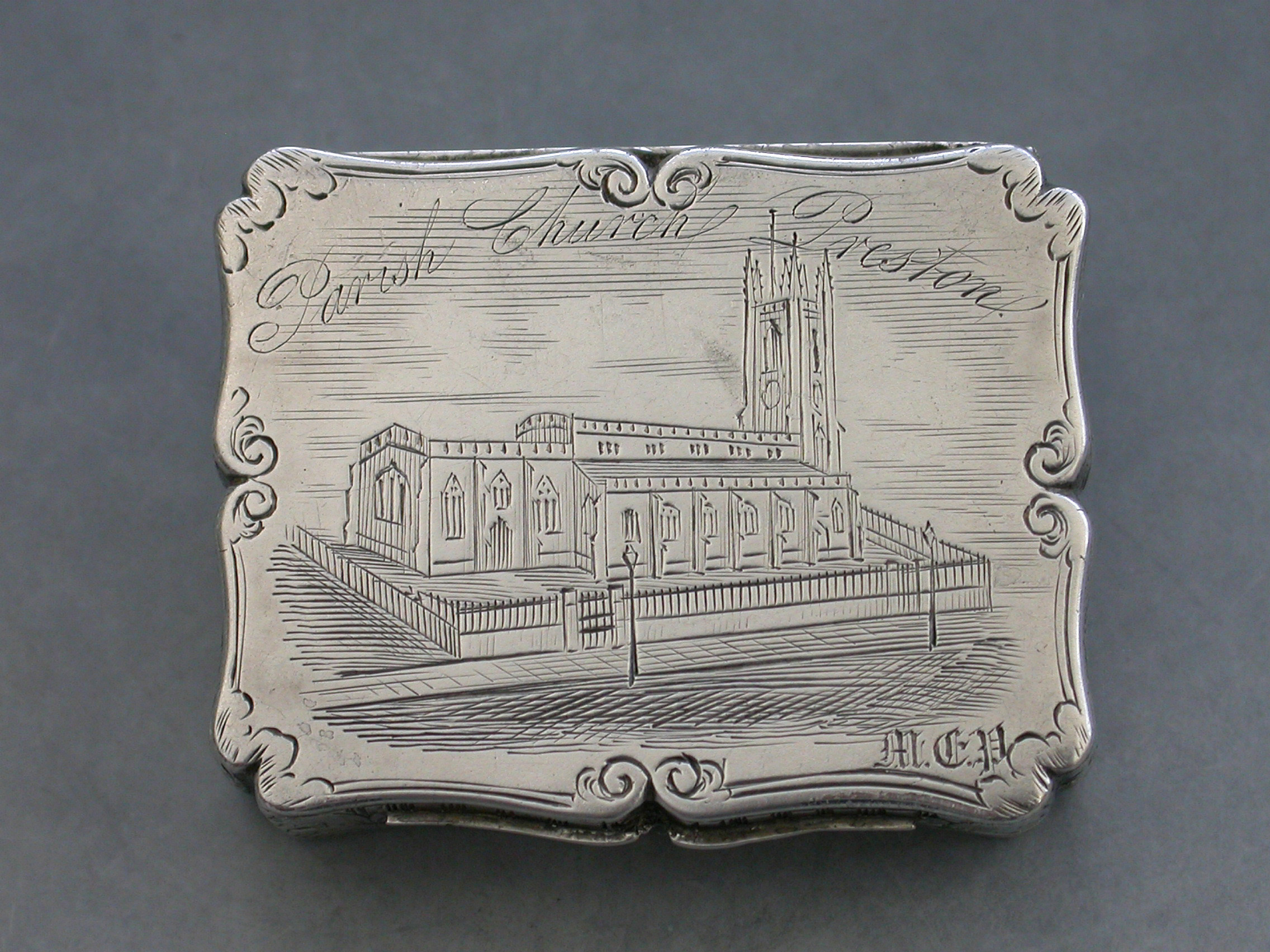 An extremely rare Victorian silver Vinaigrette of shaped rectangular form, the base and sides engraved with foliate scroll decoration, the lid engraved with a scene depicting St Johns Parish Church, Preston, with the legend ""Parish Church Preston"" engraved above the scene and the initials 'MCP' to the bottom right hand corner. The silver gilt interior with an intricately pierced grille opening from front to back and centred by a flower head.