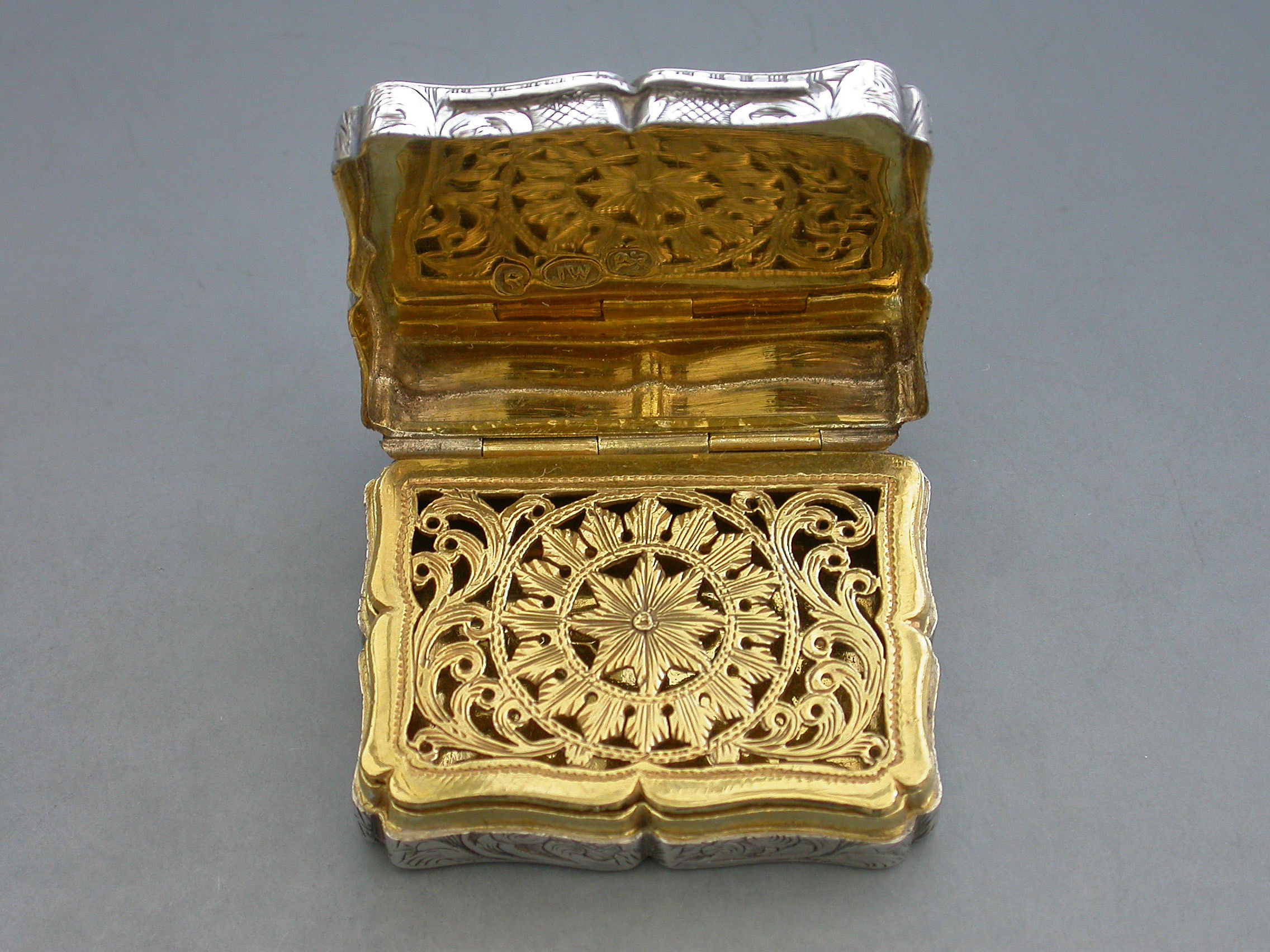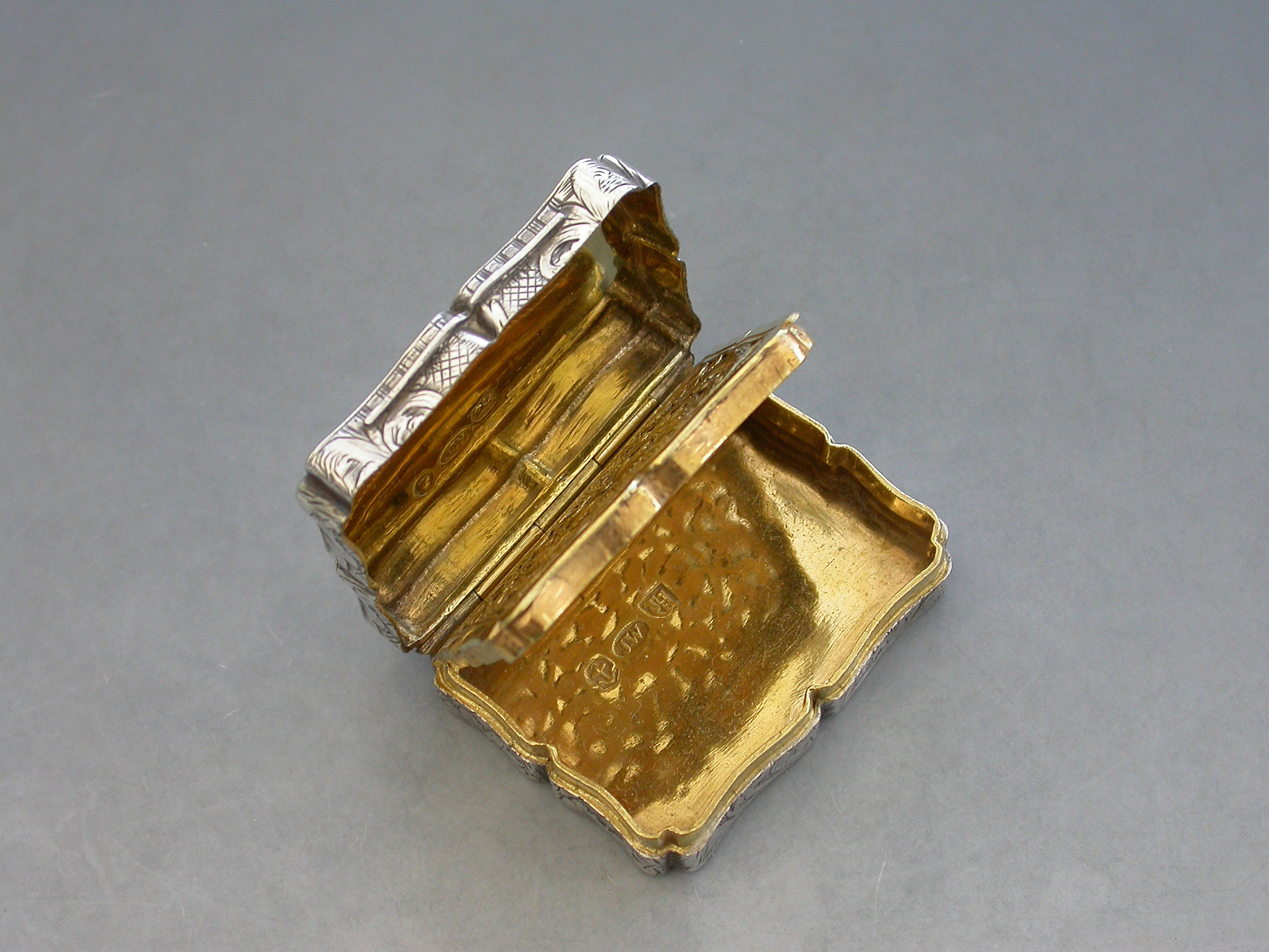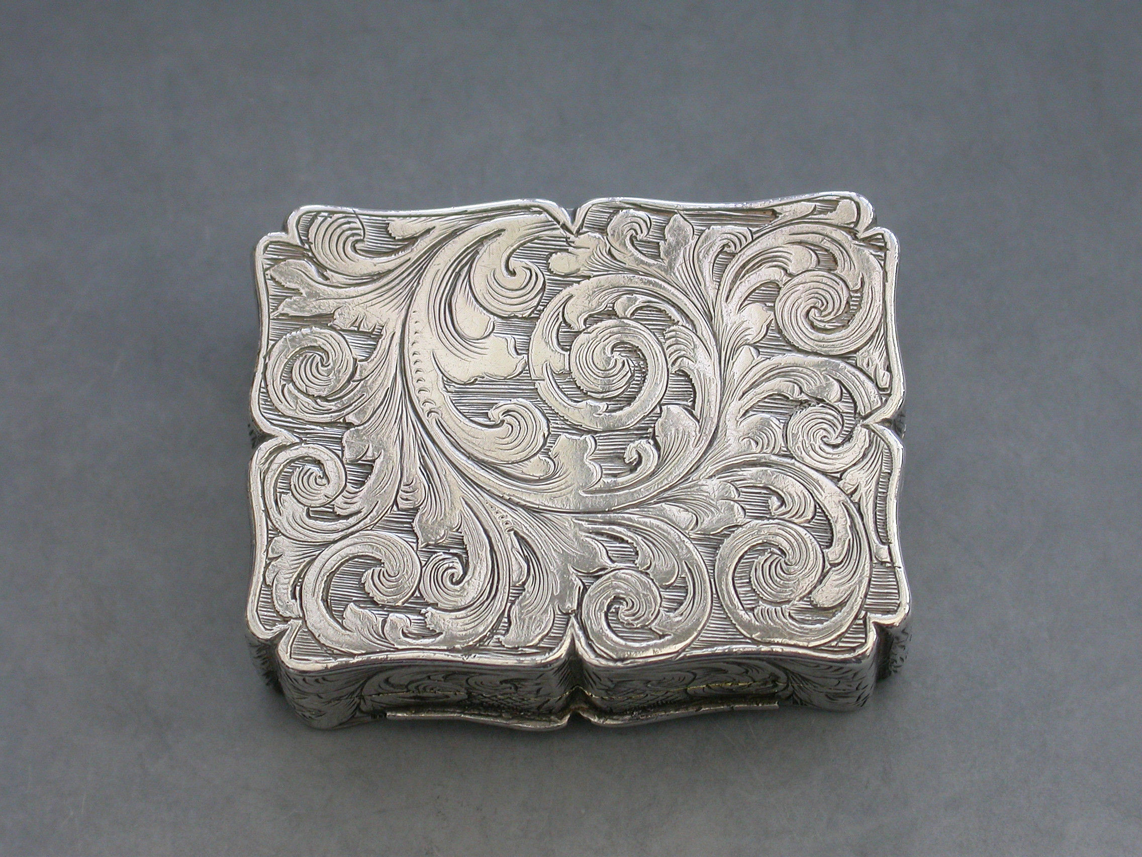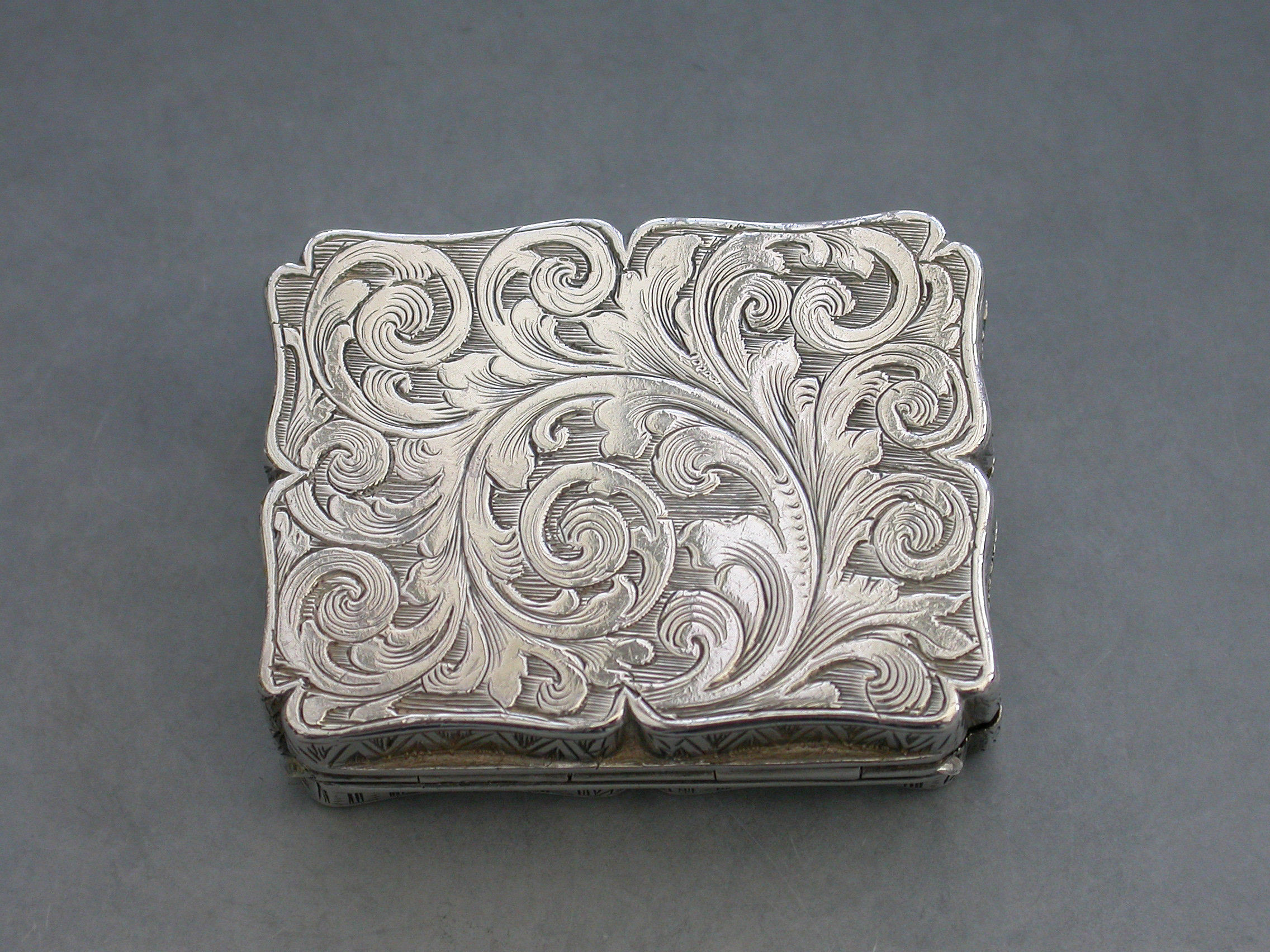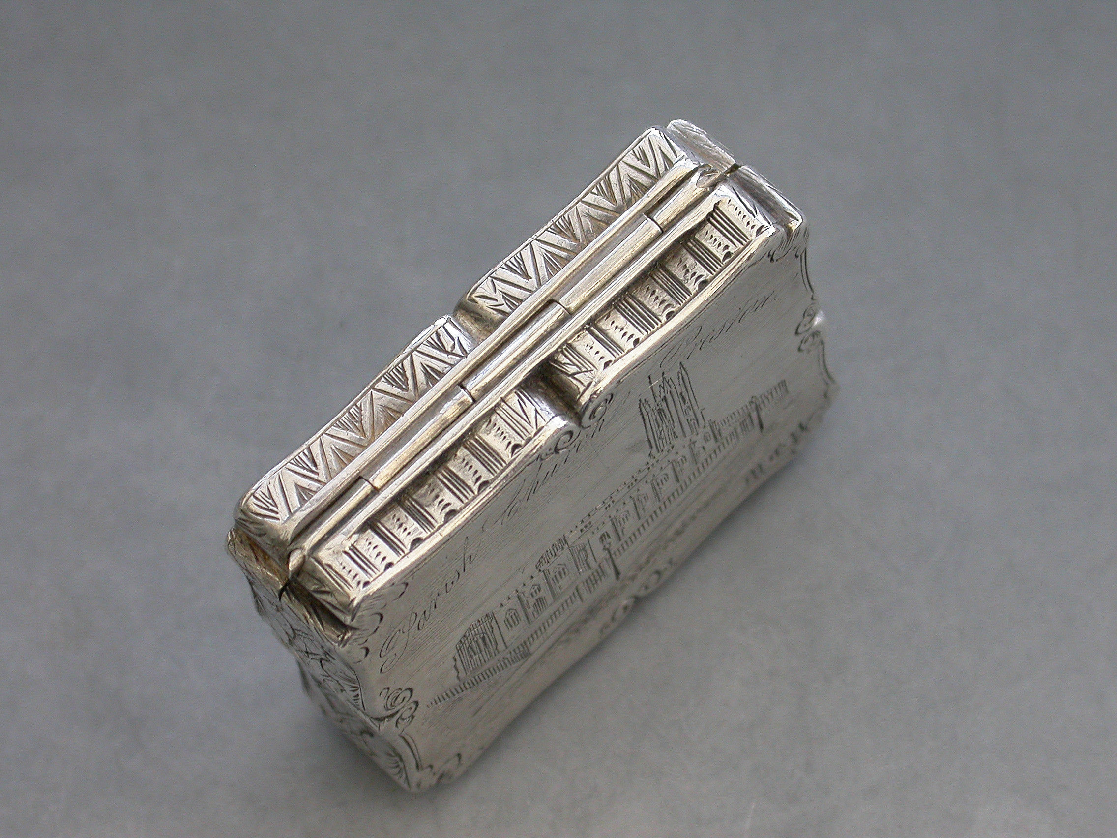 An extremely rare Victorian silver Vinaigrette of shaped rectangular form, the base and sides engraved with foliate scroll decoration, the lid engraved with a scene depicting St Johns Parish Church, Preston, with the legend ""Parish Church Preston"" engraved above the scene and the initials 'MCP' to the bottom right hand corner. The silver gilt interior with an intricately pierced grille opening from front to back and centred by a flower head.