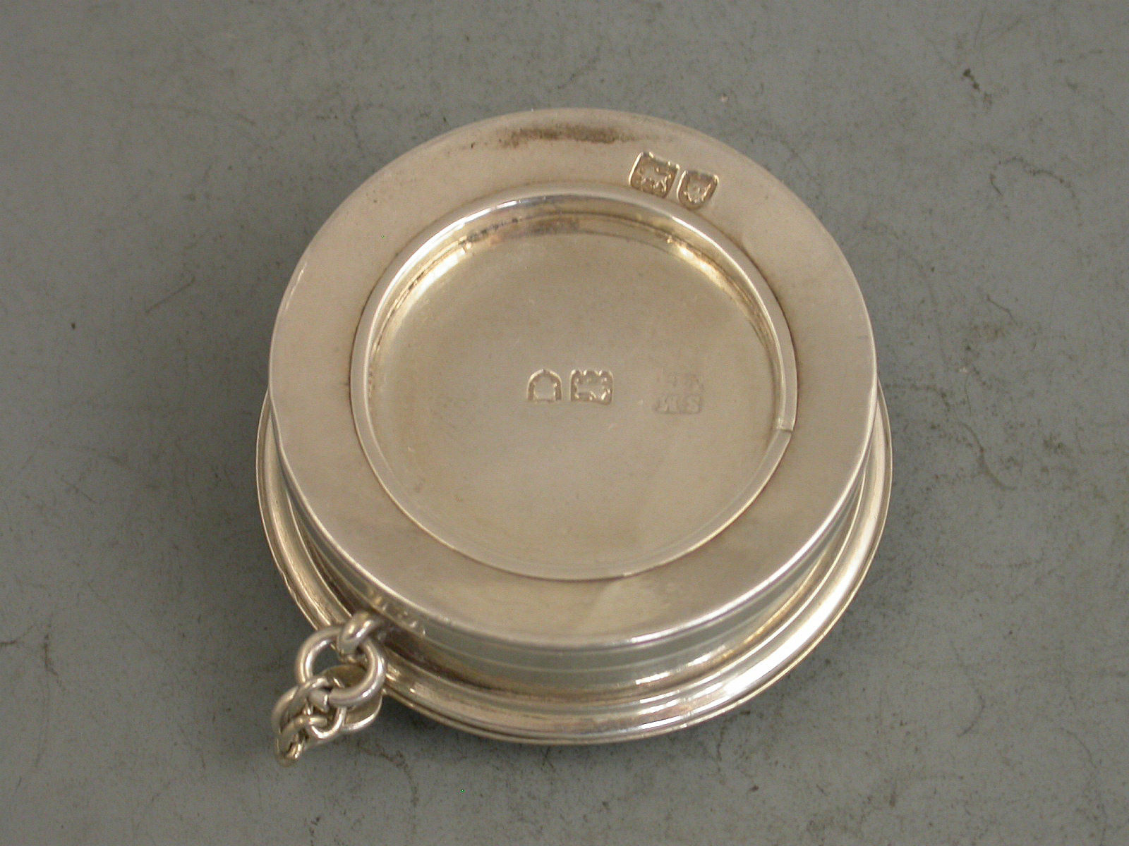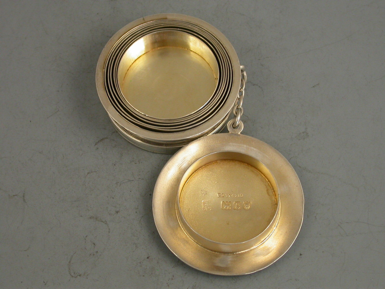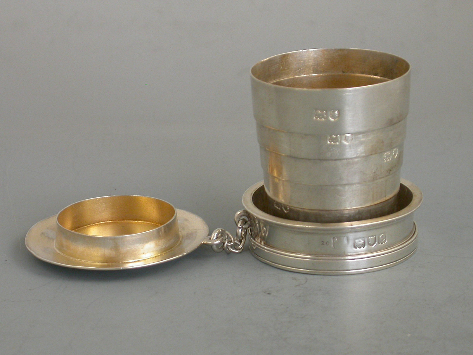 A fine quality late Victorian silver Traveling Collapsible Beaker and Cover, made up from six graduated internal circular sections (all hallmarked) which are pulled up to form the beaker. Silver gilt interior and pull off circular lid attached to the base with a chain.