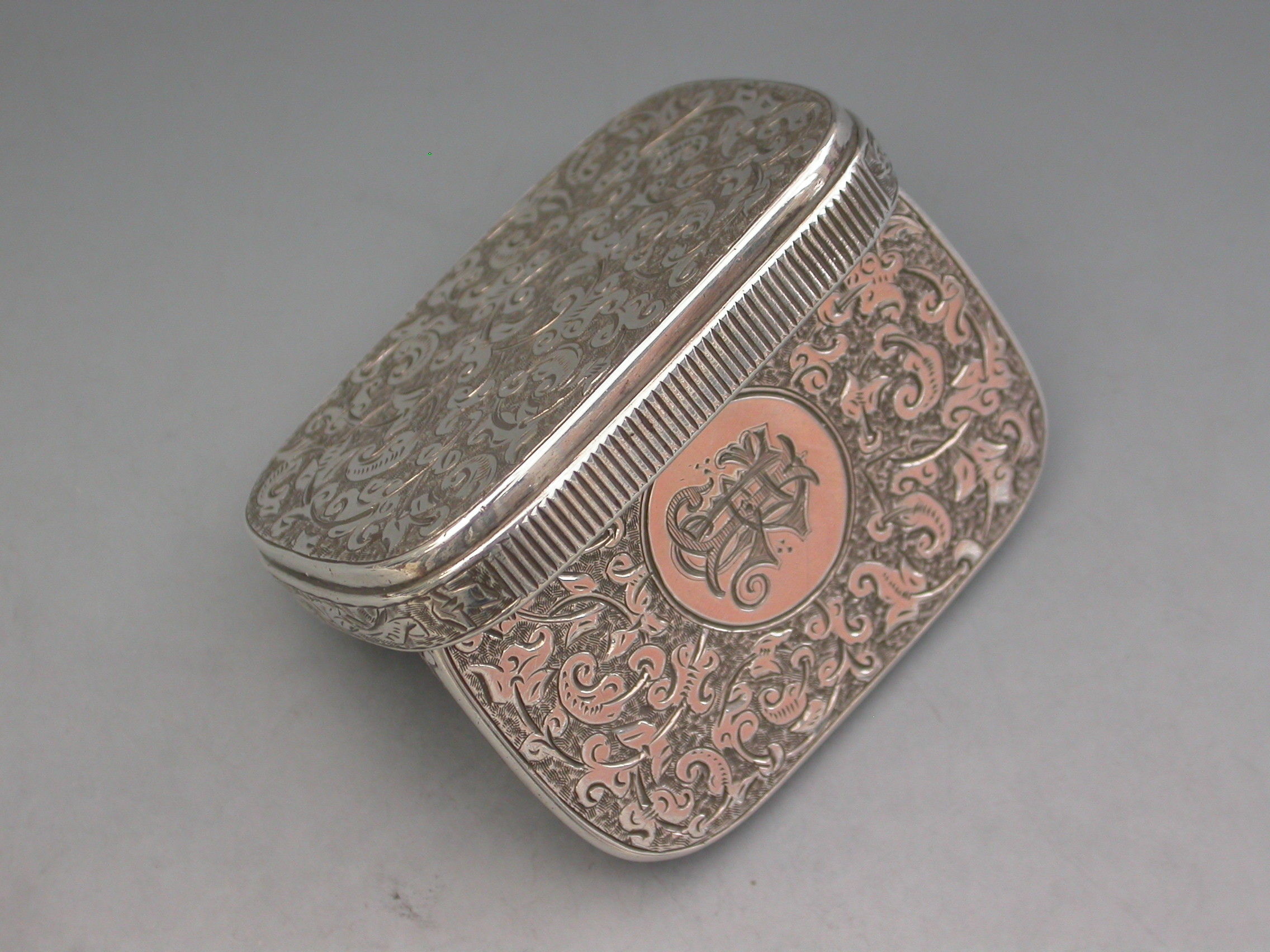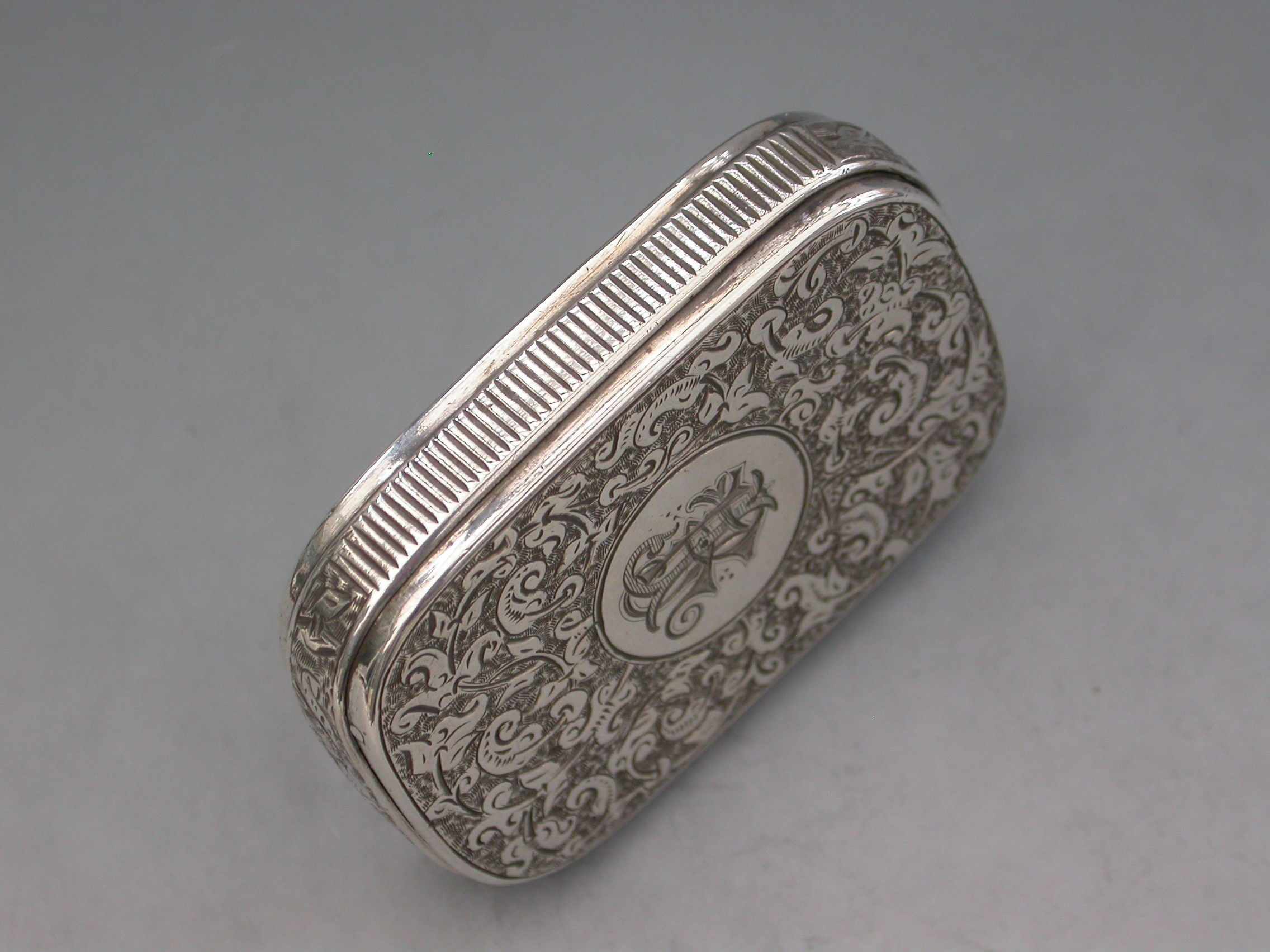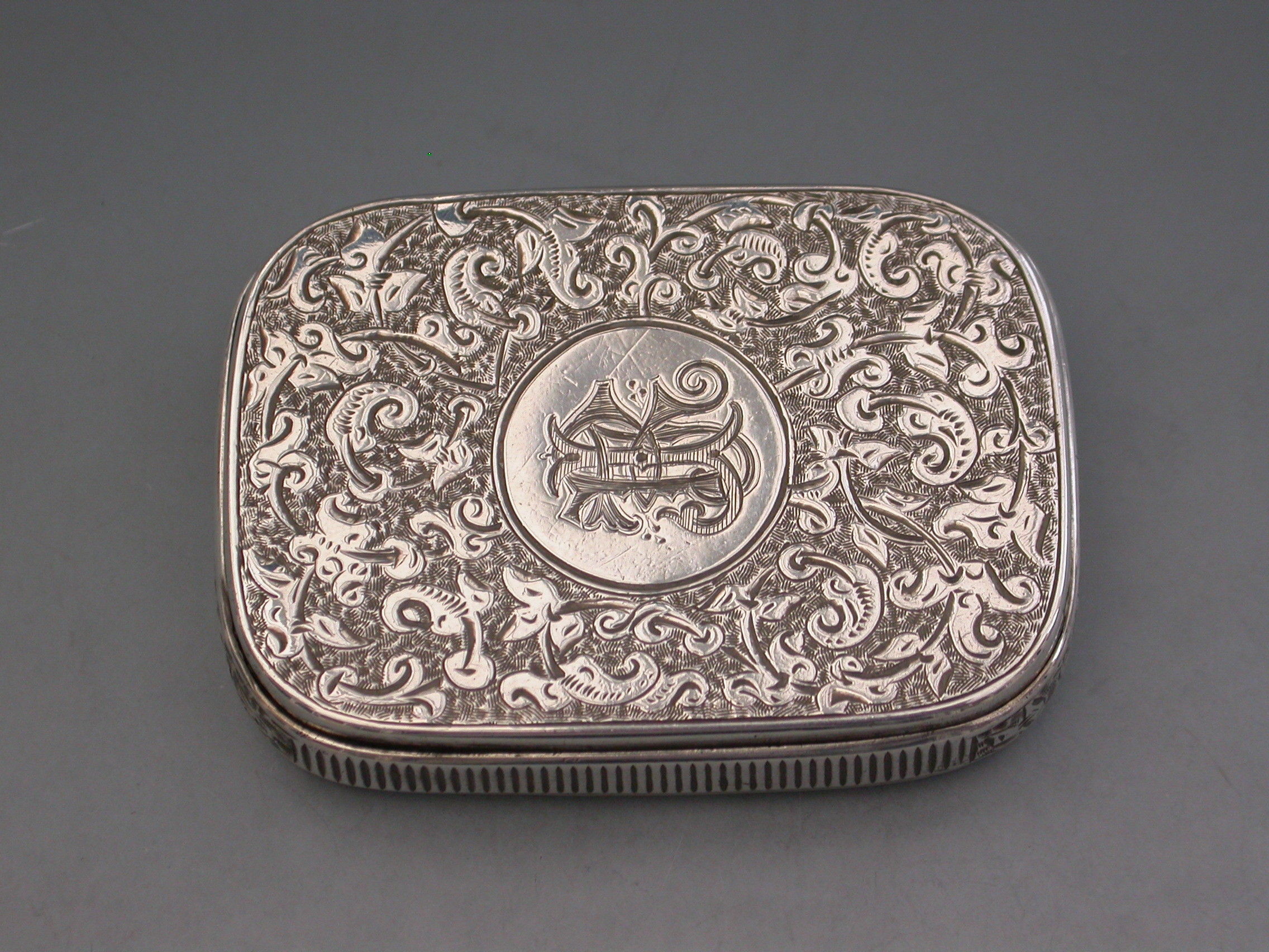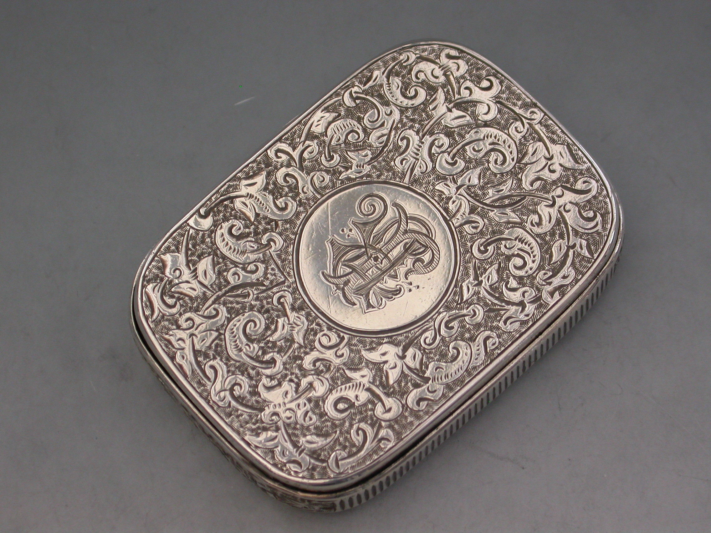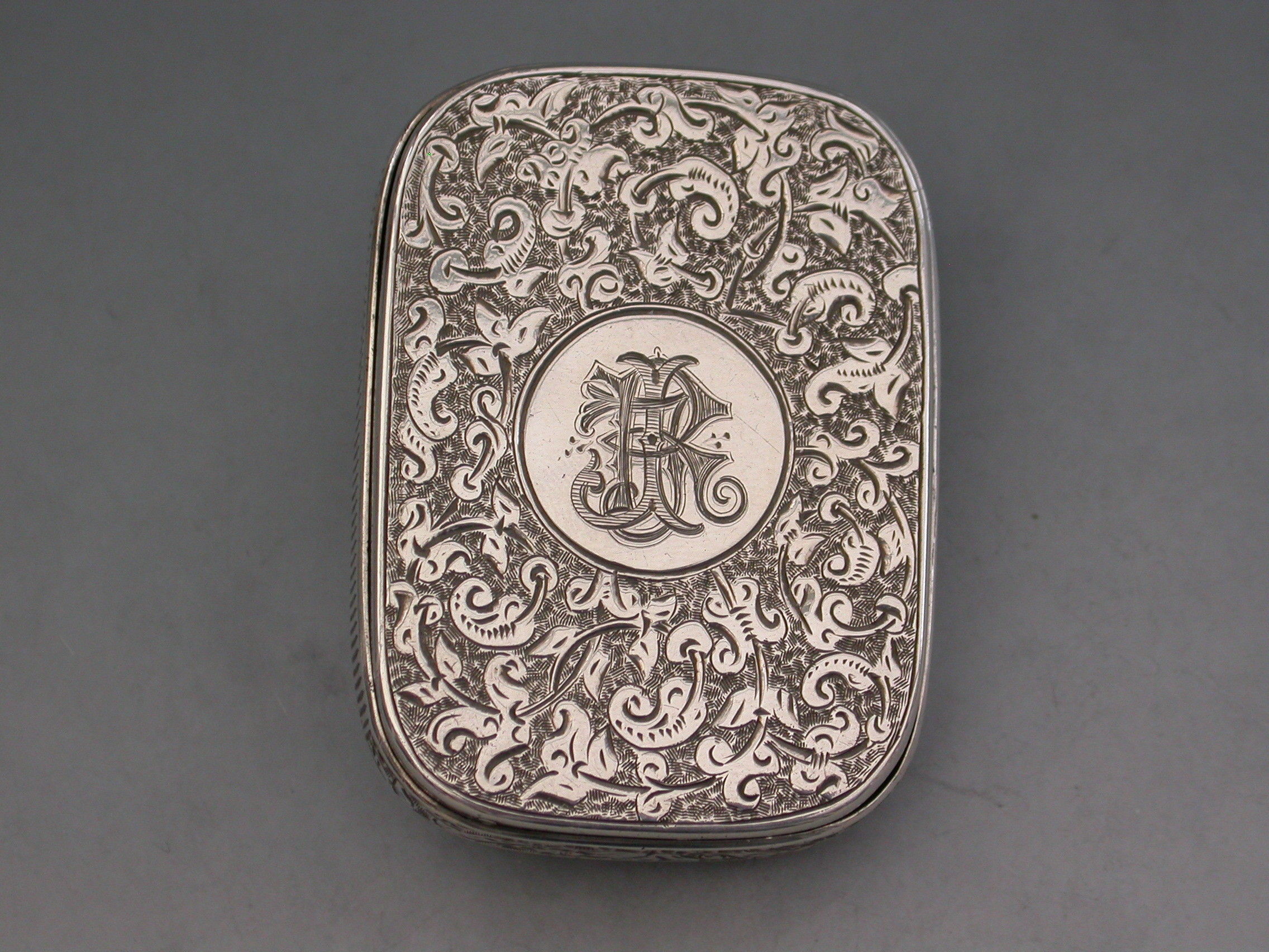 A good Victorian silver Vesta Case of rounded rectangular form surrounded by an applied band with engraved striker, the completely concealed hinge opens to reveal two gilded interior compartments, the whole with foliate scroll decoration, the lid with circular cartouche engraved with contemporary initials. The box opens ingeniously by applying light downward pressure behind the cartouche on the lid.