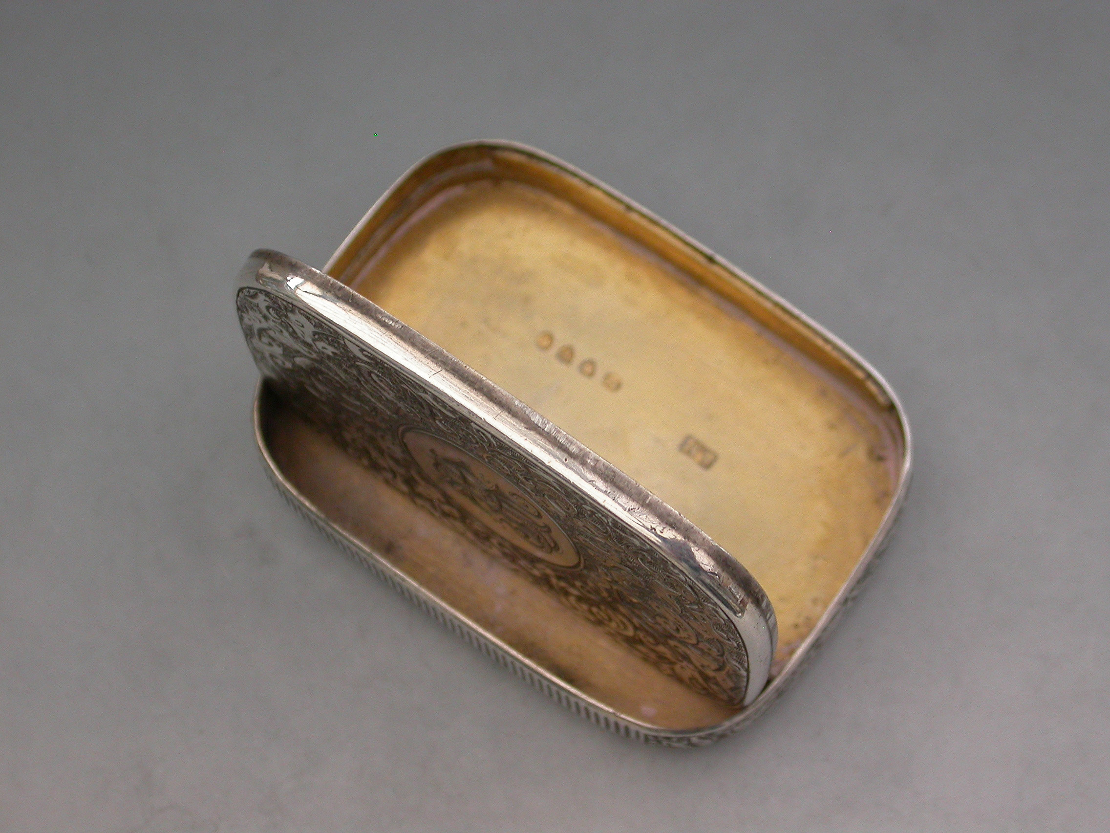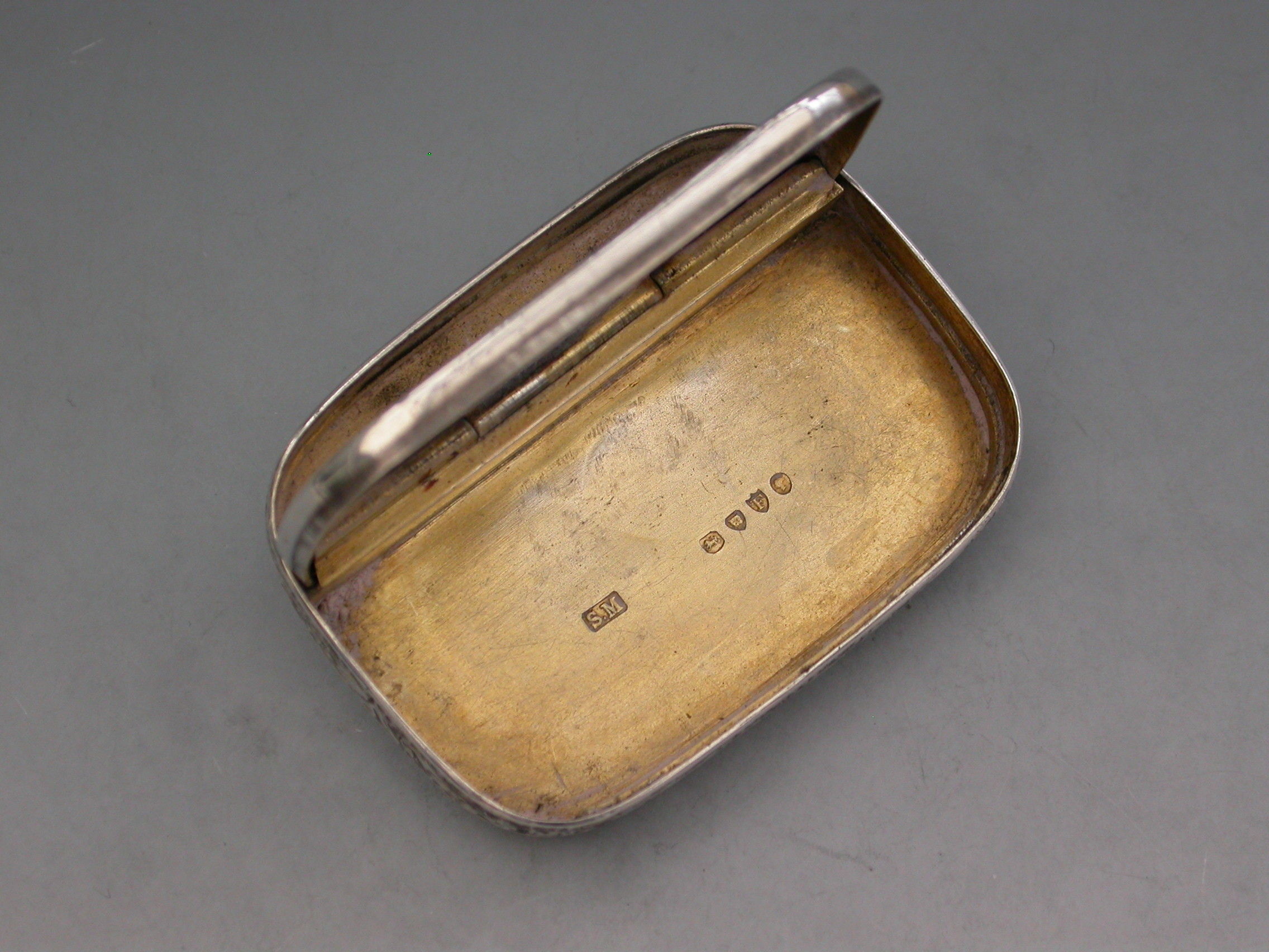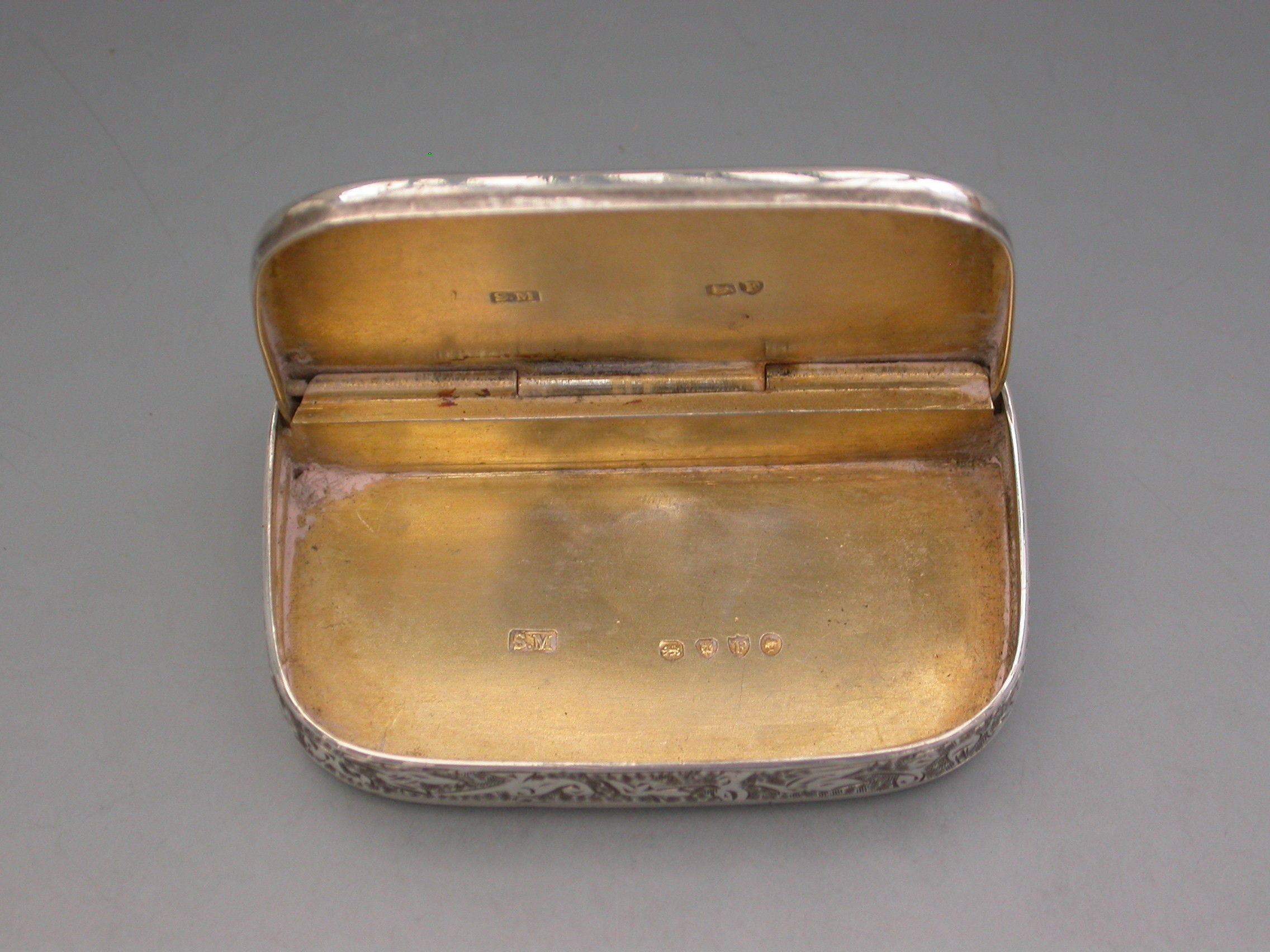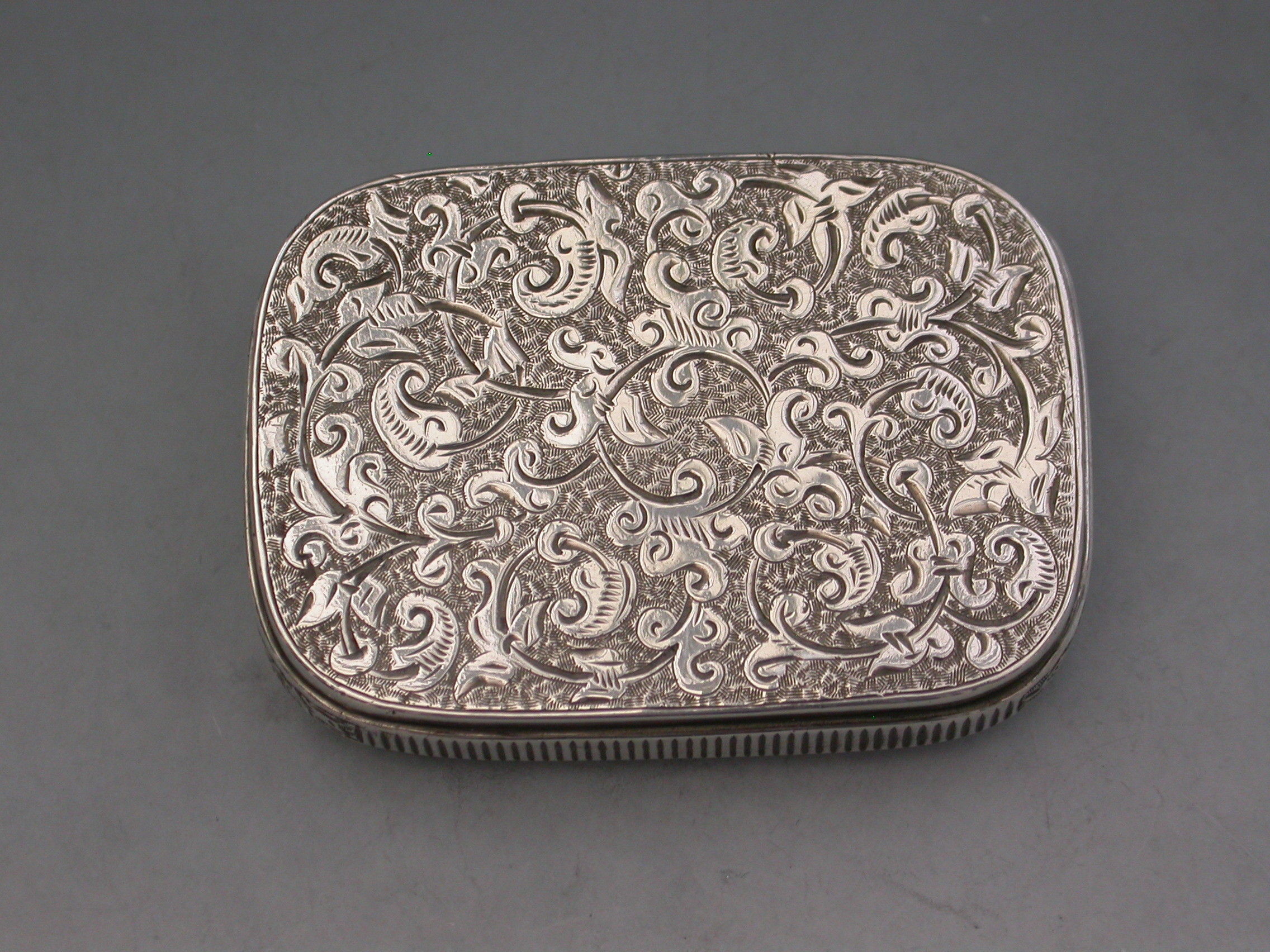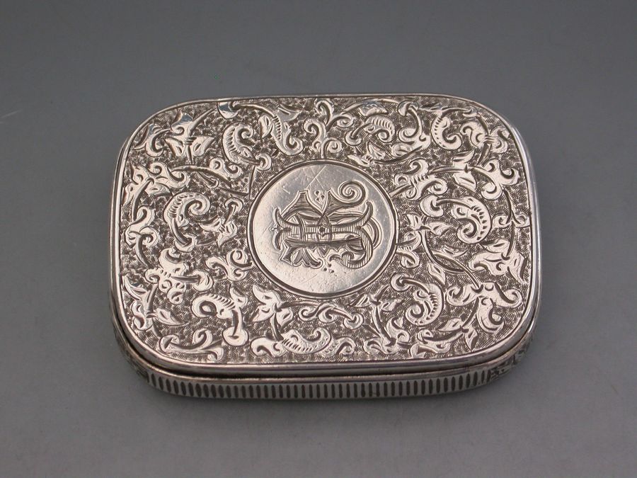 A good Victorian silver Vesta Case of rounded rectangular form surrounded by an applied band with engraved striker, the completely concealed hinge opens to reveal two gilded interior compartments, the whole with foliate scroll decoration, the lid with circular cartouche engraved with contemporary initials. The box opens ingeniously by applying light downward pressure behind the cartouche on the lid.