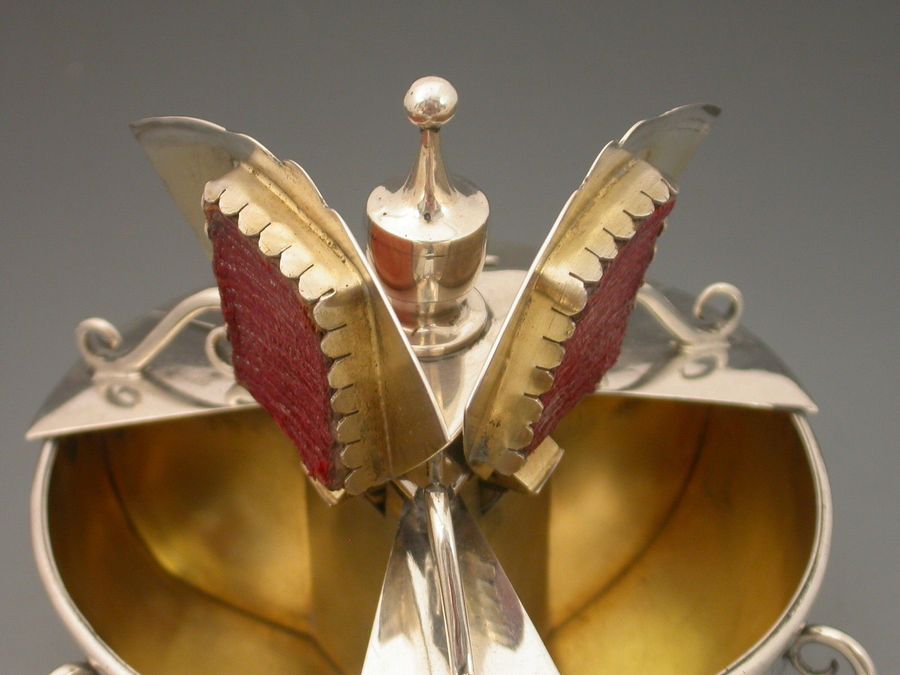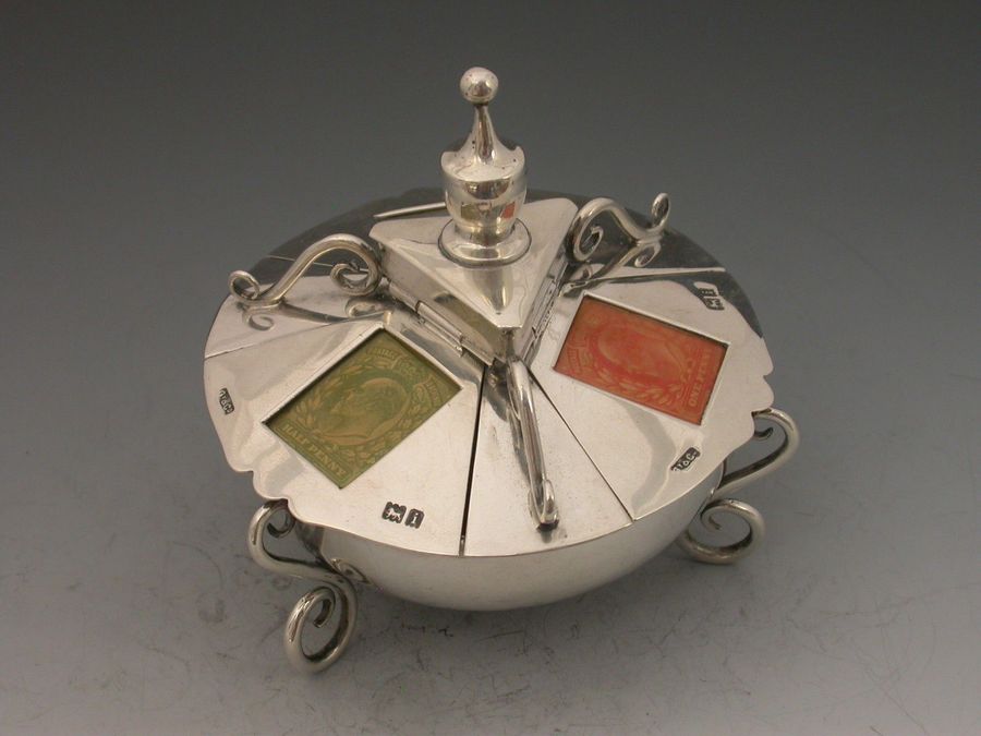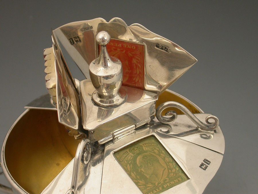 An extremely rare Victorian large silver triple Stamp Box of shaped circular form with urn finial and three sprung lids with glass apertures concealing stamps divided by wire work scrolls, the dished base on three scroll feet, silver gilt interior.