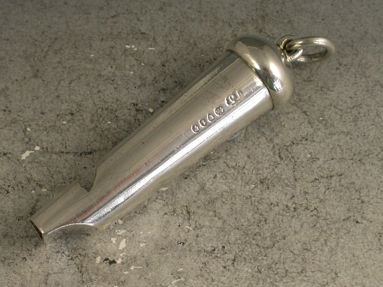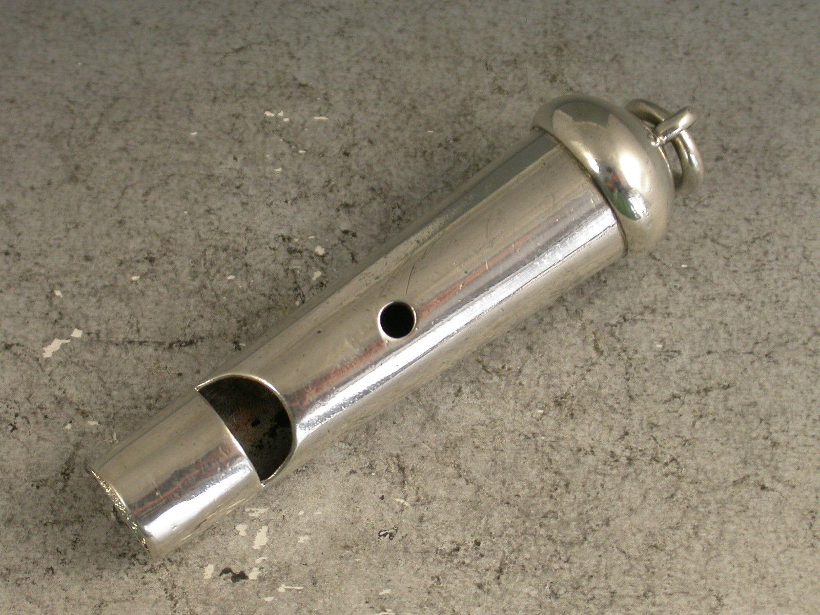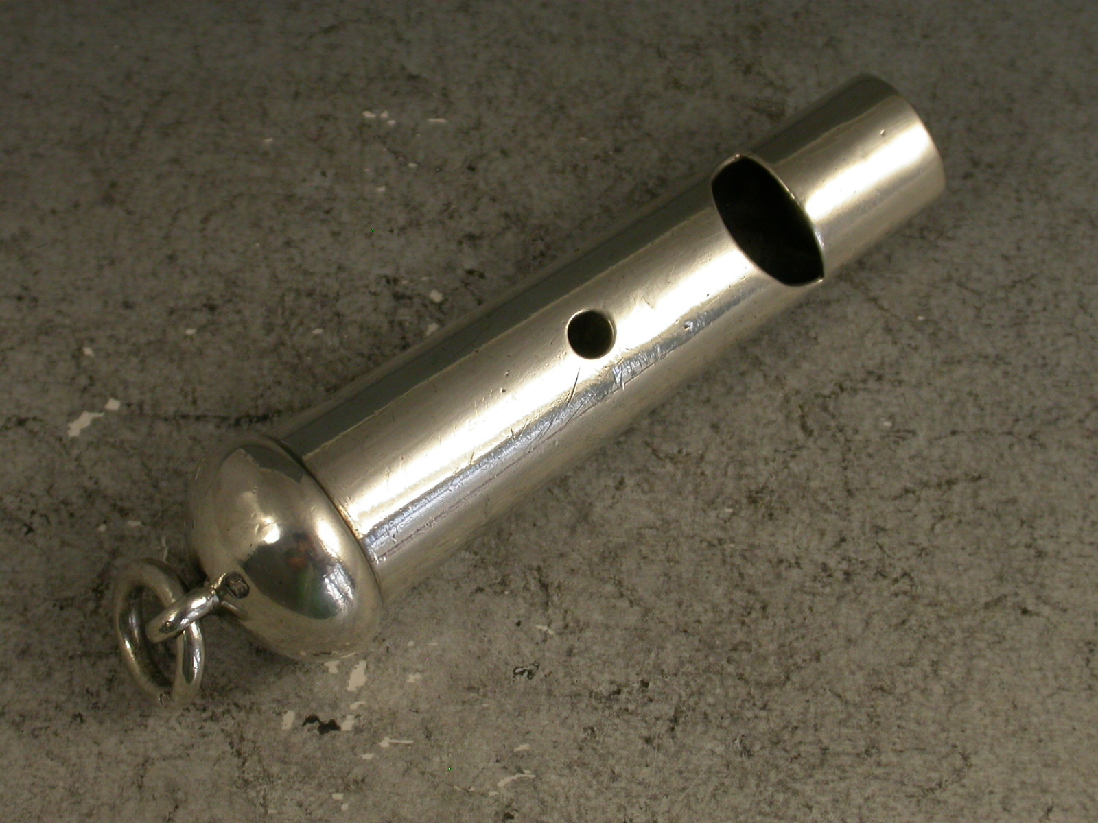 A good quality Victorian silver Whistle of plain tapering cylindrical form with domed top and attached suspension ring, a pierced secondary hole to create a two-tone effect when covered.