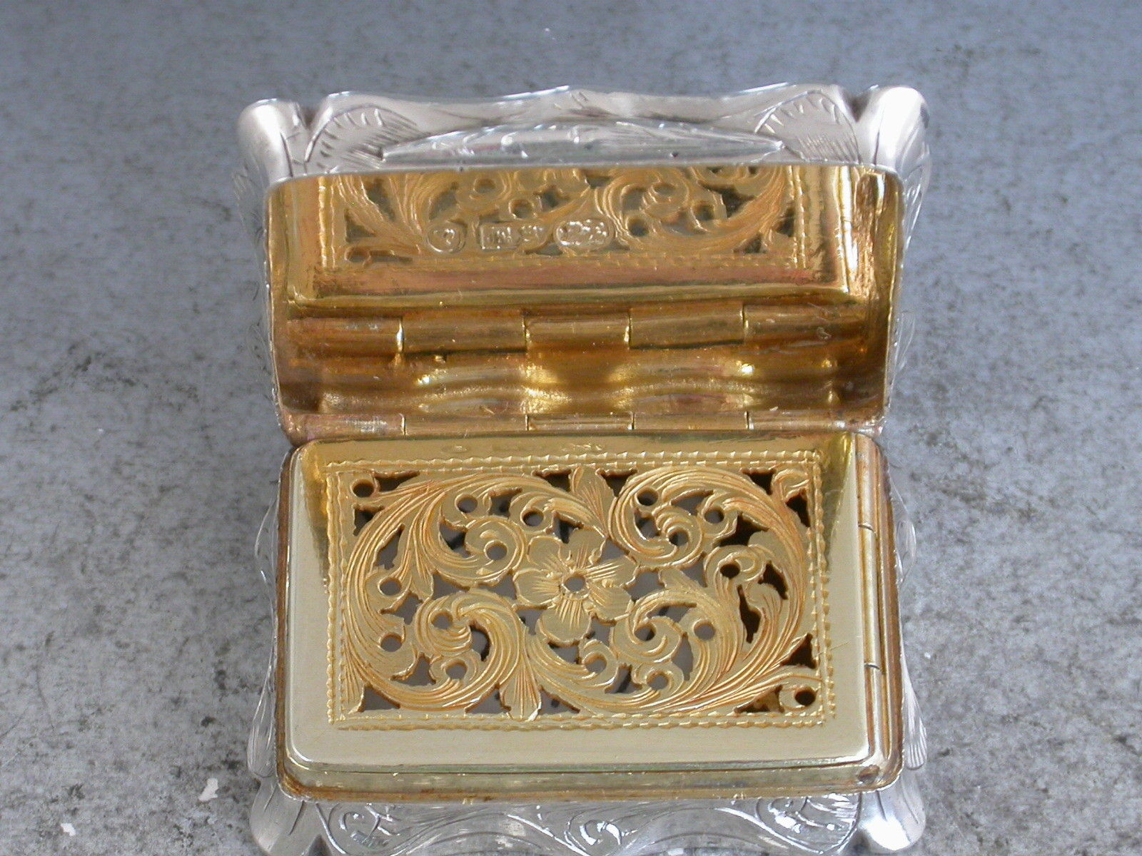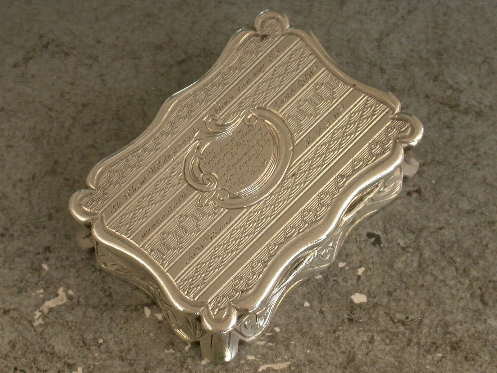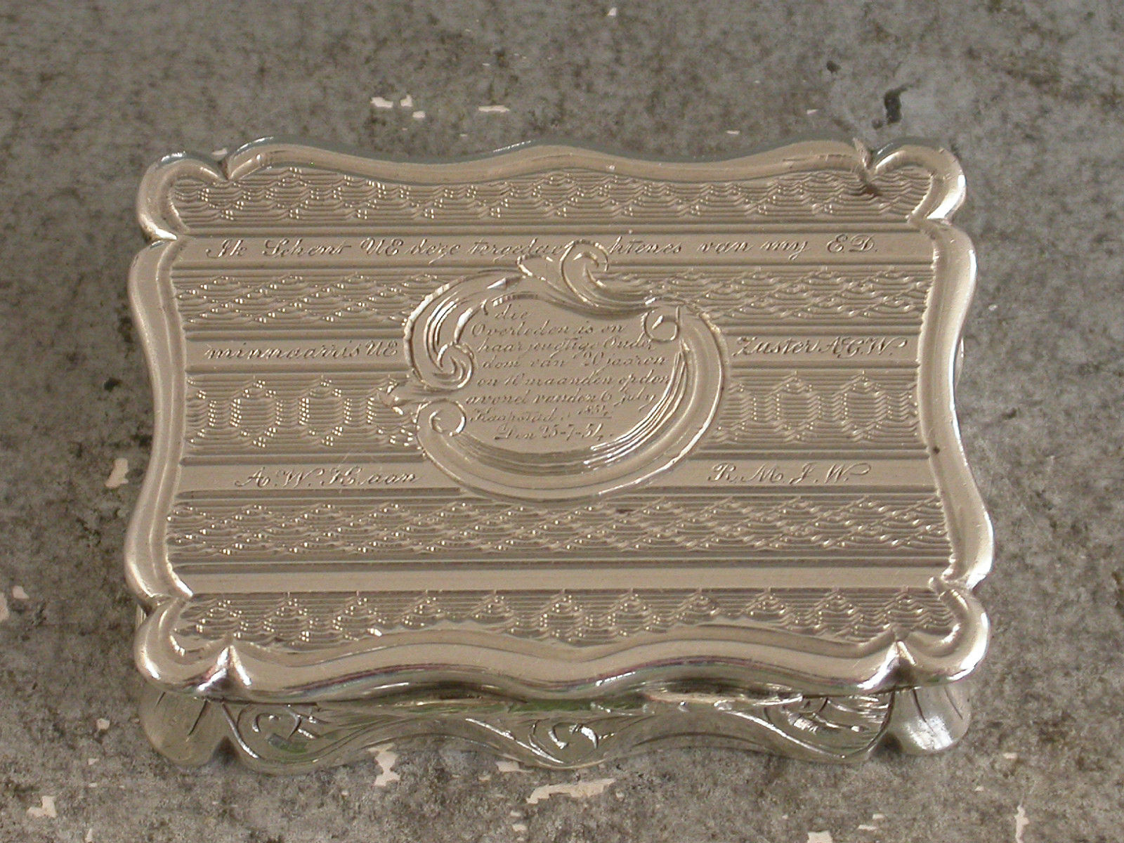 A very unusual Victorian silver Vinaigrette of shaped rectangular form with crisp engine turned decoration in bands to the base and lid, foliate scroll decoration to the sides. The silver gilt interior with an intricately pierced foliate scroll grille, an asymmetrical cartouche to the lid engraved with a legend in Afrikaans and further inscriptions to the bands of the lid either side of the cartouche.