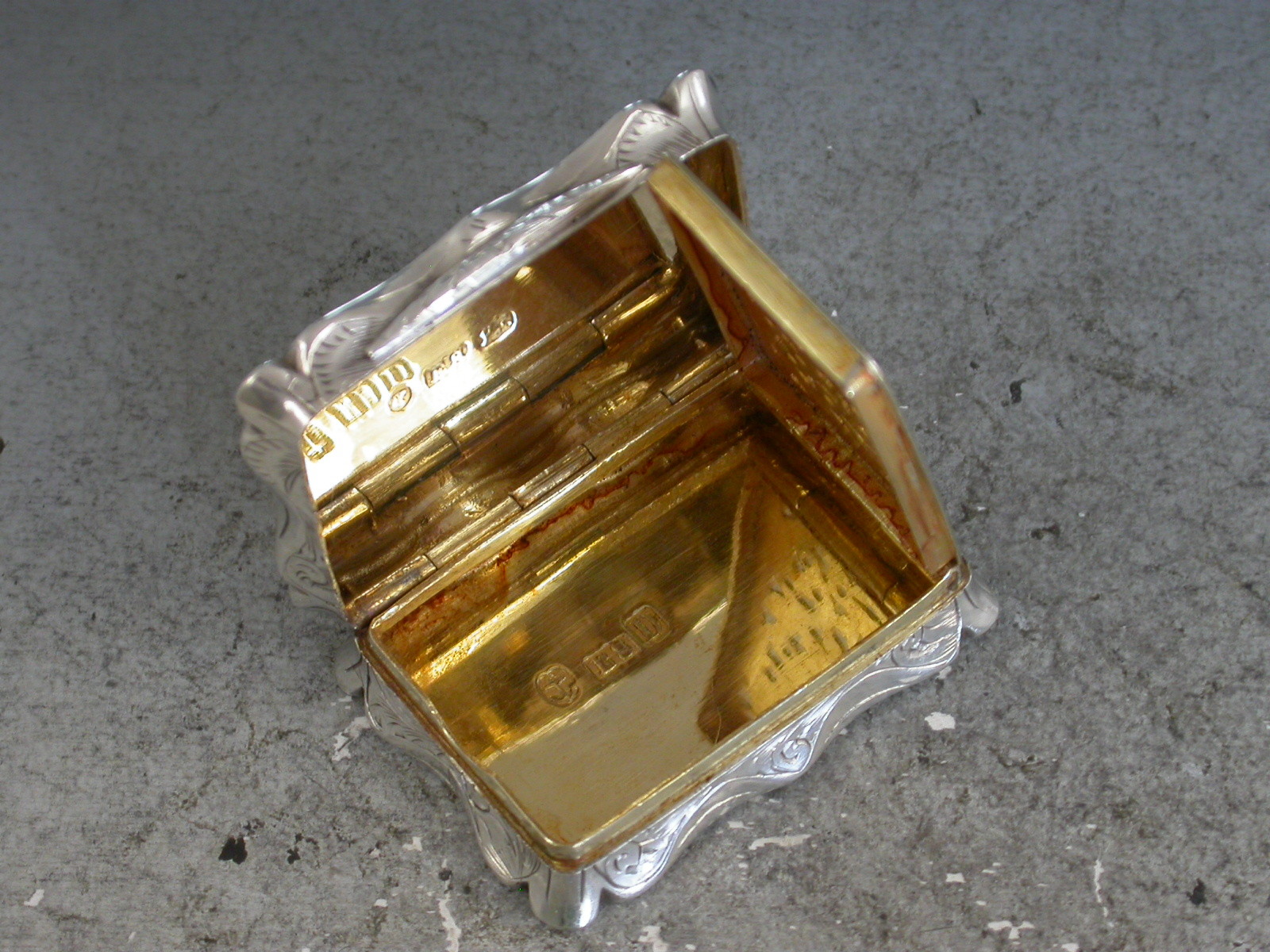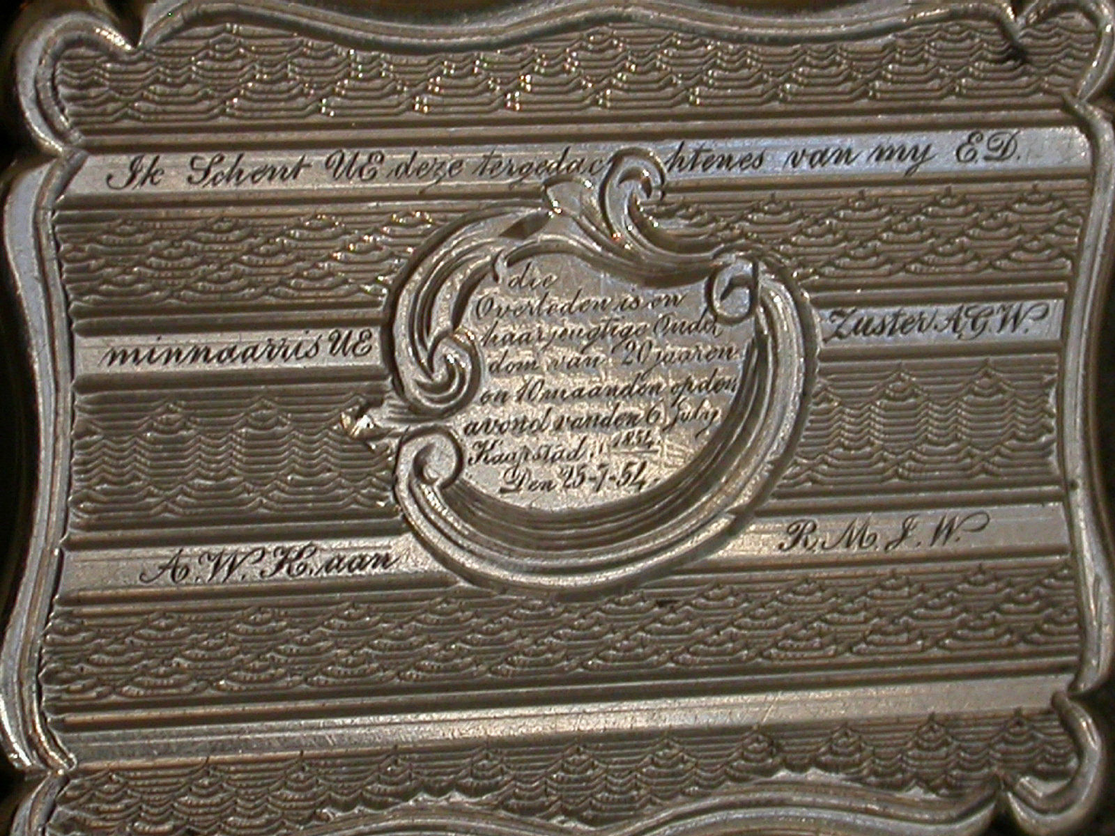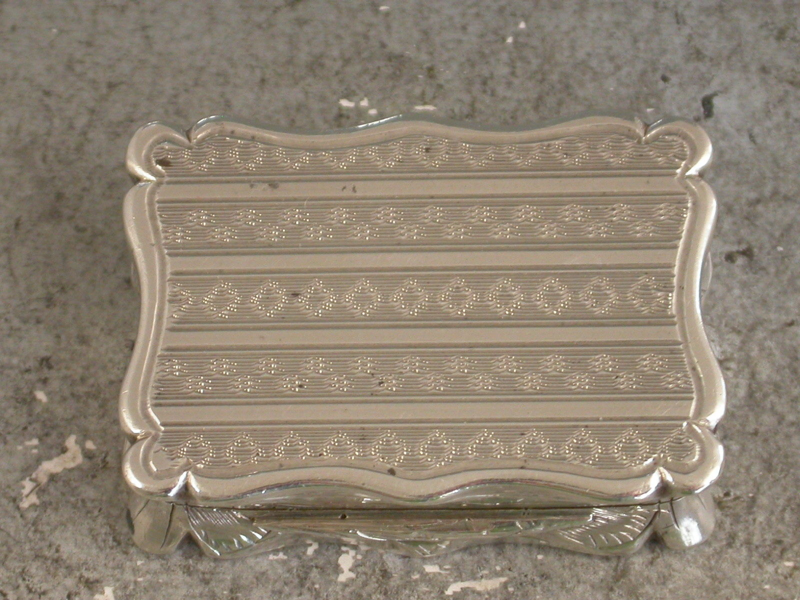 A very unusual Victorian silver Vinaigrette of shaped rectangular form with crisp engine turned decoration in bands to the base and lid, foliate scroll decoration to the sides. The silver gilt interior with an intricately pierced foliate scroll grille, an asymmetrical cartouche to the lid engraved with a legend in Afrikaans and further inscriptions to the bands of the lid either side of the cartouche.