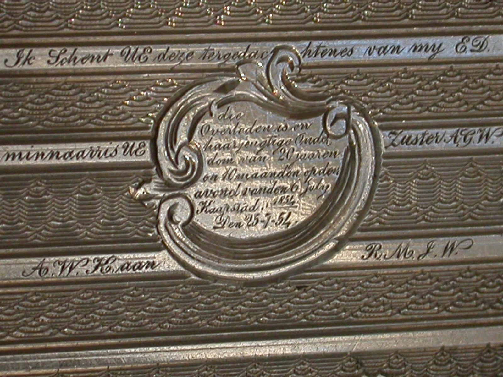 This roughly translates to:- ""I present/give you this in memory of my E.D. LOVER/HUSBAND my sister A.G.W.A.W.K.....TO R.M.J.W.