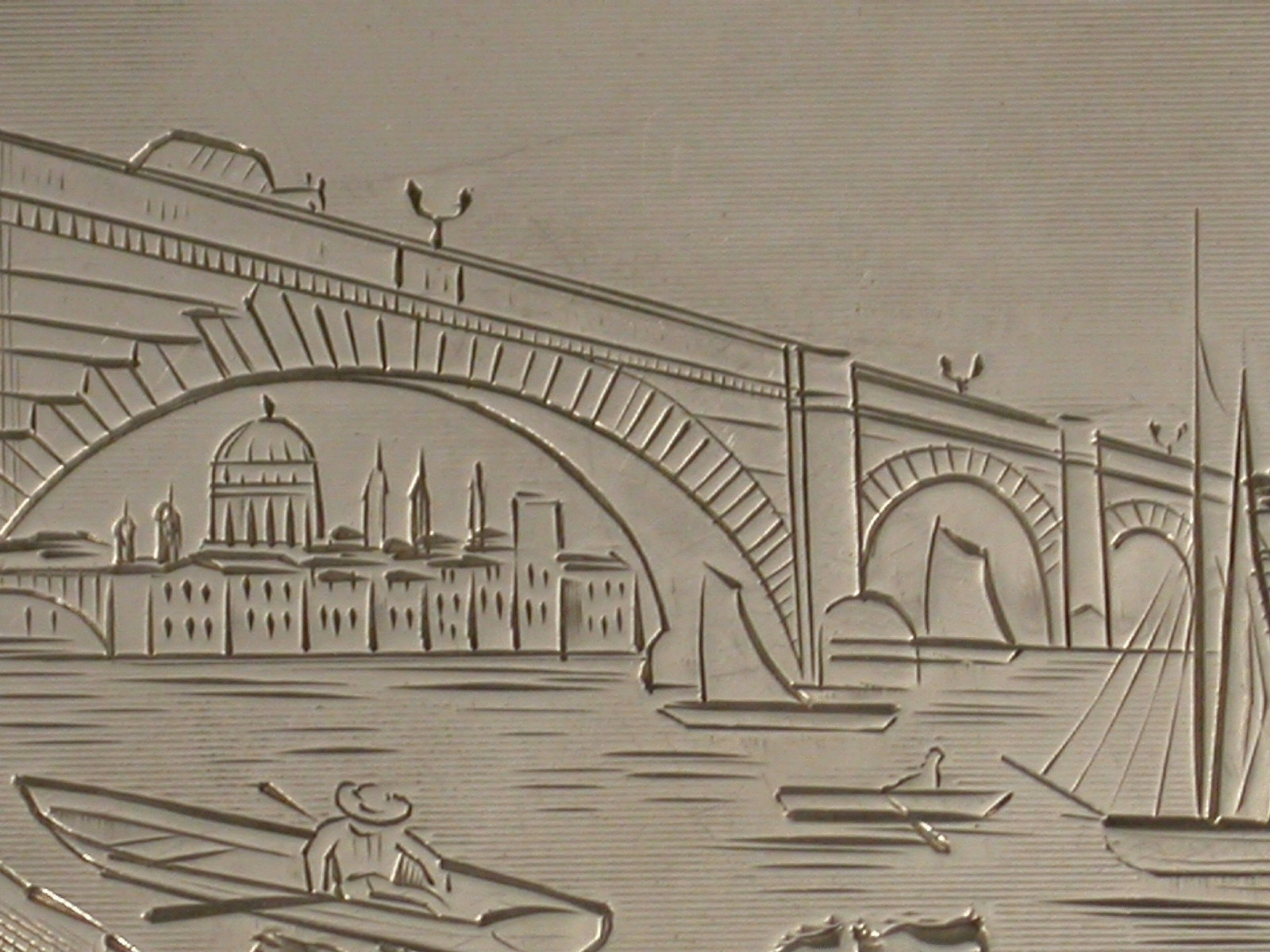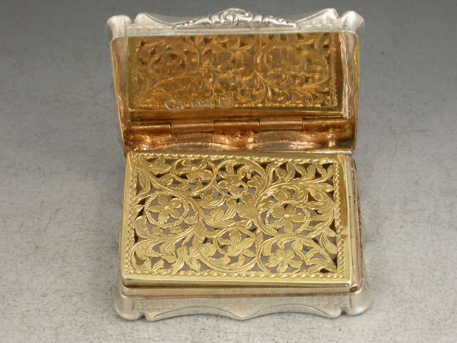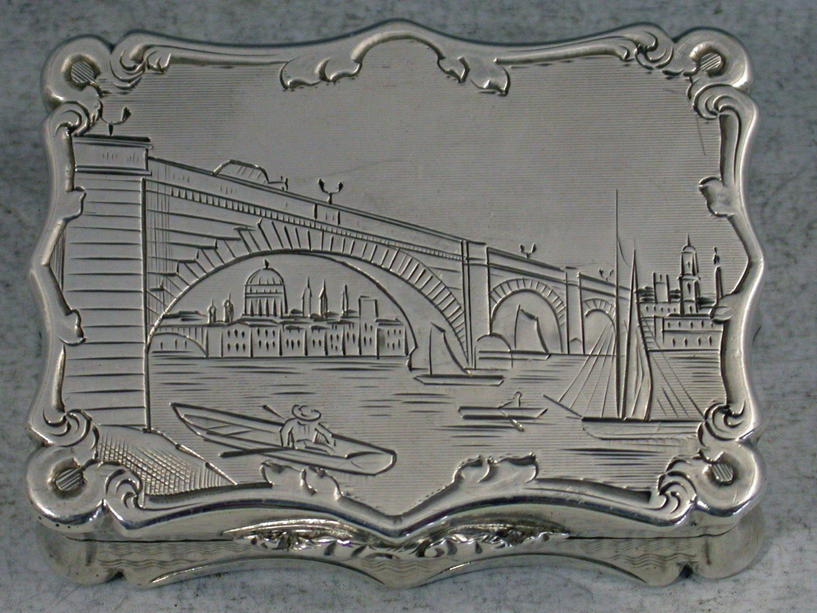 An extremely rare Victorian silver Vinaigrette of shaped rectangular form with engine turned decoration to the base and sides, the lid engraved with a scarce scene depicting London Bridge over the River Thames with St Paul's Cathedral in the background, the silver gilt interior with intricately pierced grille.