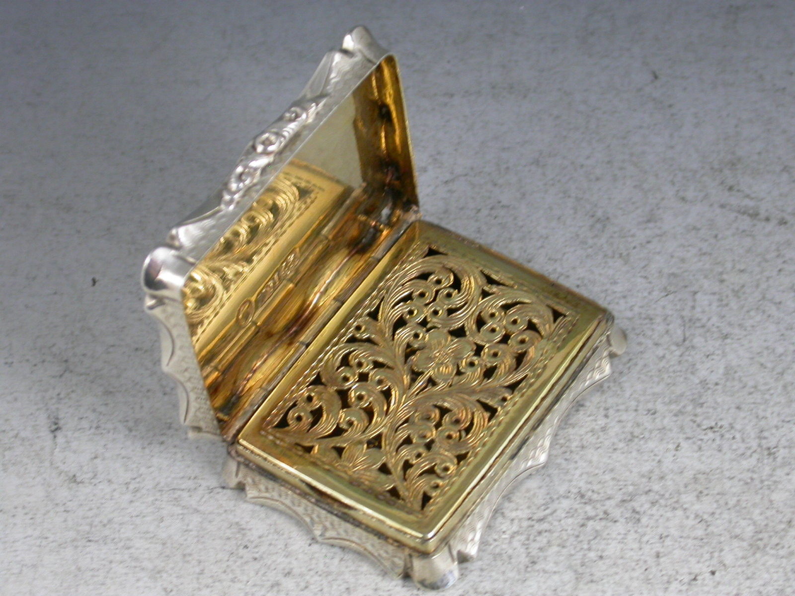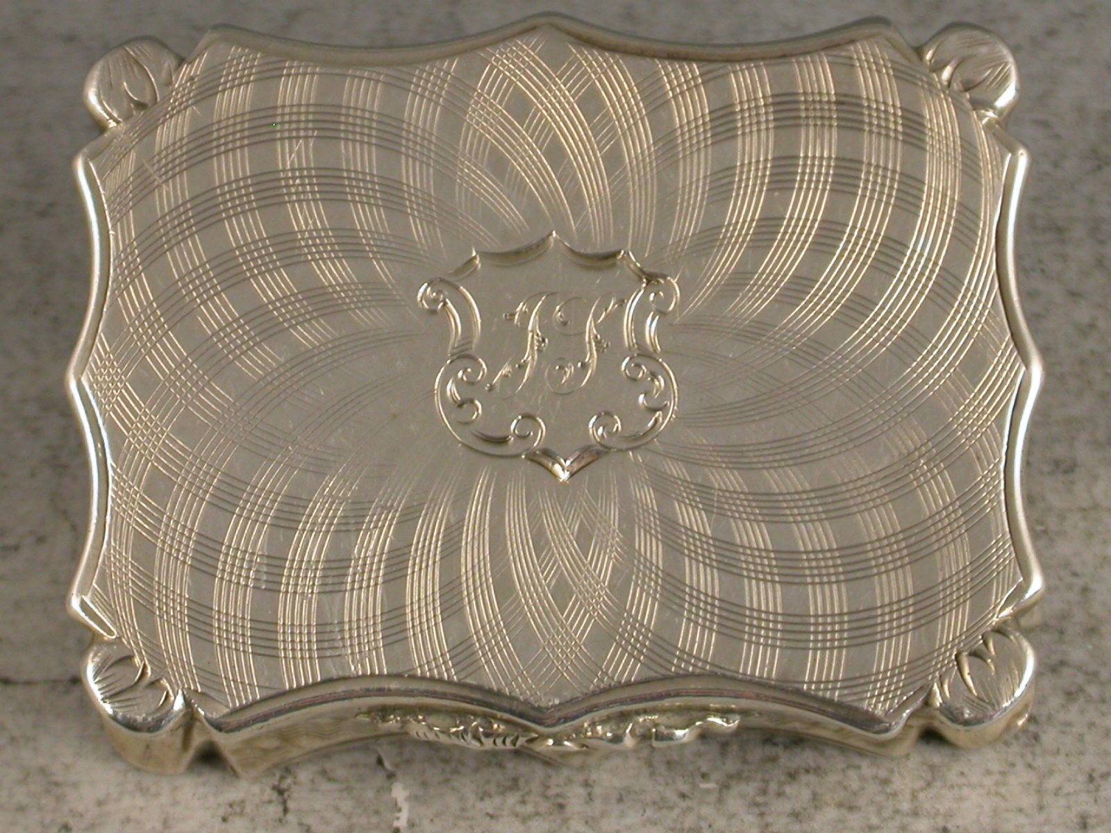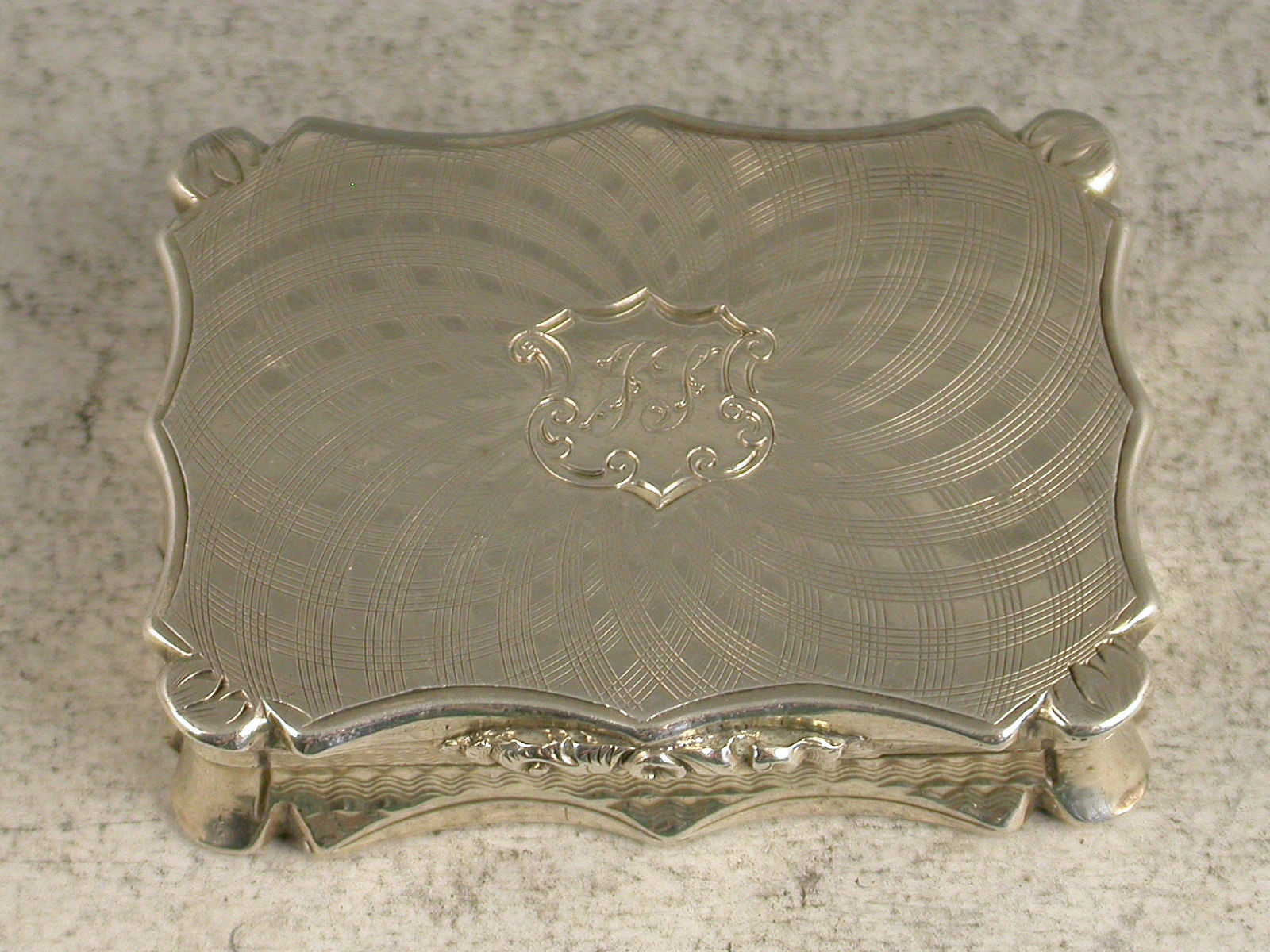 A fine Victorian silver Vinaigrette of shaped rectangular form with concave sides, the base and lid with unusual and striking swirling engine turned design, centered with a flower head to the base and a cartouche to the lid engraved with initials 'JS'. The silver gilt interior with pierced foliate scroll grill.
