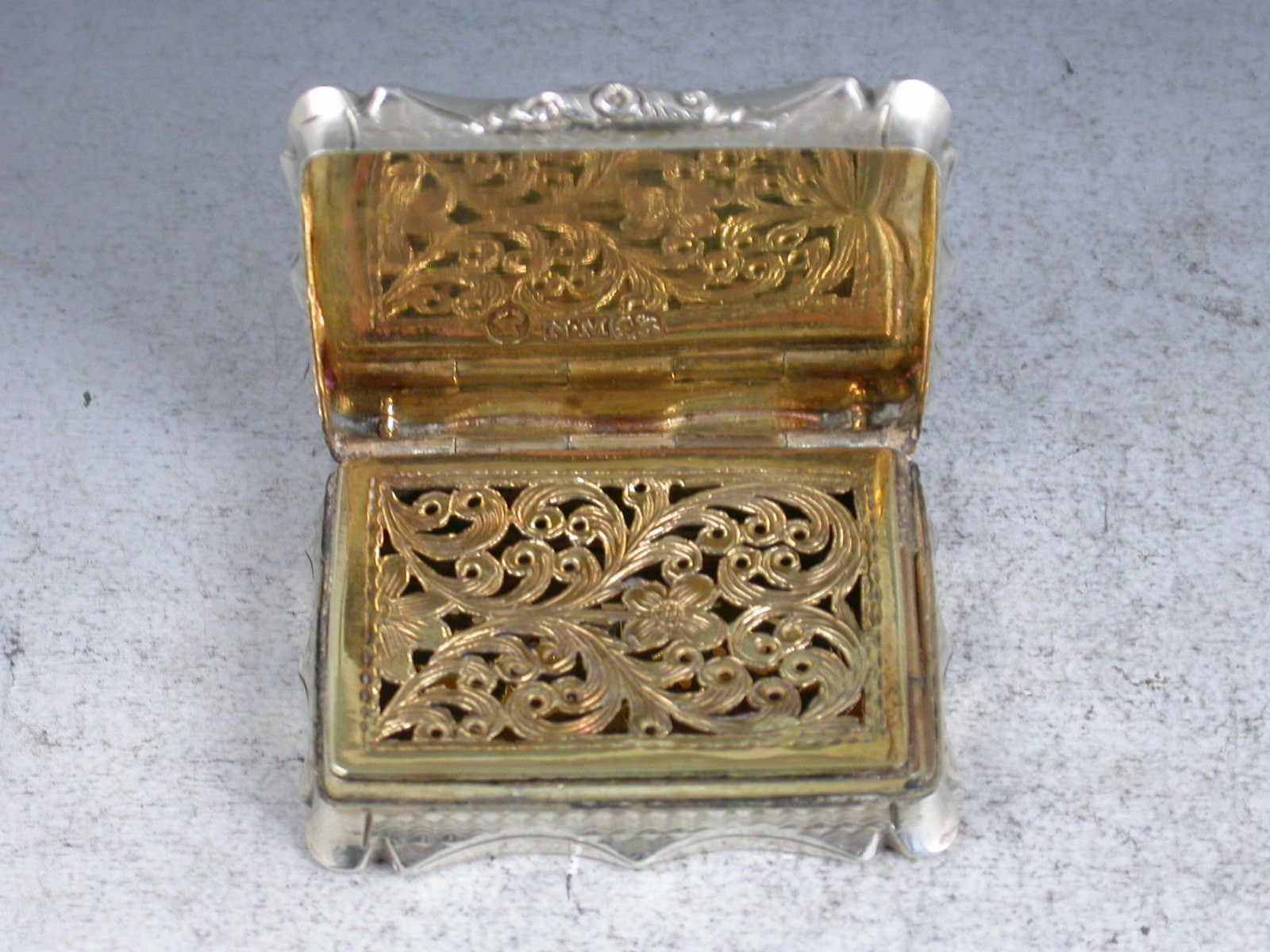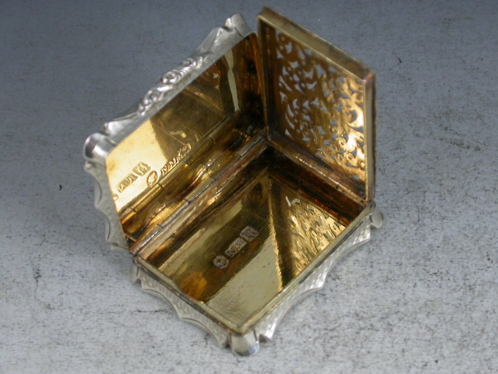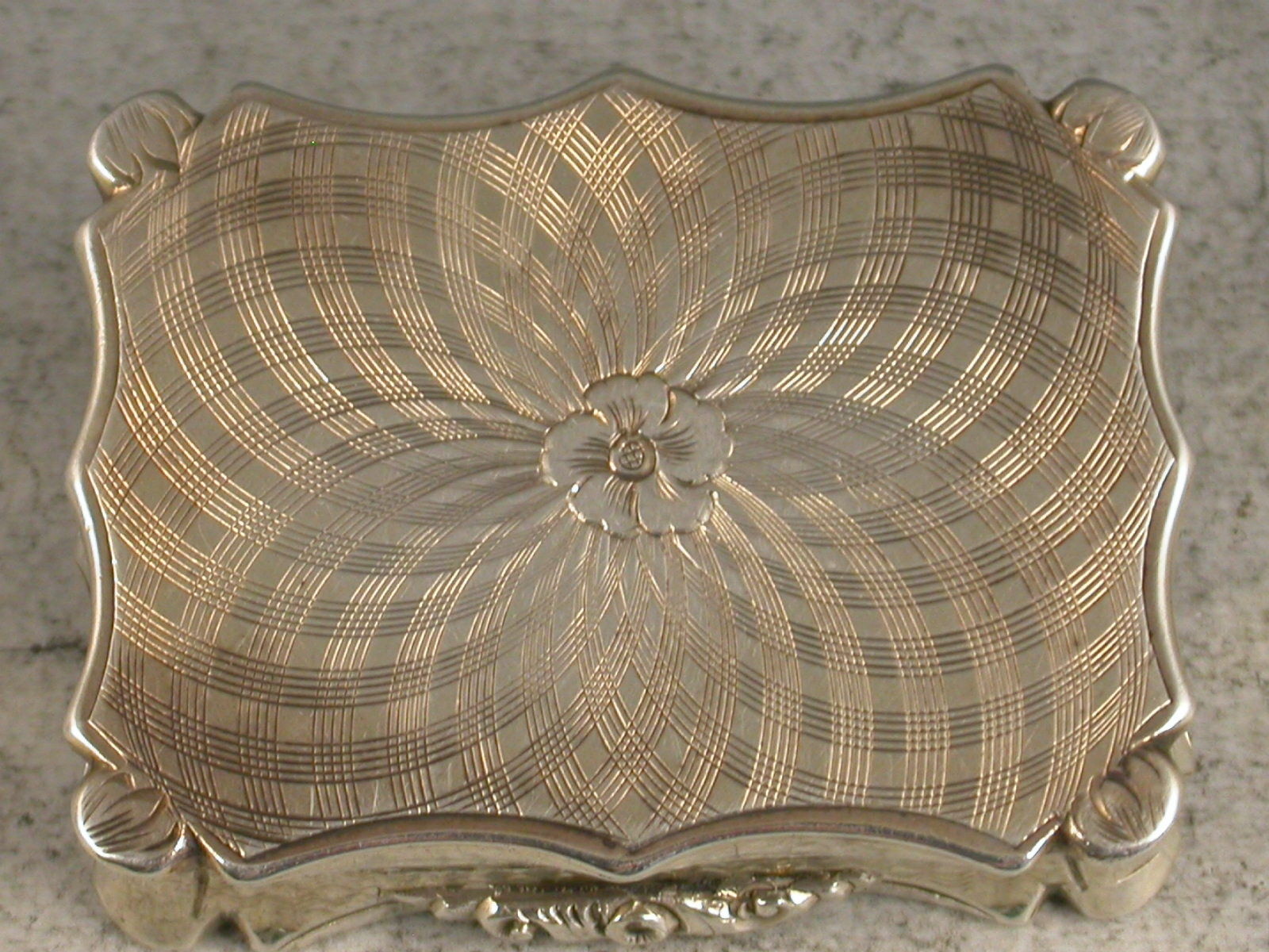 A fine Victorian silver Vinaigrette of shaped rectangular form with concave sides, the base and lid with unusual and striking swirling engine turned design, centered with a flower head to the base and a cartouche to the lid engraved with initials 'JS'. The silver gilt interior with pierced foliate scroll grill.