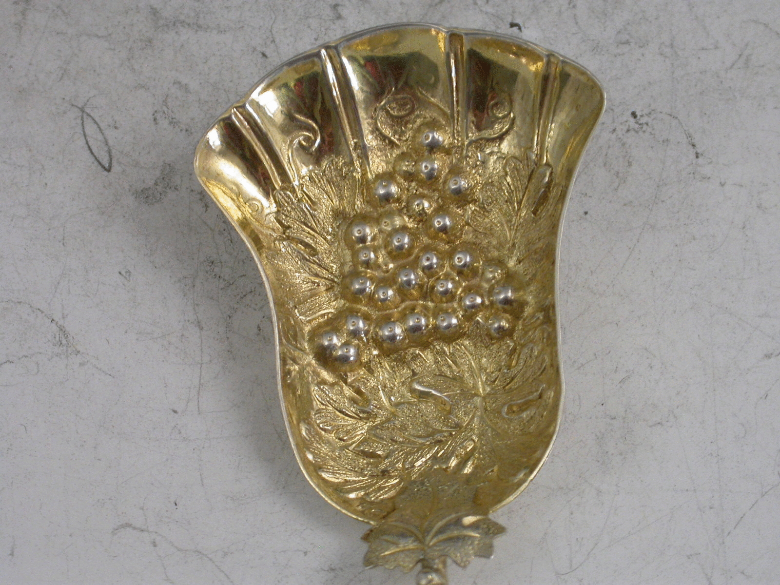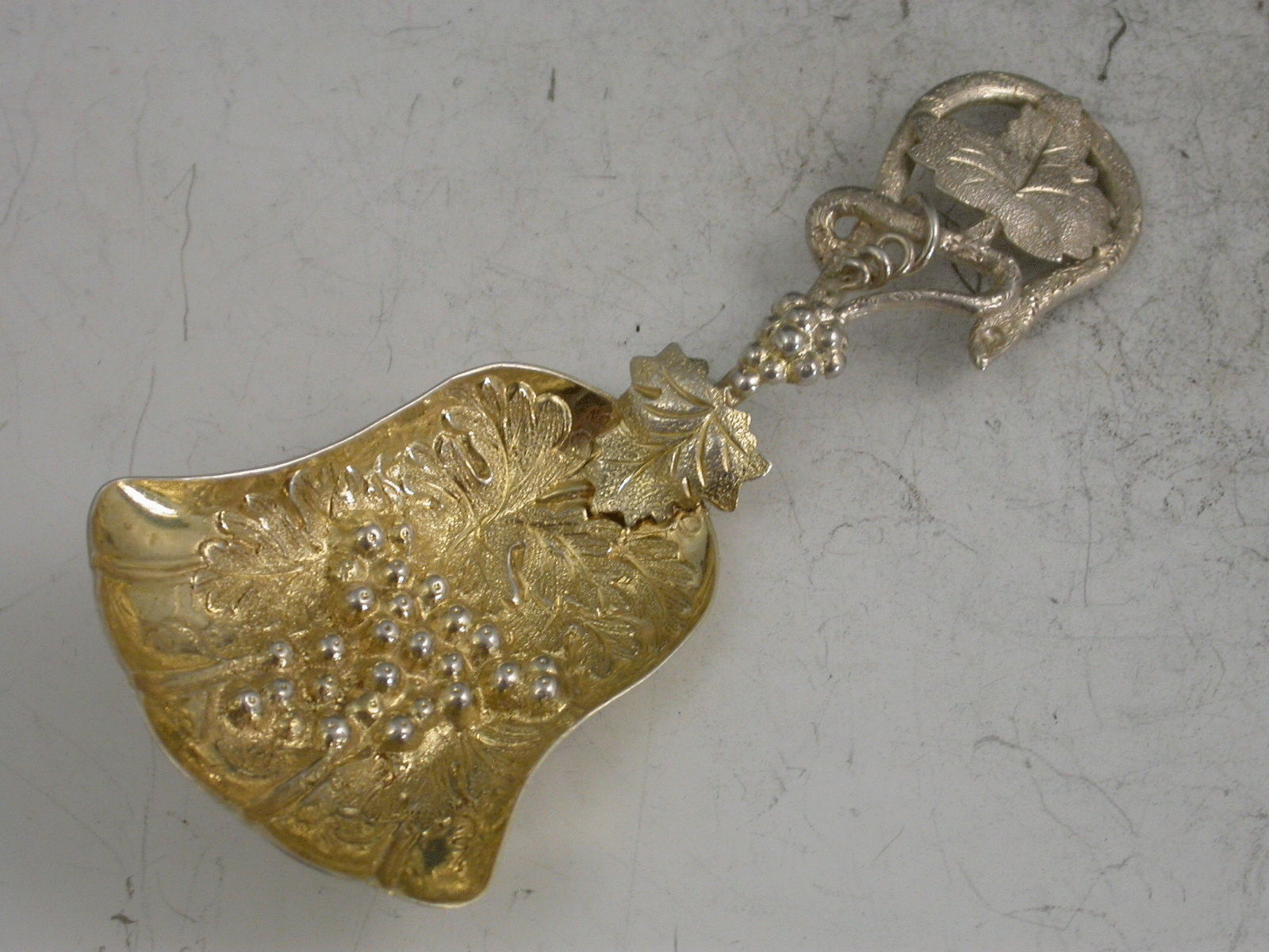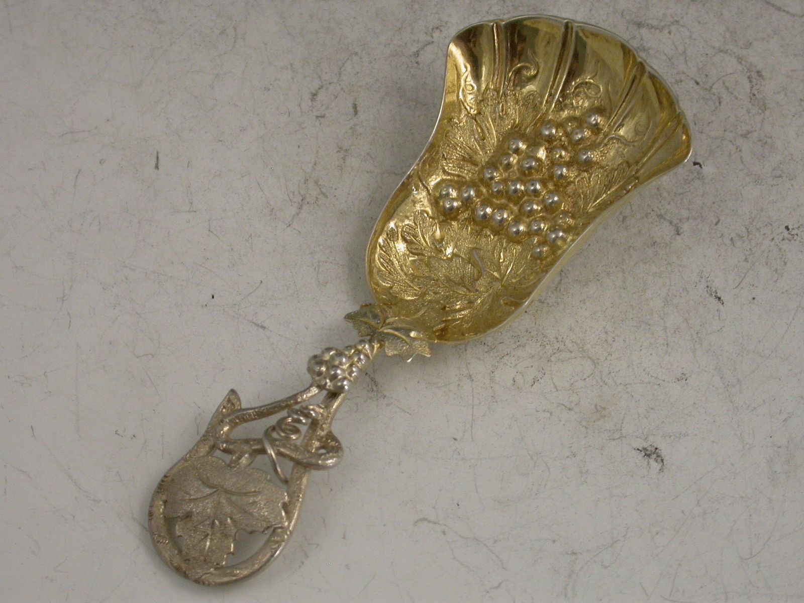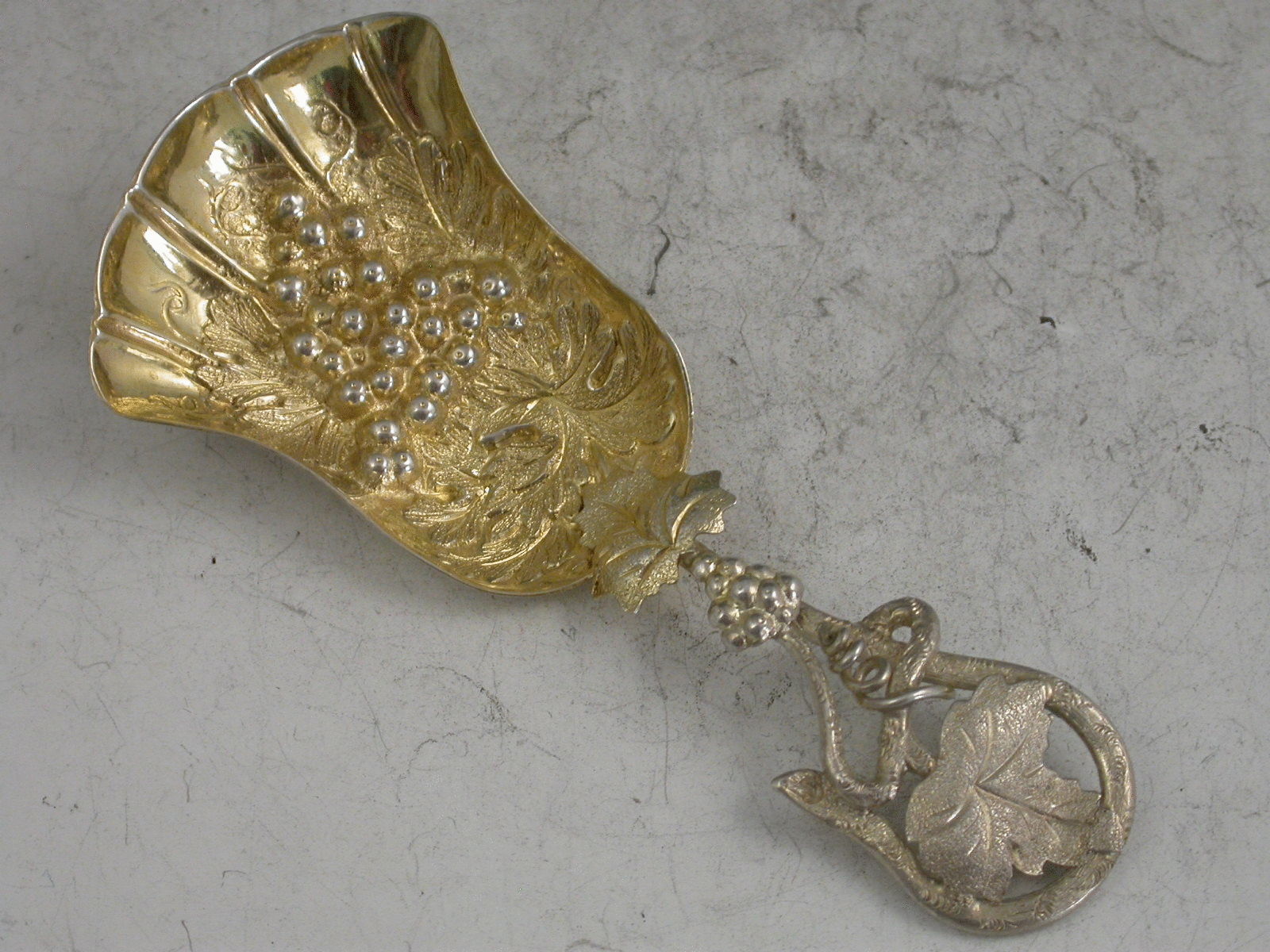 A good Victorian silver Caddy Spoon, the die-stamped silver gilt tulip shaped bowl embossed with a bunch or grapes and vine leaves, the twisted vine tendril handle also decorated with vine leaves and grapes.