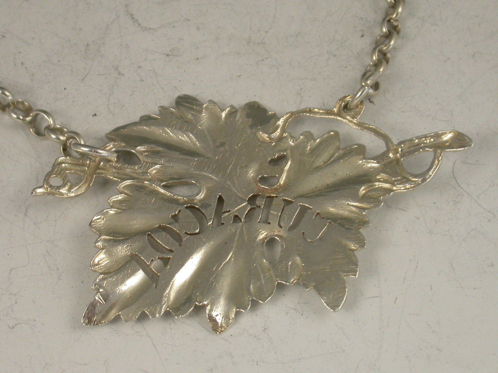 A rare Victorian heavy die-stamped or cast silver Wine Label of single vine leaf form pierced for Curacoa (an orange flavoured liqueur).