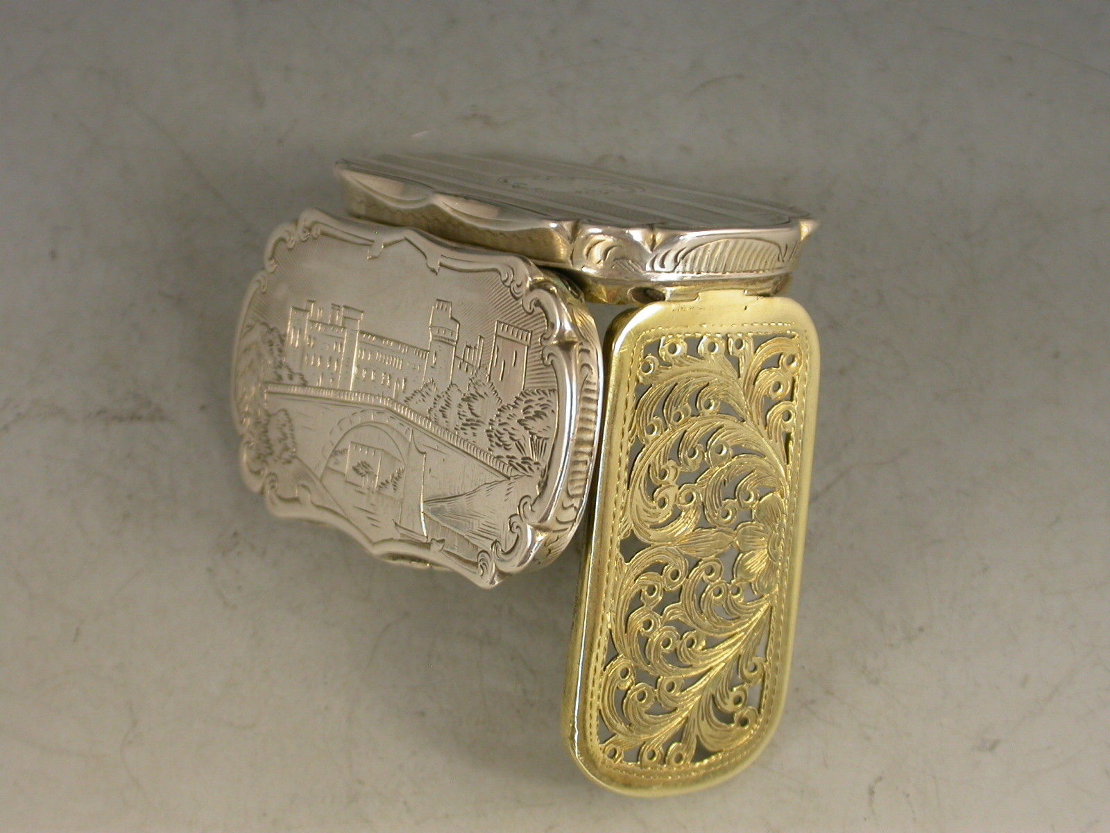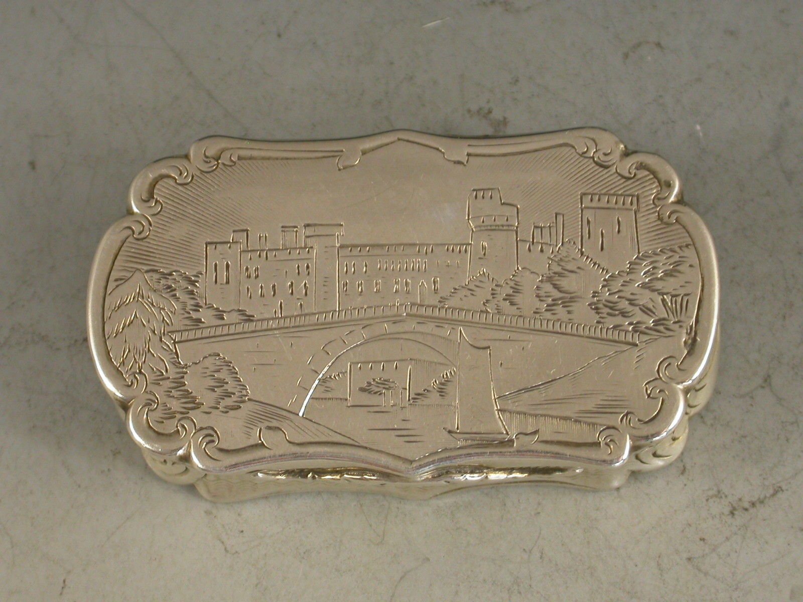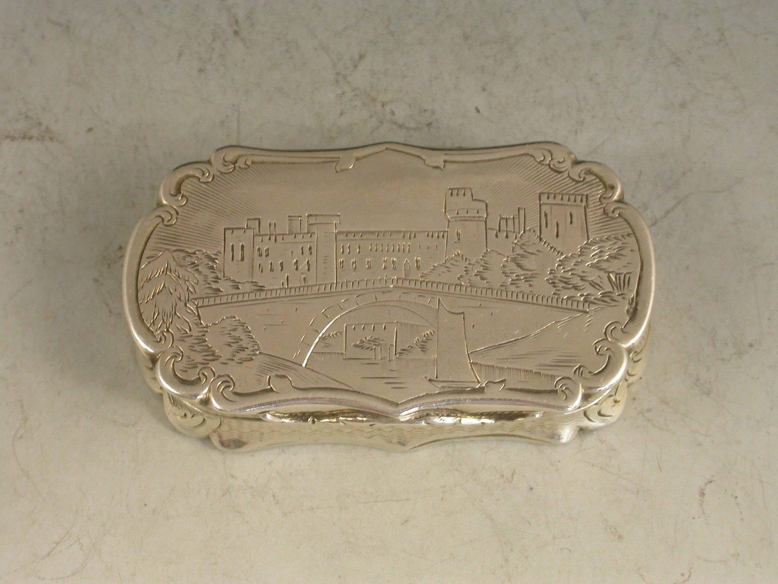 A rare Victorian silver Vinaigrette of rounded shaped rectangular form, the base with bands of engine turned decoration, the lid engraved with a rare view of Warwick Castle from the River Avon with a boat and a bridge in the foreground. The silver gilt interior with foliate scroll pierced grille.