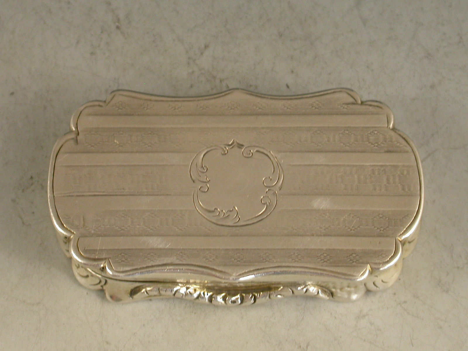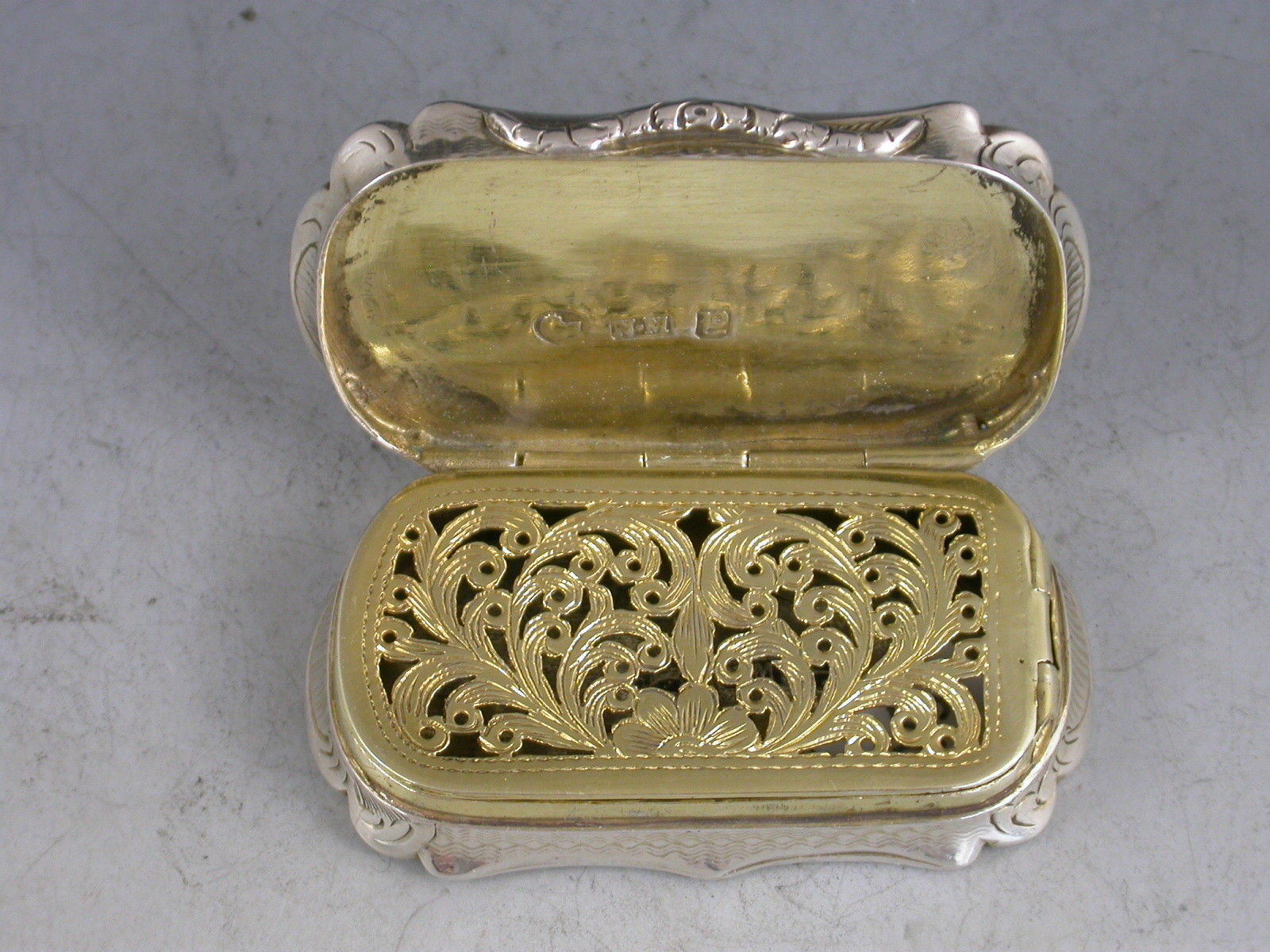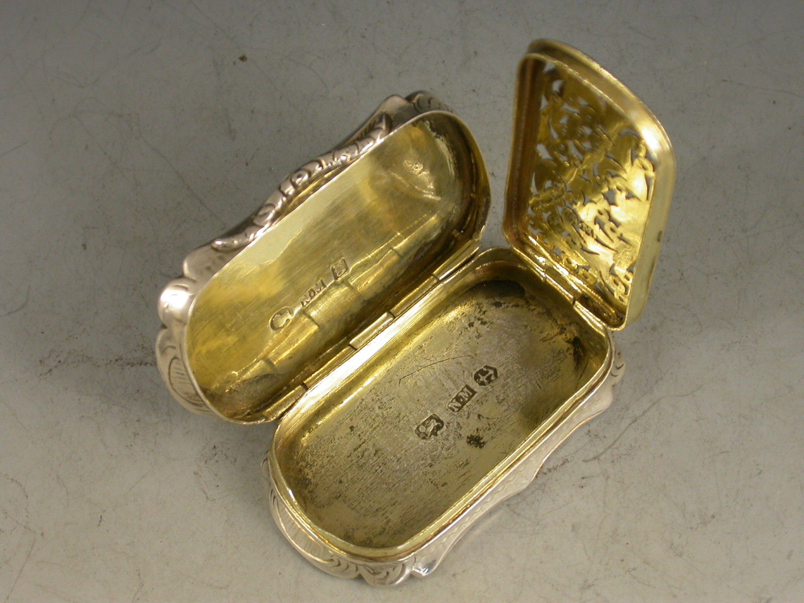 A rare Victorian silver Vinaigrette of rounded shaped rectangular form, the base with bands of engine turned decoration, the lid engraved with a rare view of Warwick Castle from the River Avon with a boat and a bridge in the foreground. The silver gilt interior with foliate scroll pierced grille.