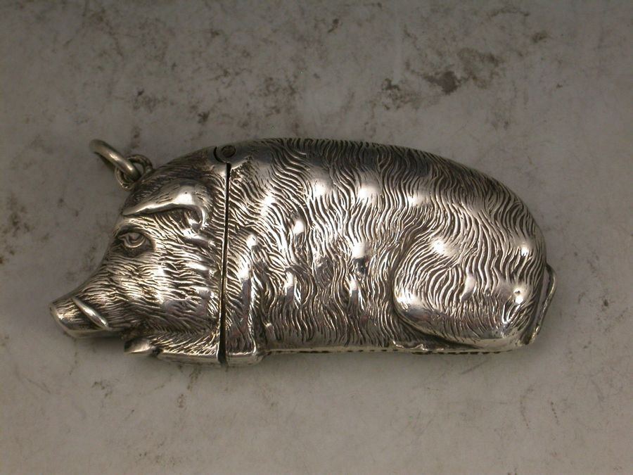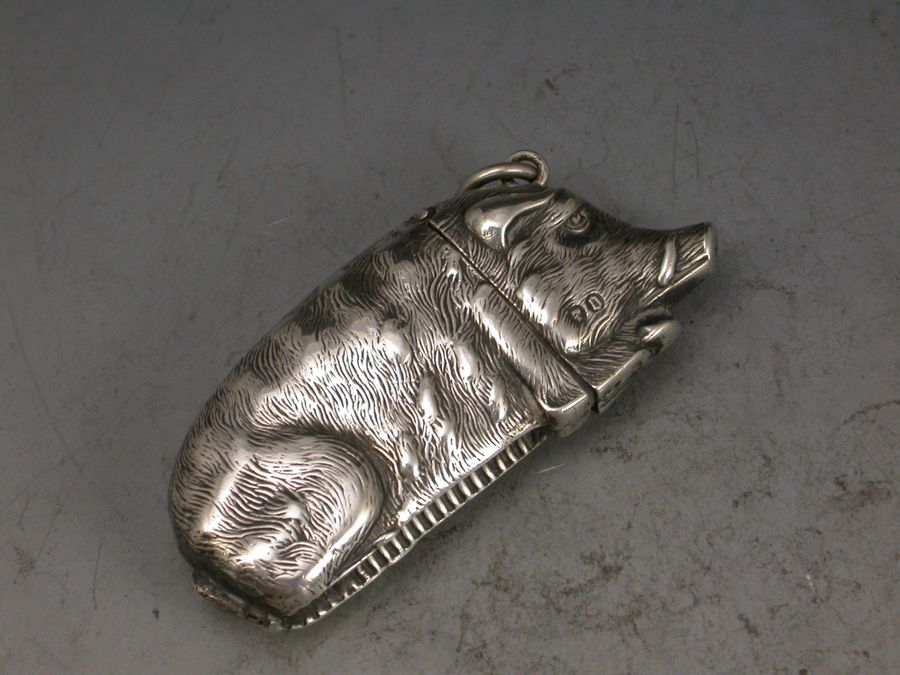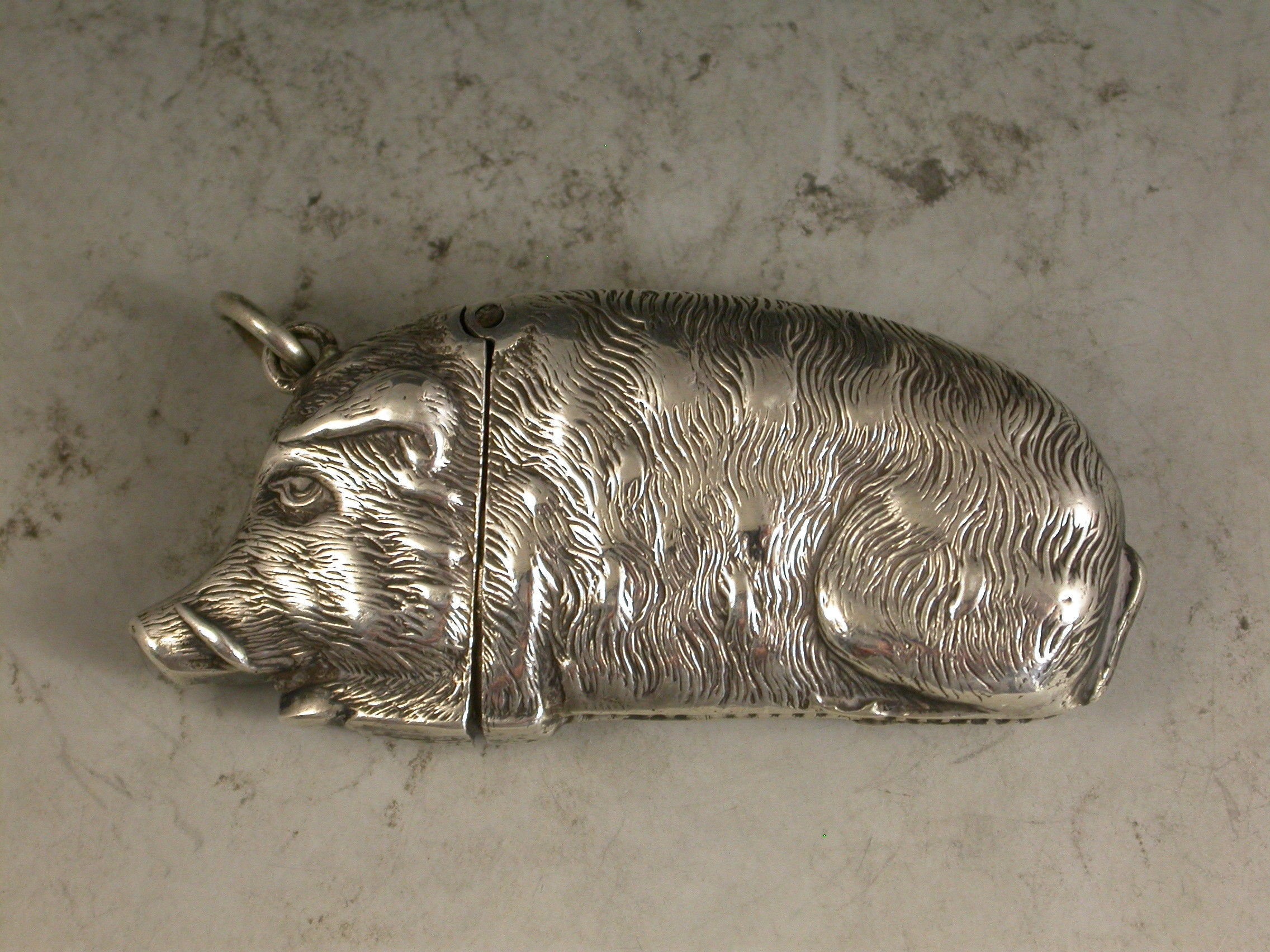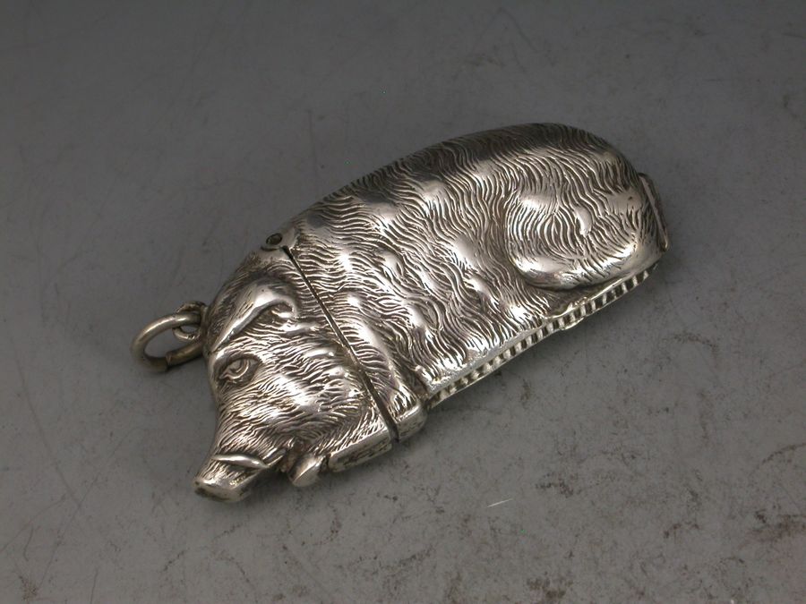 A good quality Victorian silver figural Vesta Case depicting a Wild Boar, with sprung hinged lid and attached suspension ring. Realistically modeled with good detail depicting the fur and tusks of the animal.