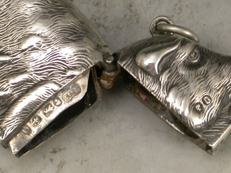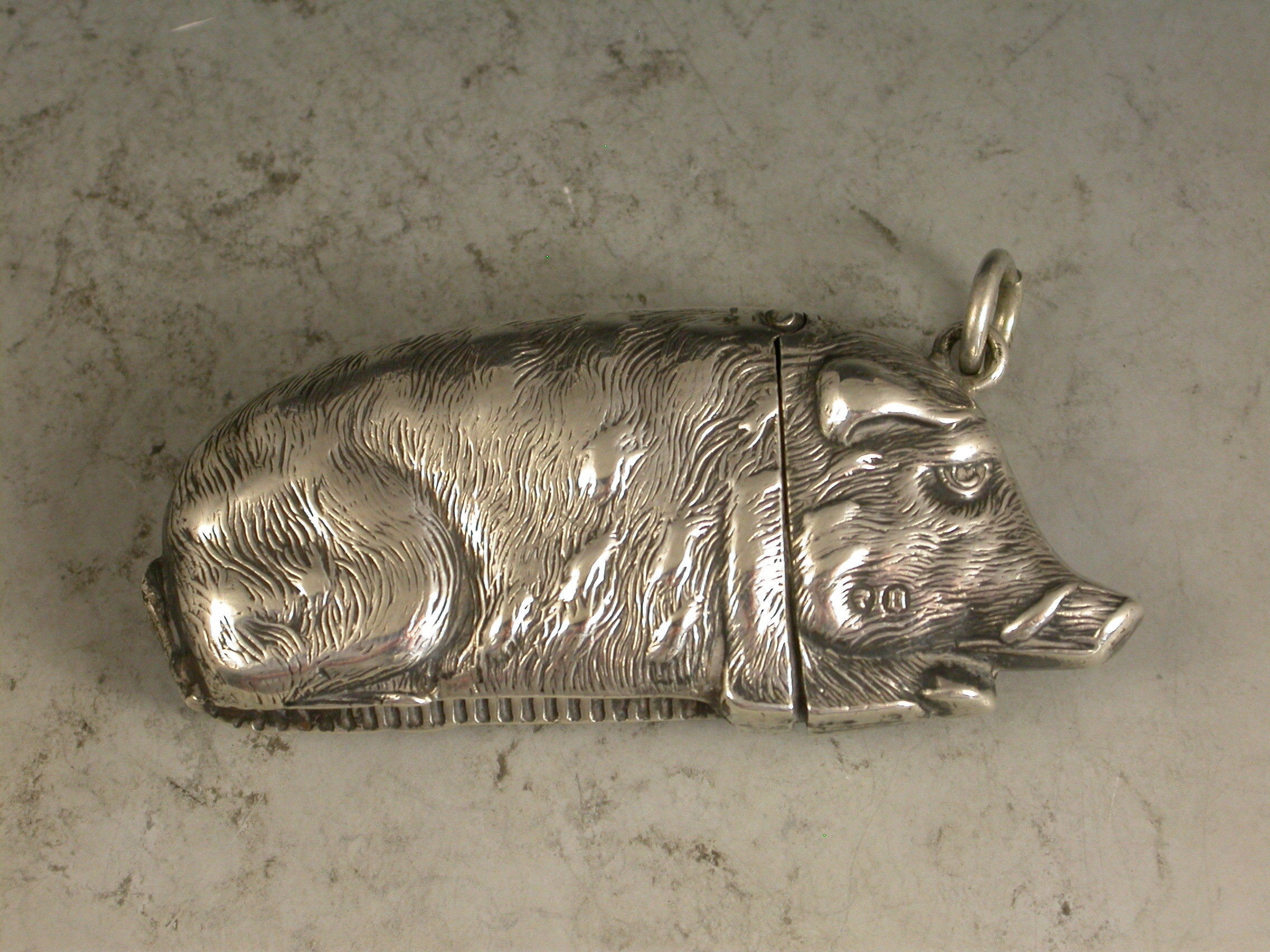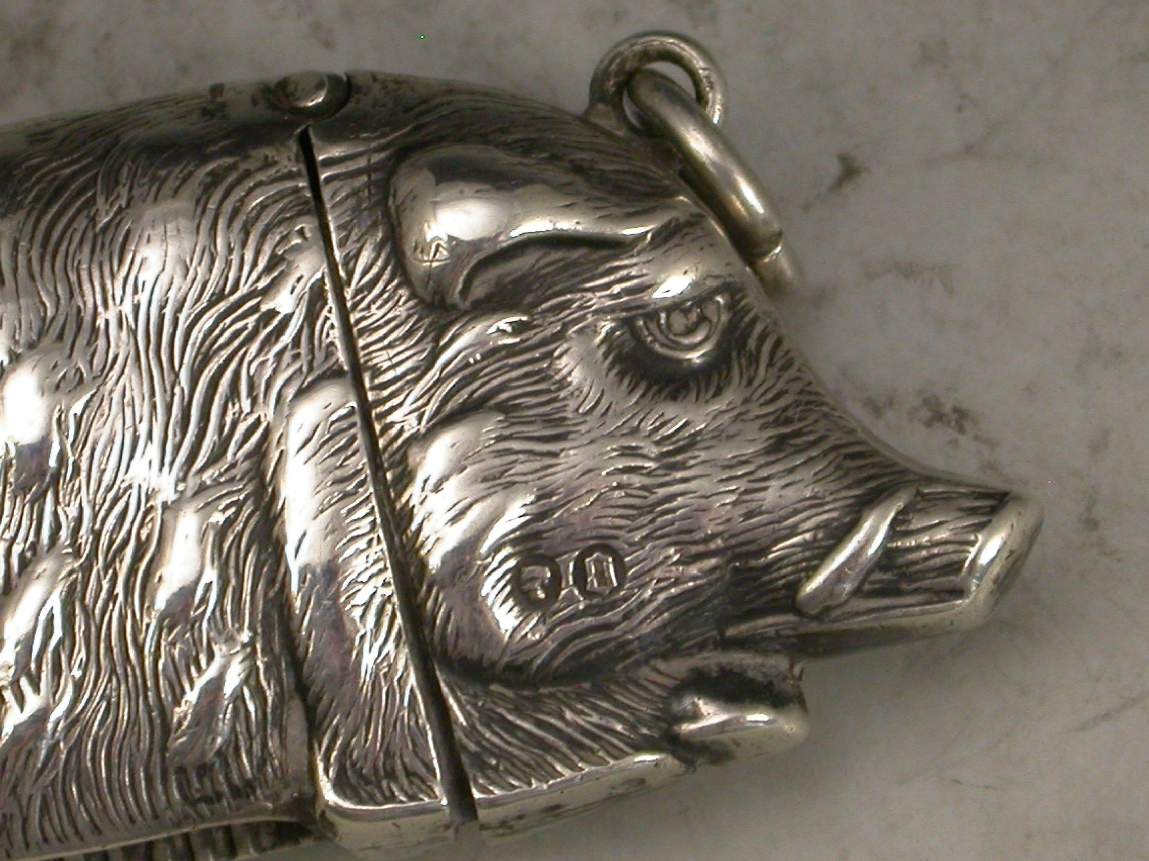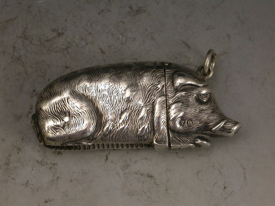 A good quality Victorian silver figural Vesta Case depicting a Wild Boar, with sprung hinged lid and attached suspension ring. Realistically modeled with good detail depicting the fur and tusks of the animal.