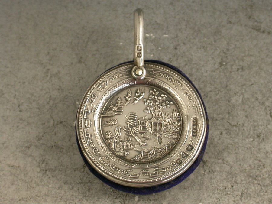 A Victorian silver mounted Pin Cushion of circular form with die-stamped covers made in the form of Willow Pattern Plates, complete with attached stirrup shaped suspension ring.