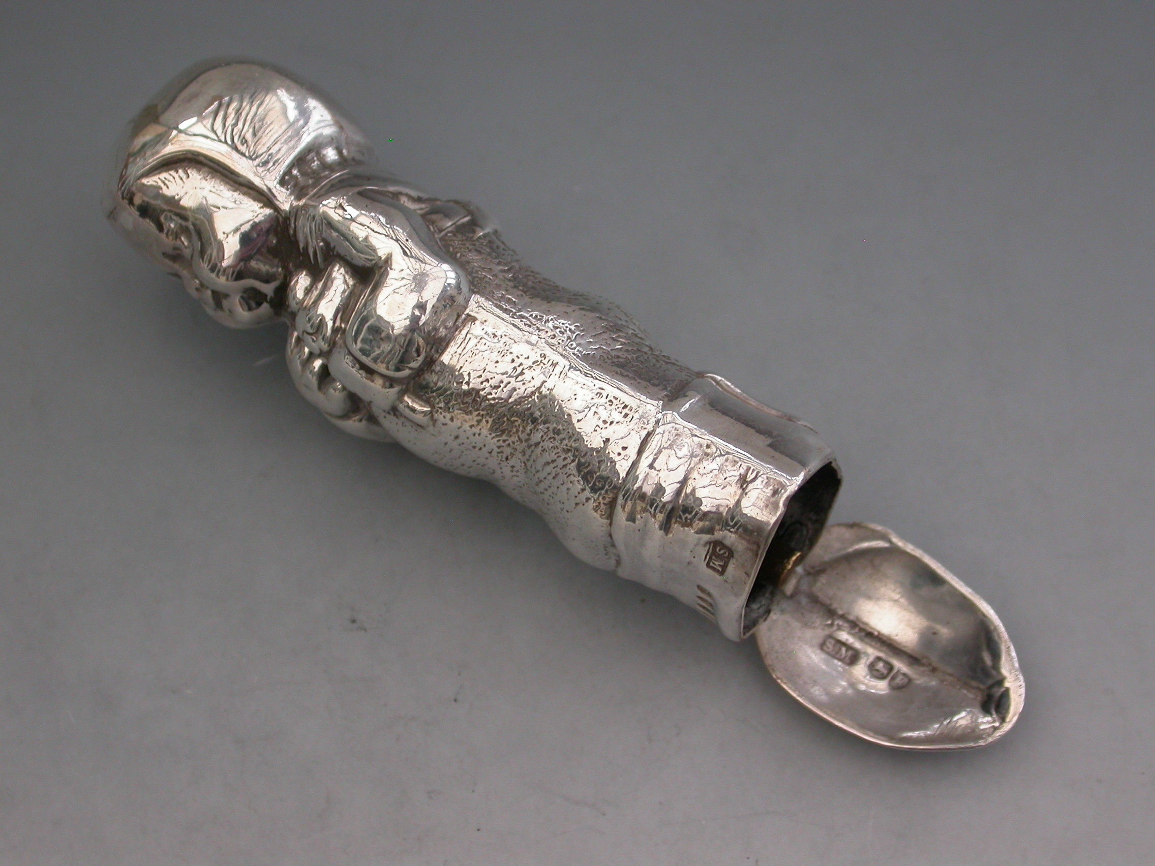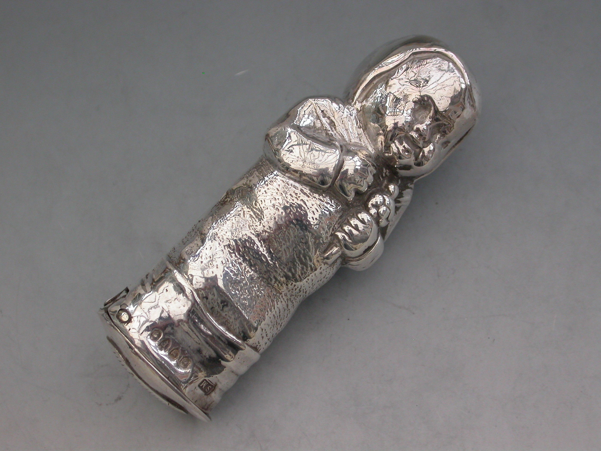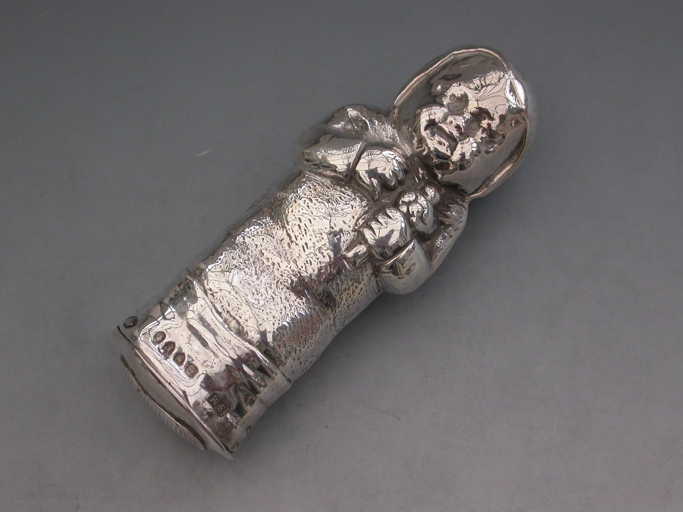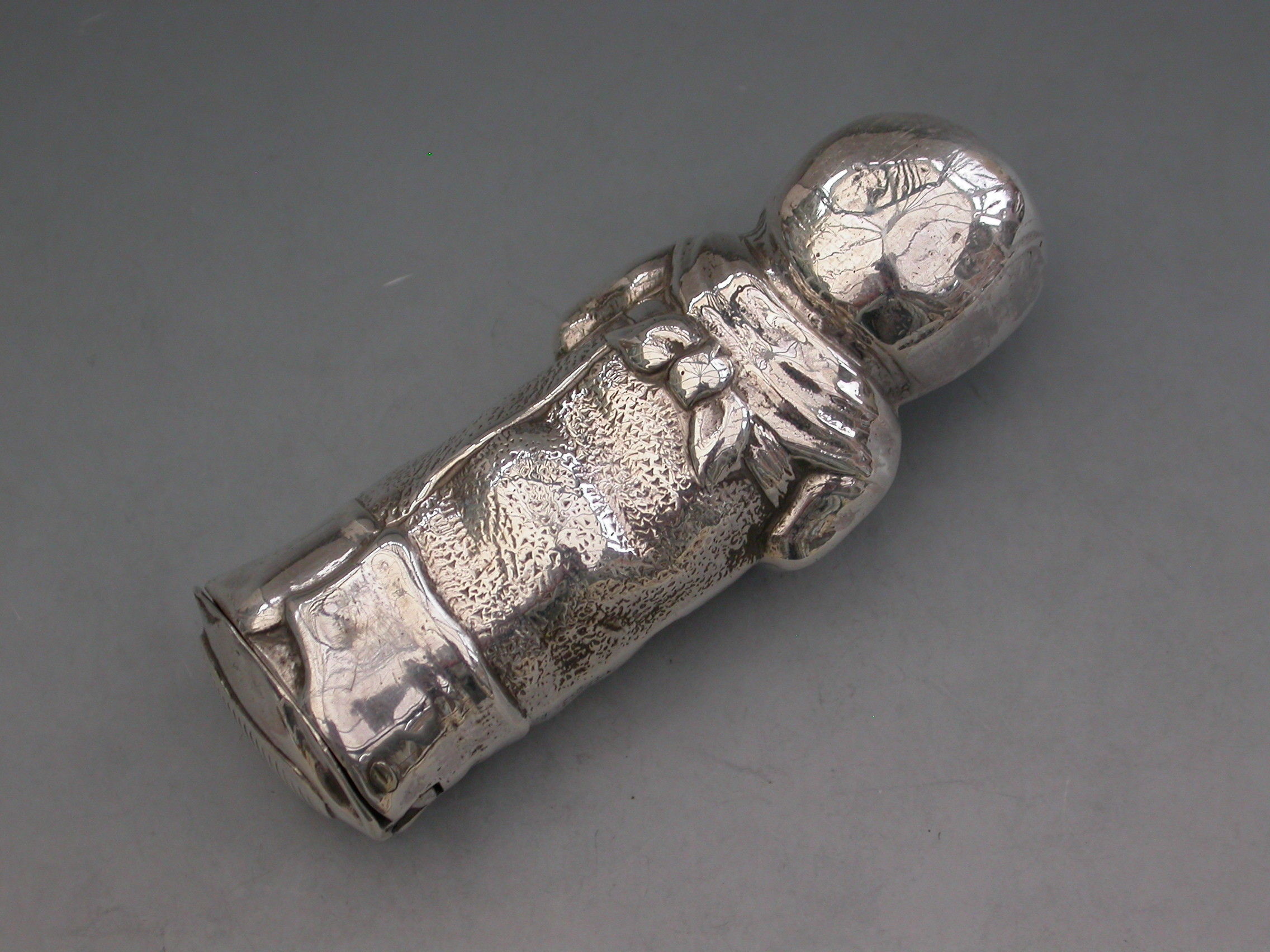 A rare Victorian novelty silver figural Vesta Case modelled as a baby in swaddling clothes holding a rattle. The sprung hinged lid to the base set with a striker plate.