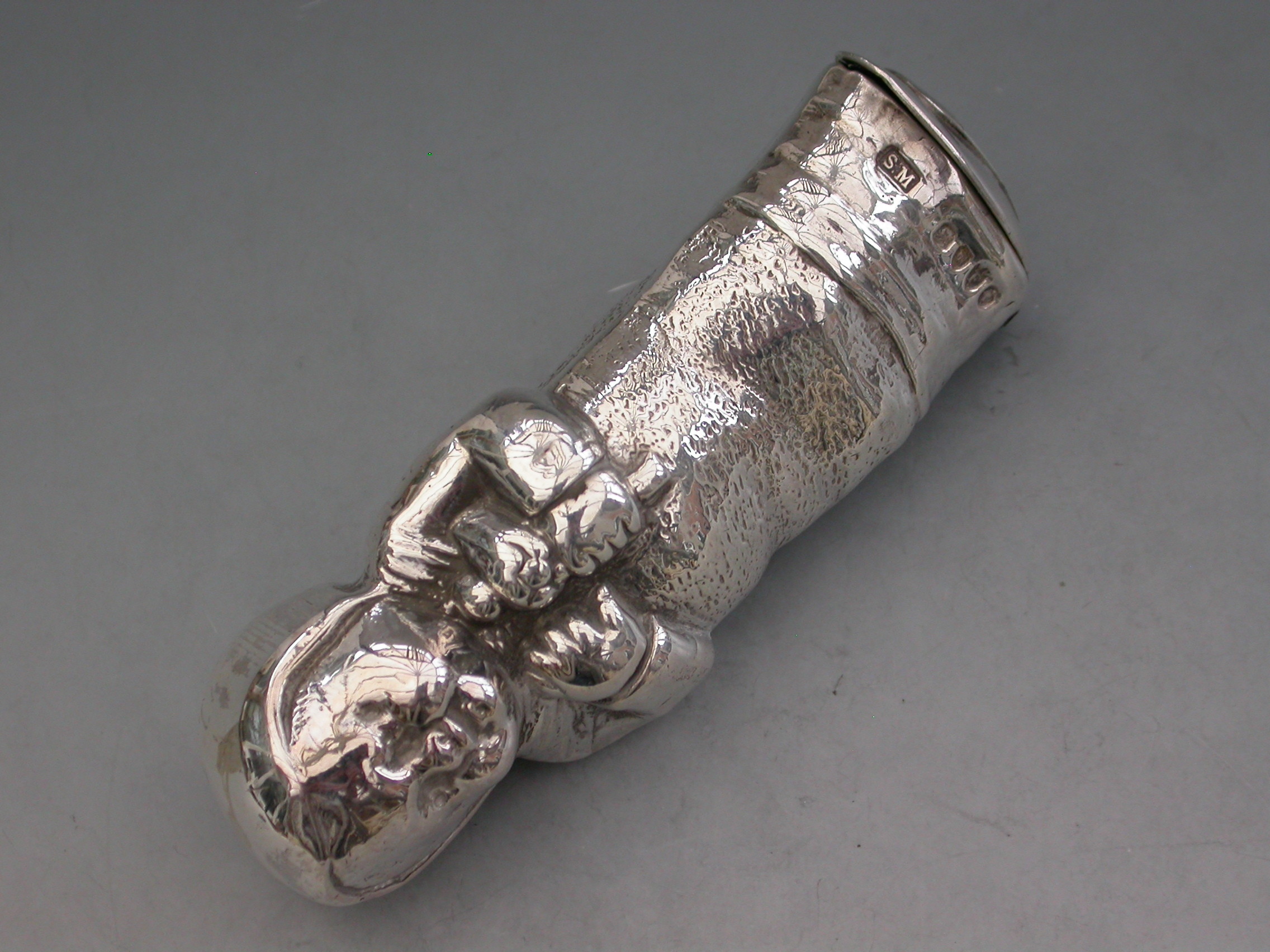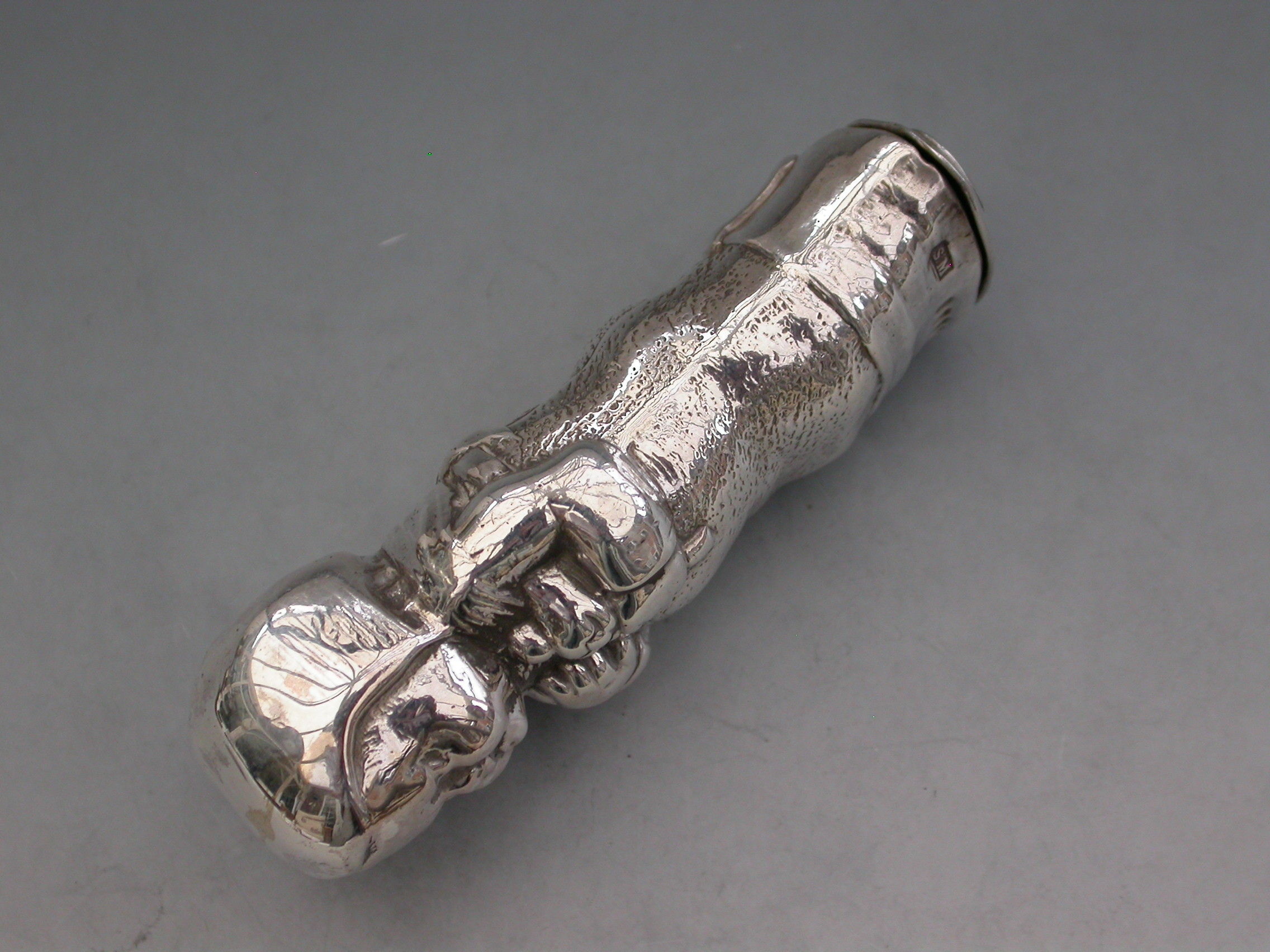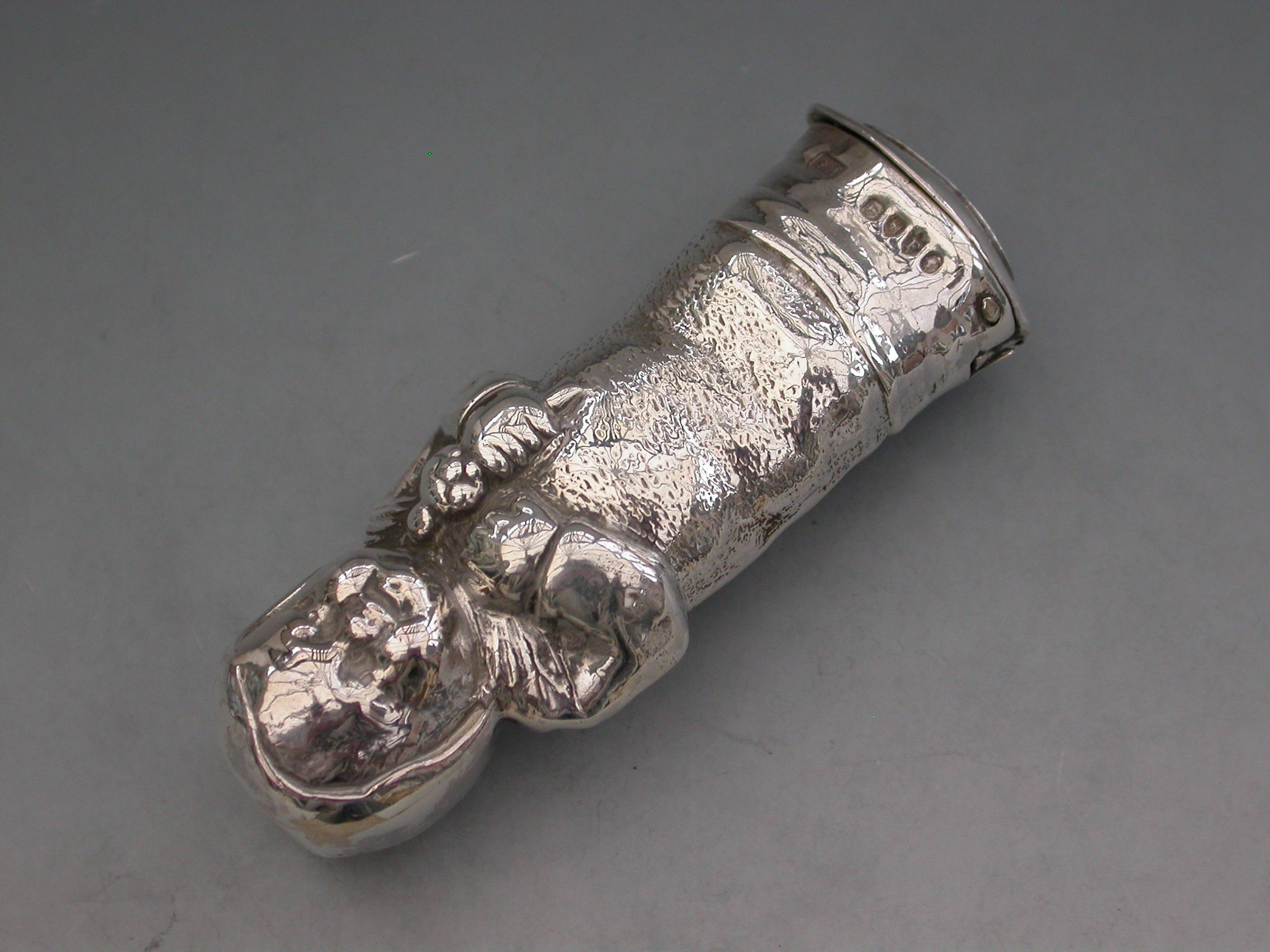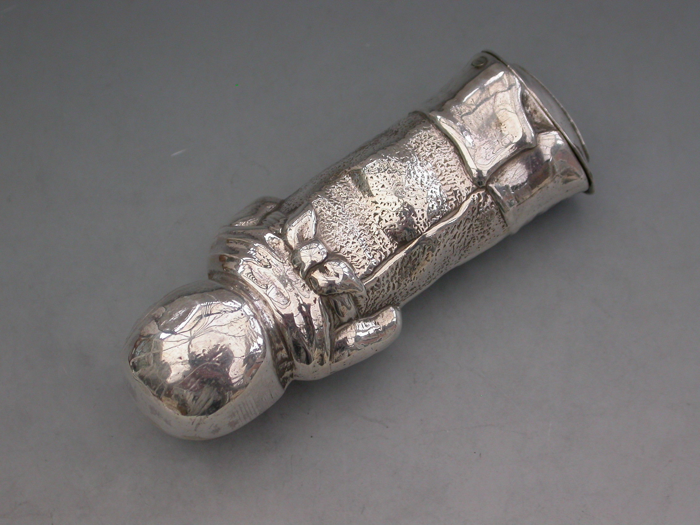 A rare Victorian novelty silver figural Vesta Case modelled as a baby in swaddling clothes holding a rattle. The sprung hinged lid to the base set with a striker plate.