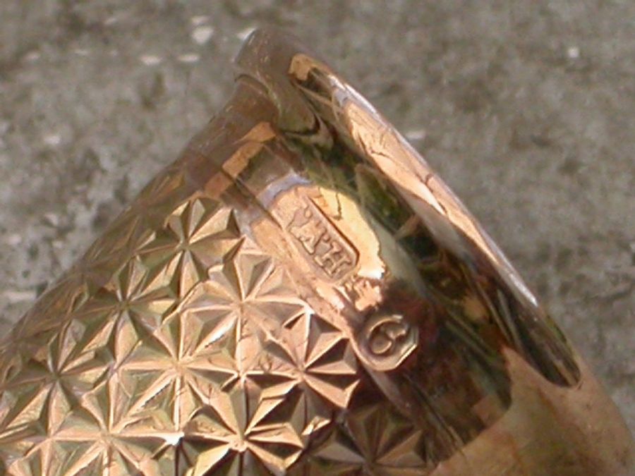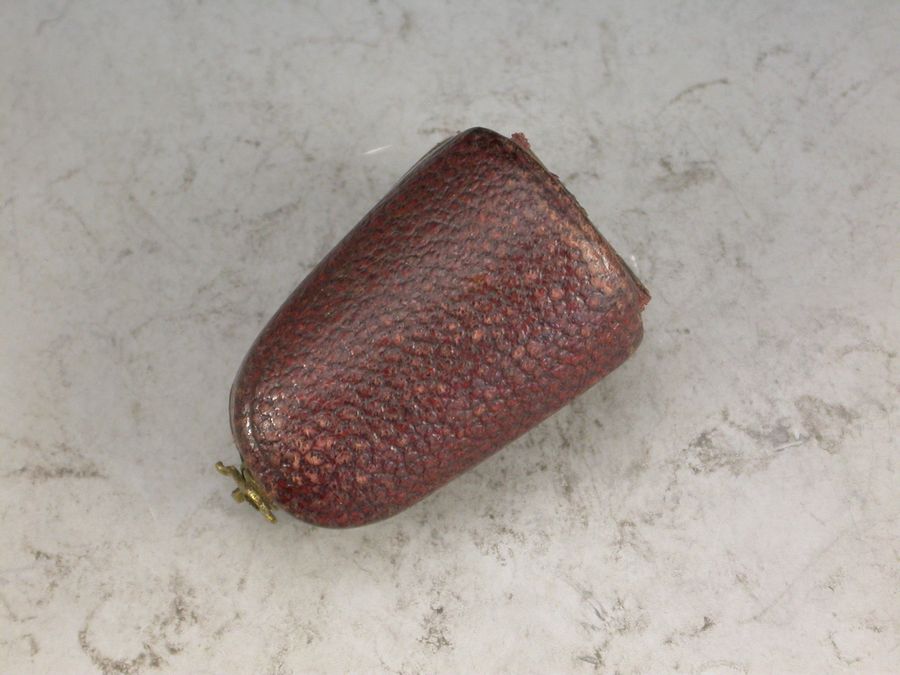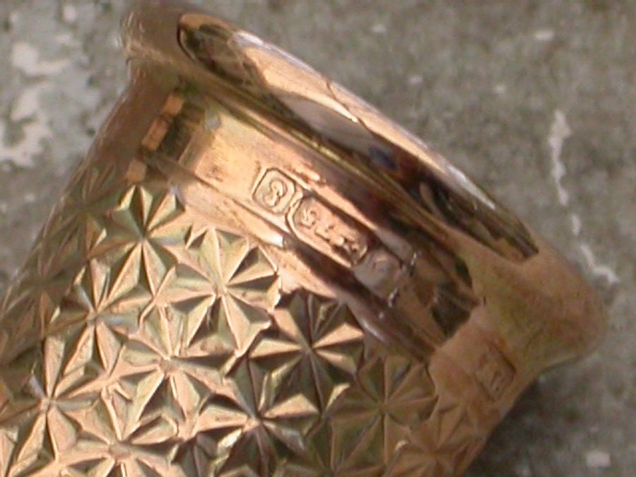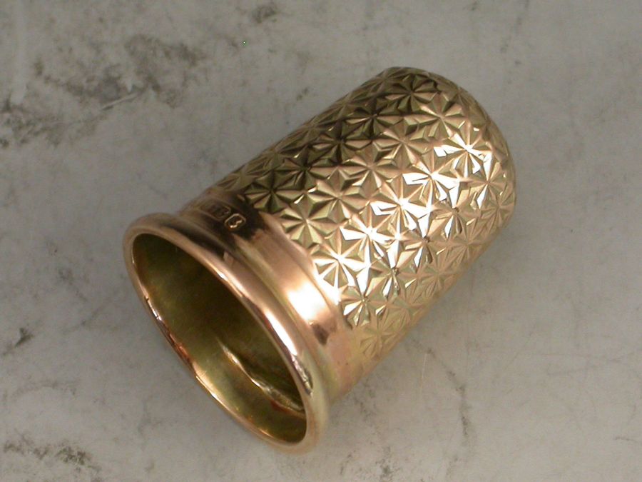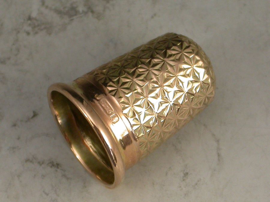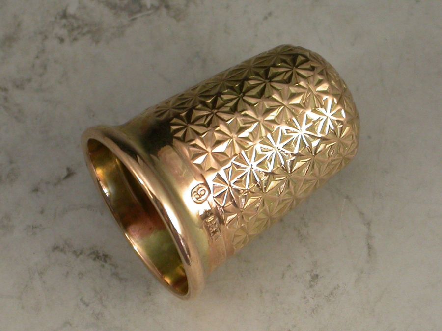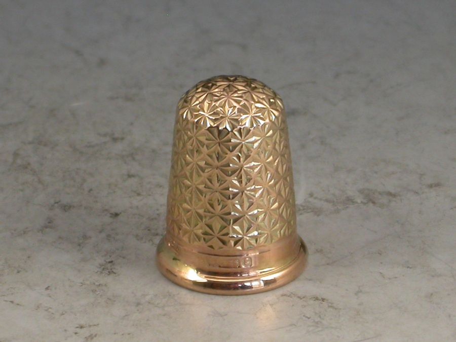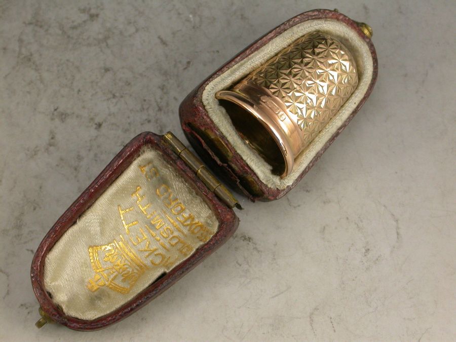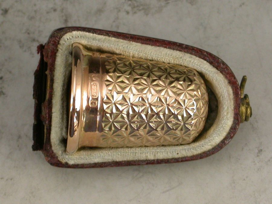 A good late Victorian fully hallmarked 9 carat gold Thimble with daisy pouncing. Complete with original leather case.