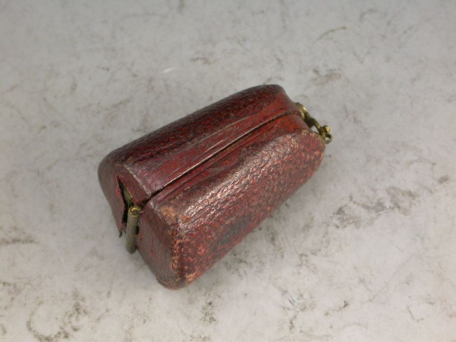 In good condition with no damage or repair. The hinge on the leather case is present but detached from one half of the case.