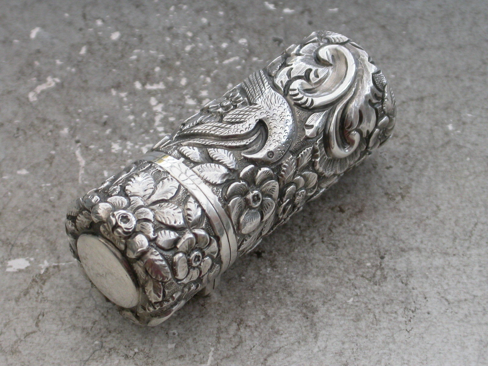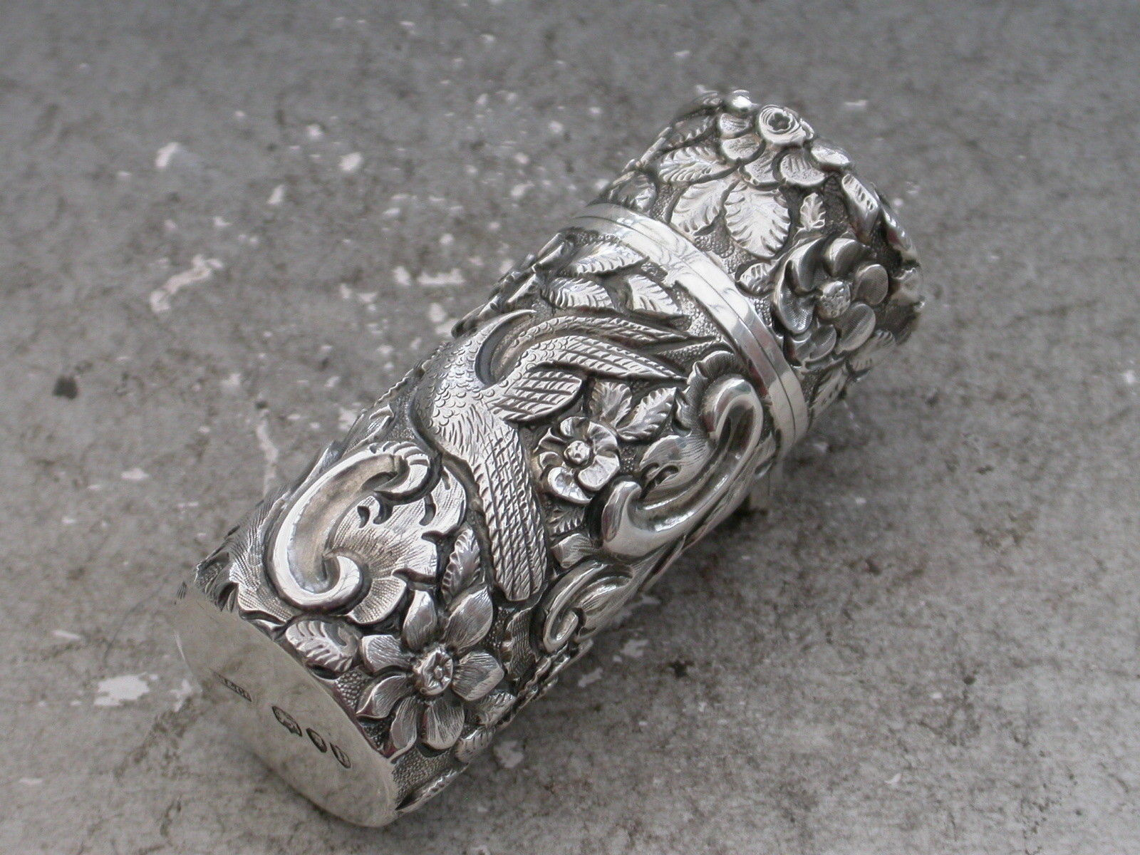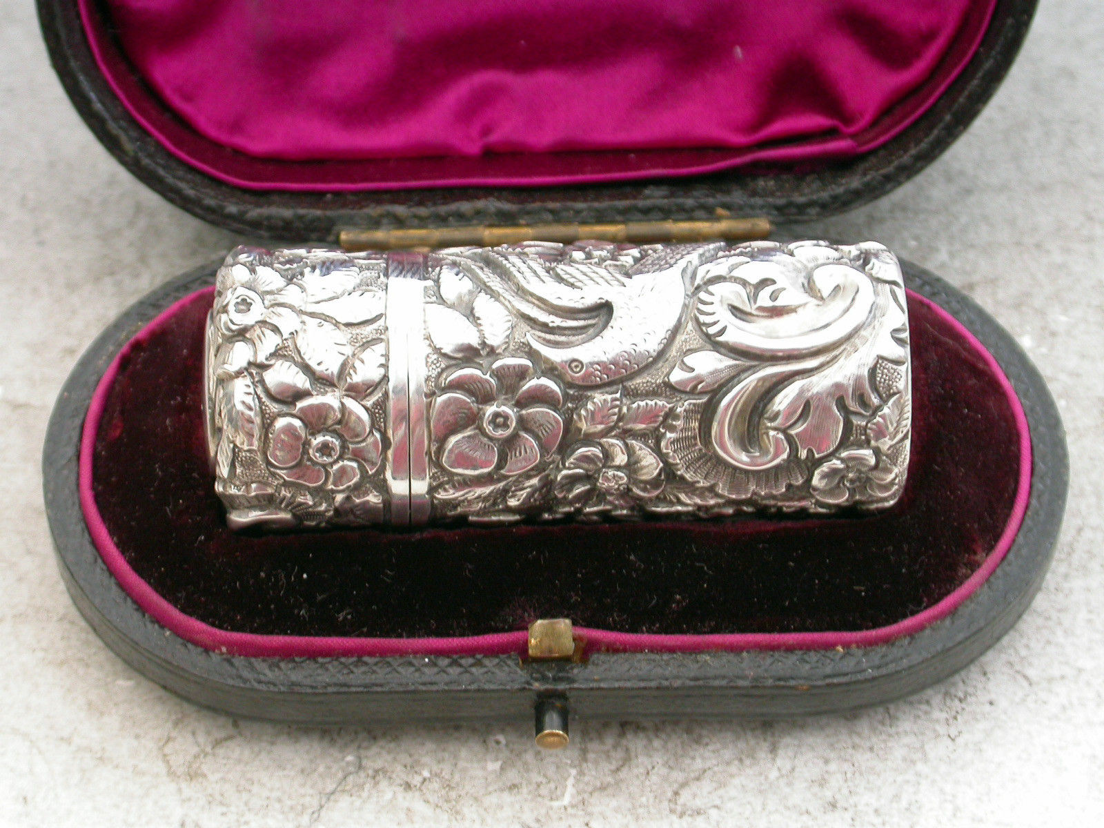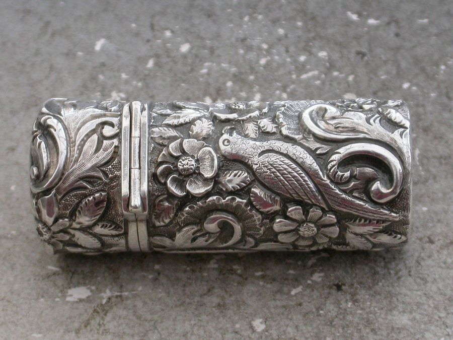 Victorian Cased Antique Silver Scent Bottle Chased with Birds