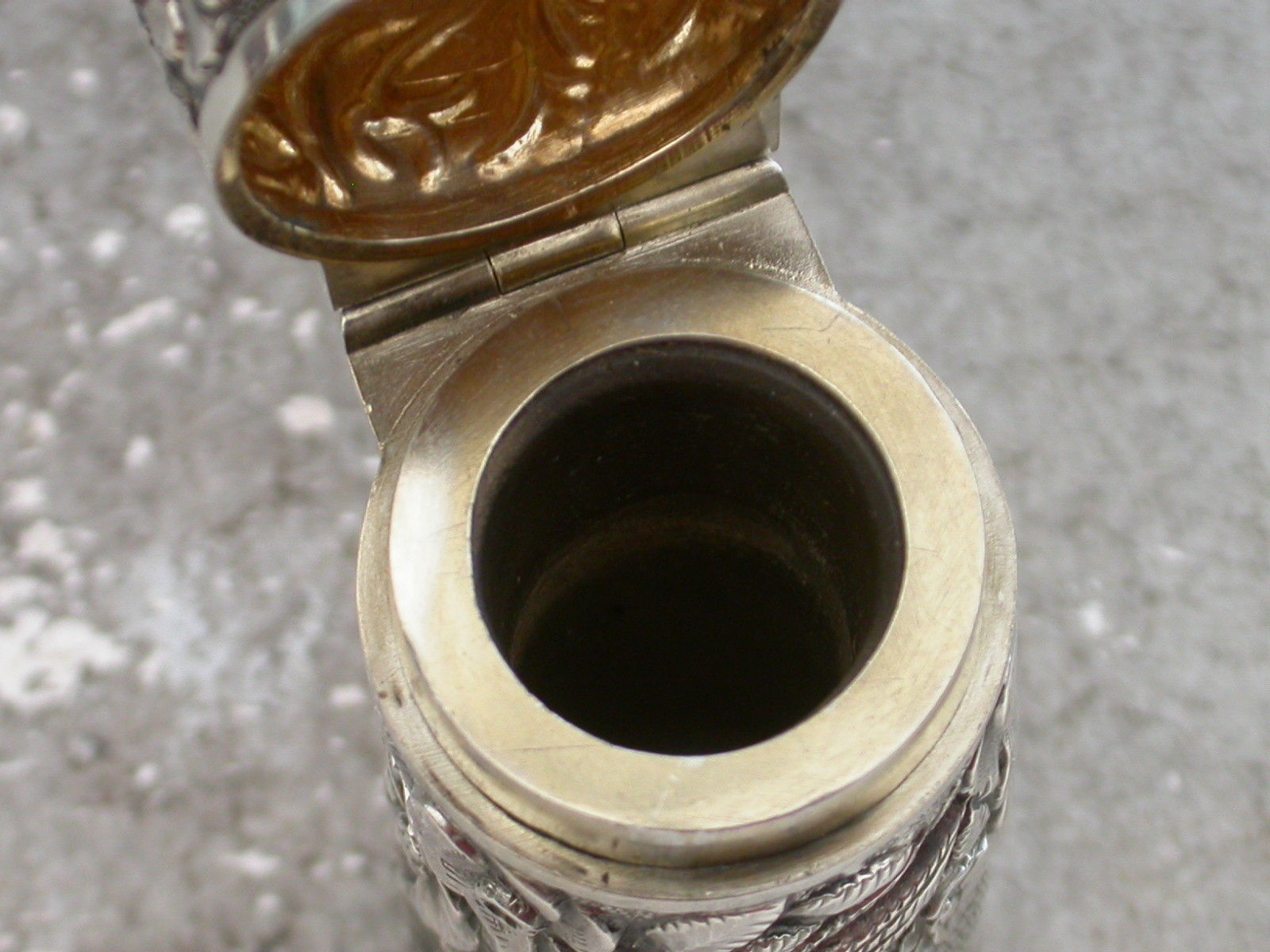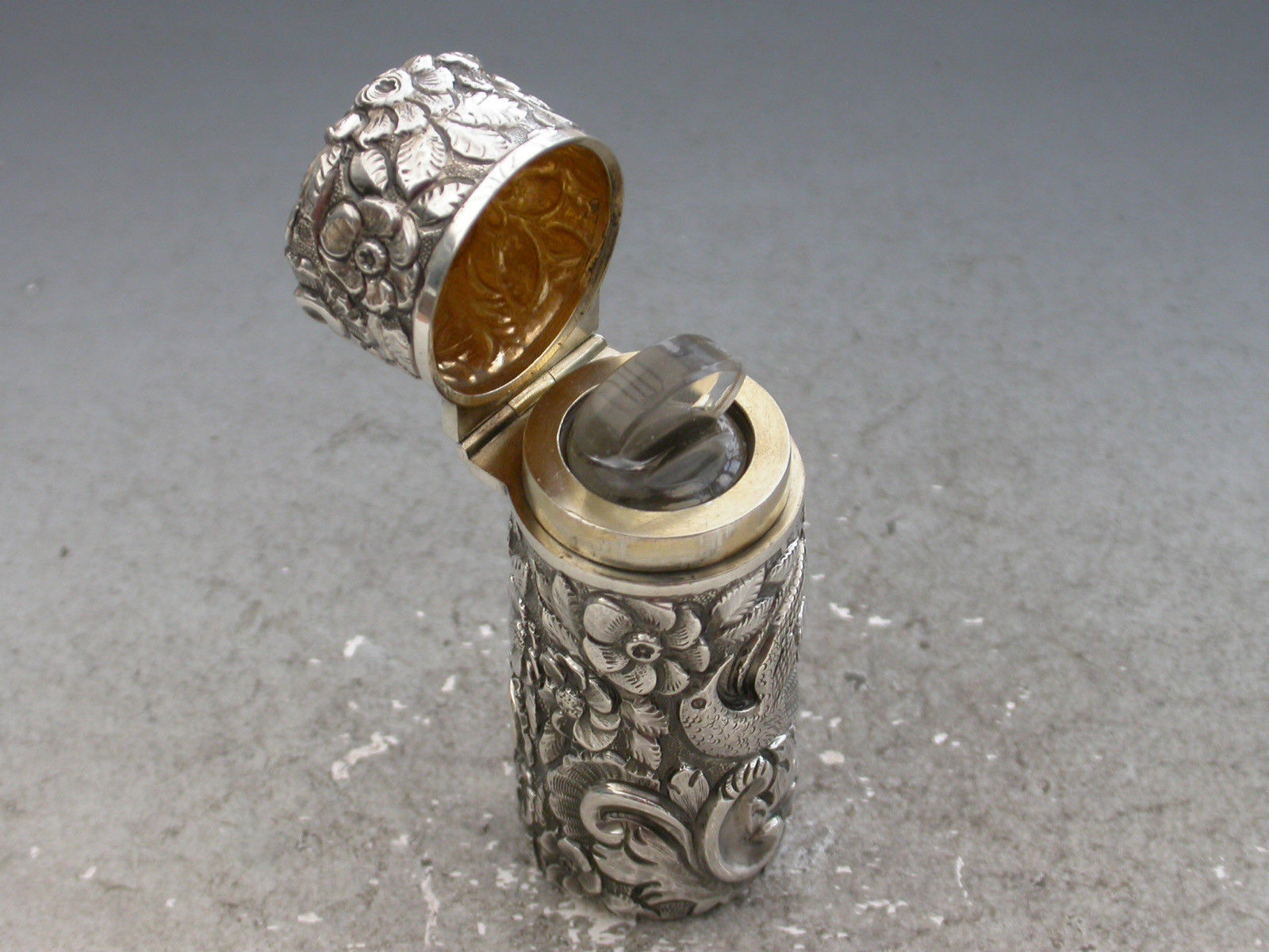 A fine quality Victorian cased silver Scent Bottle of cylindrical form with glass liner and stopper, the body chased and embossed with exotic birds amongst foliage in high relief, the hinged cover with silver gilt interior.