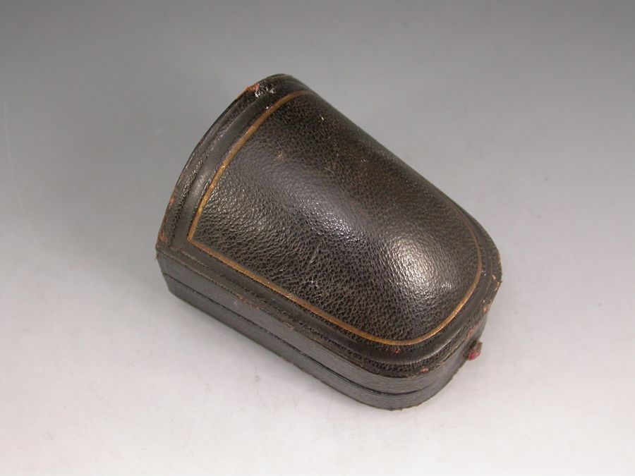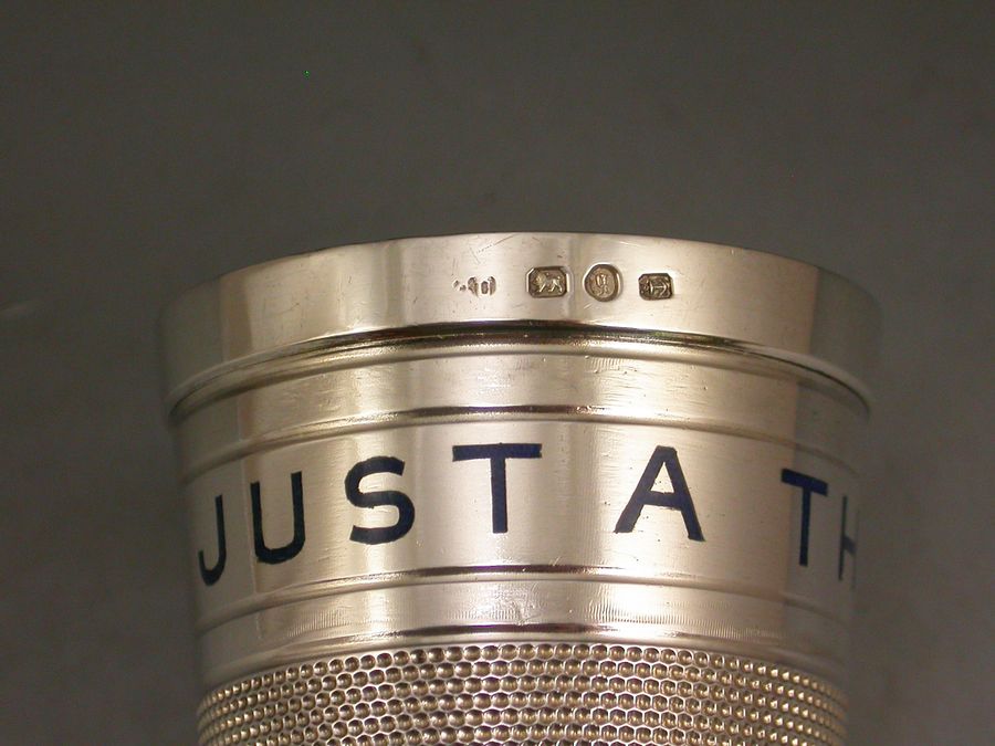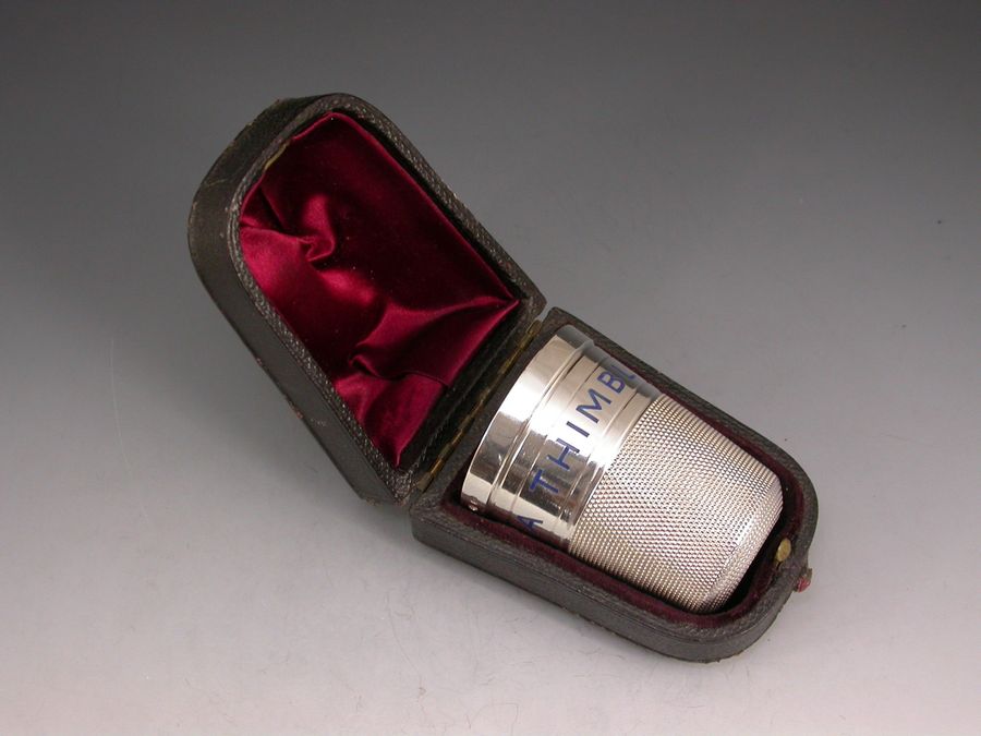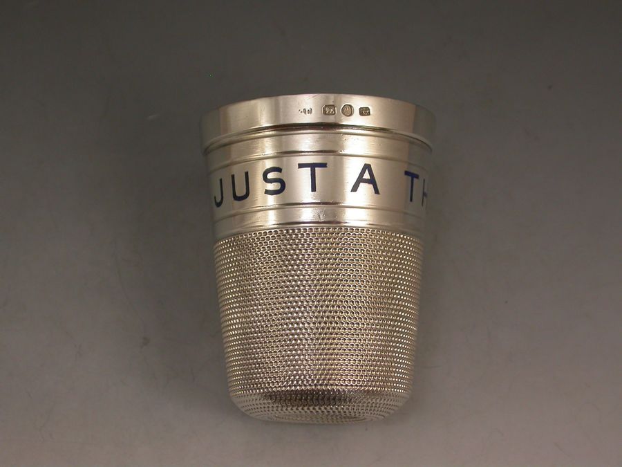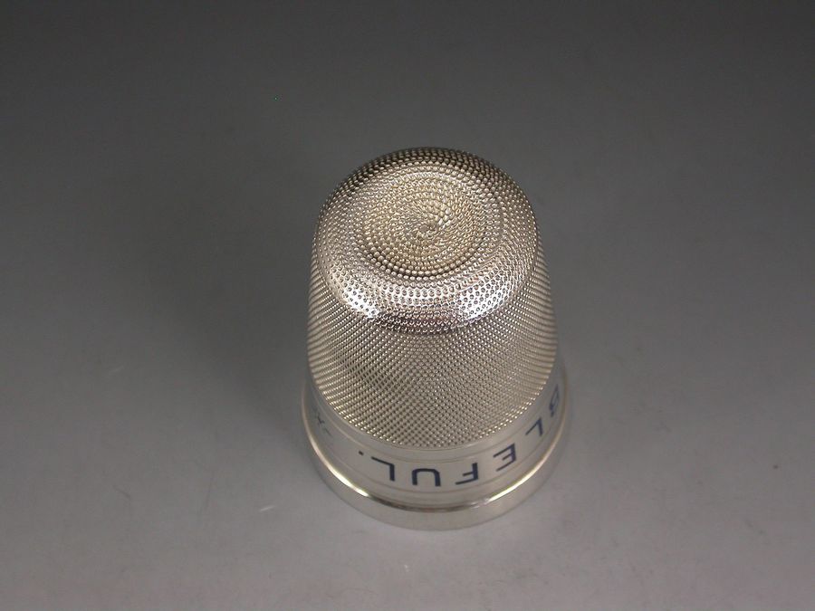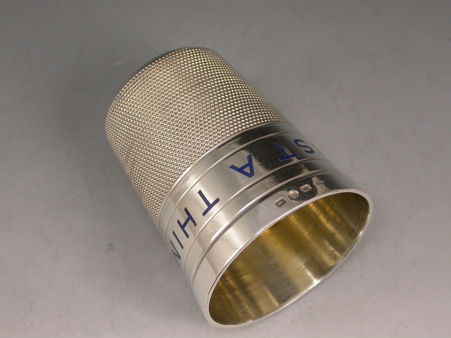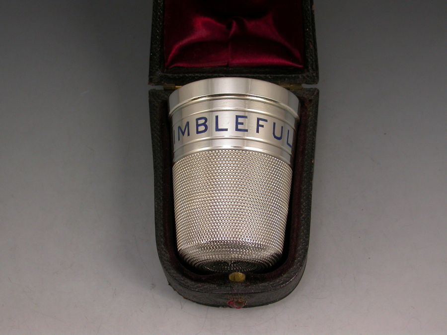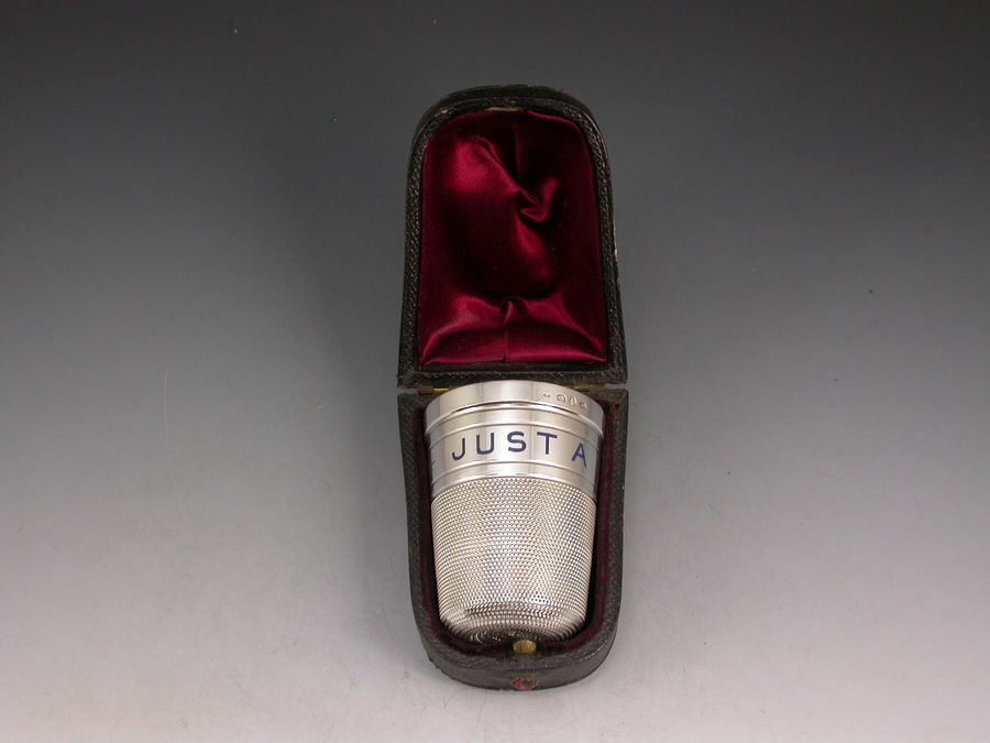 A rare Victorian novelty silver and enamel Tot Cup made in the form of a large Thimble, with the enamel legend: ""Just A Thimbleful"". Complete with original silk and velvet lined leather case.
