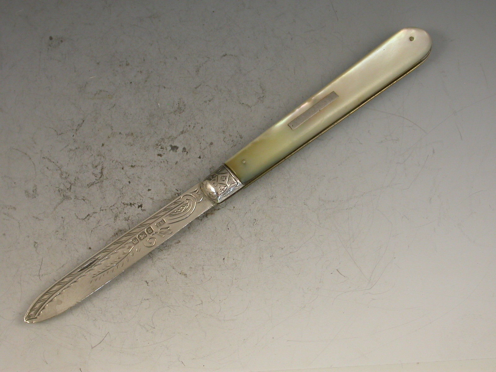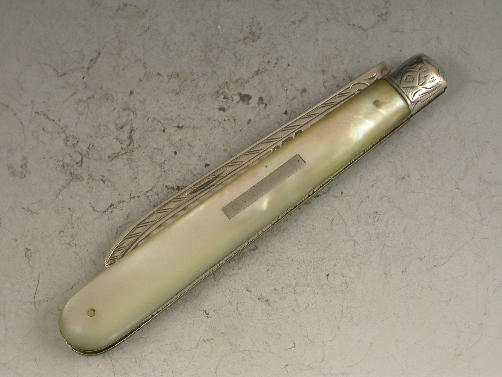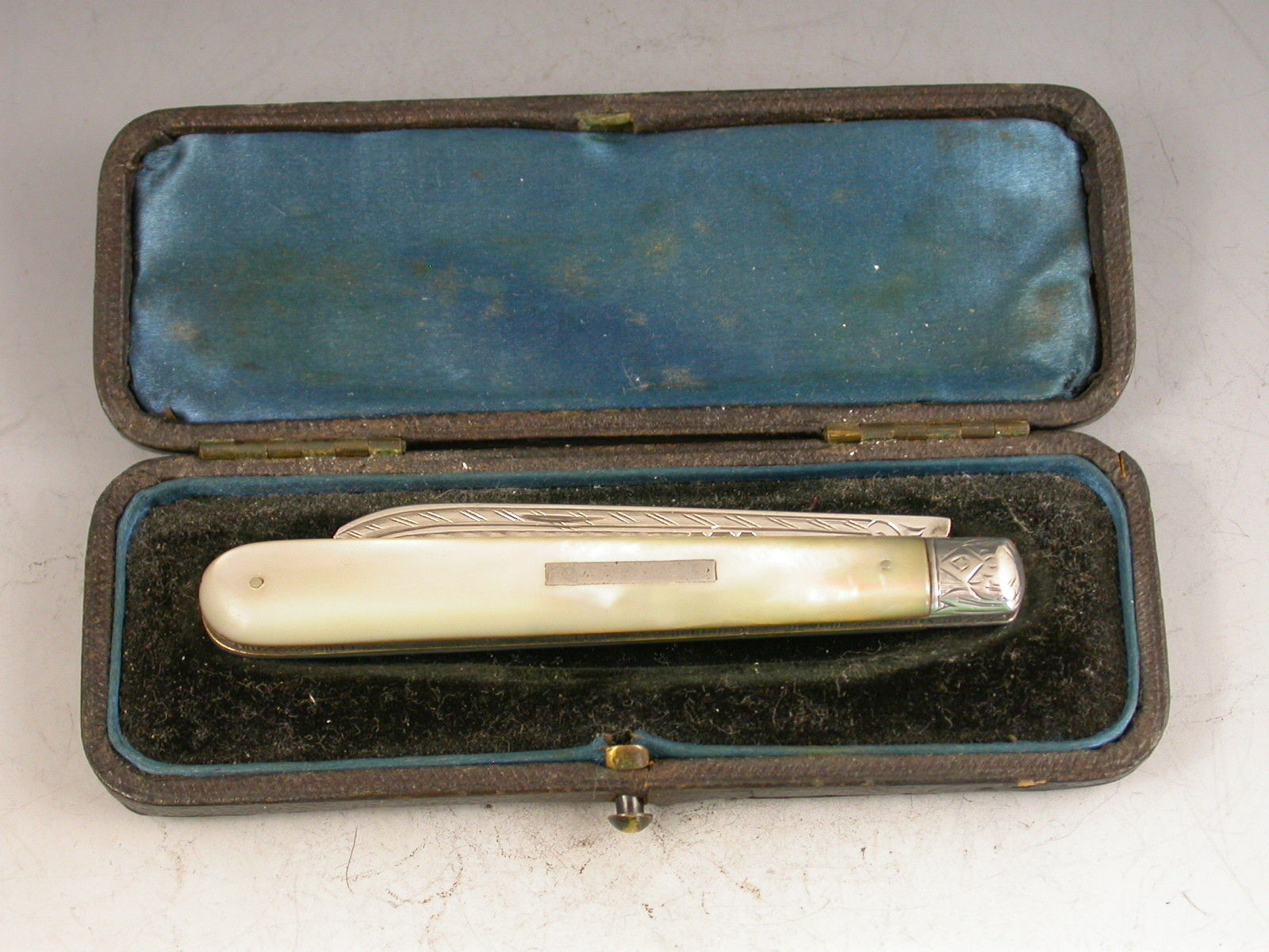 Victorian cased silver and mother of pearl folding Fruit Knife, with plain mother of pearl handles inset with a vacant rectangular silver cartouche, the blade with engraved decoration in the Georgian style.