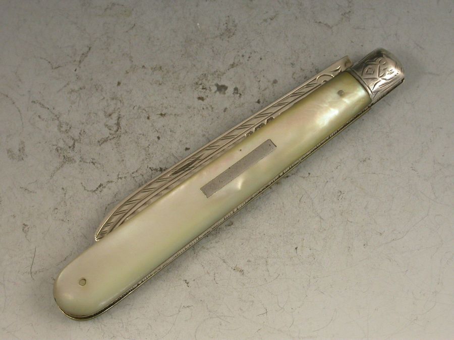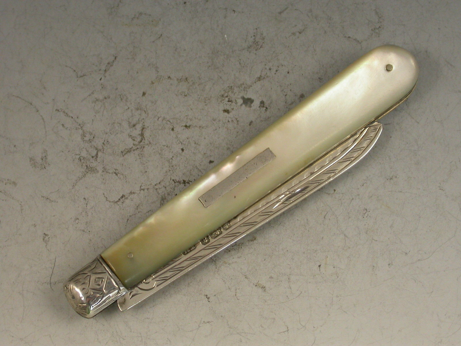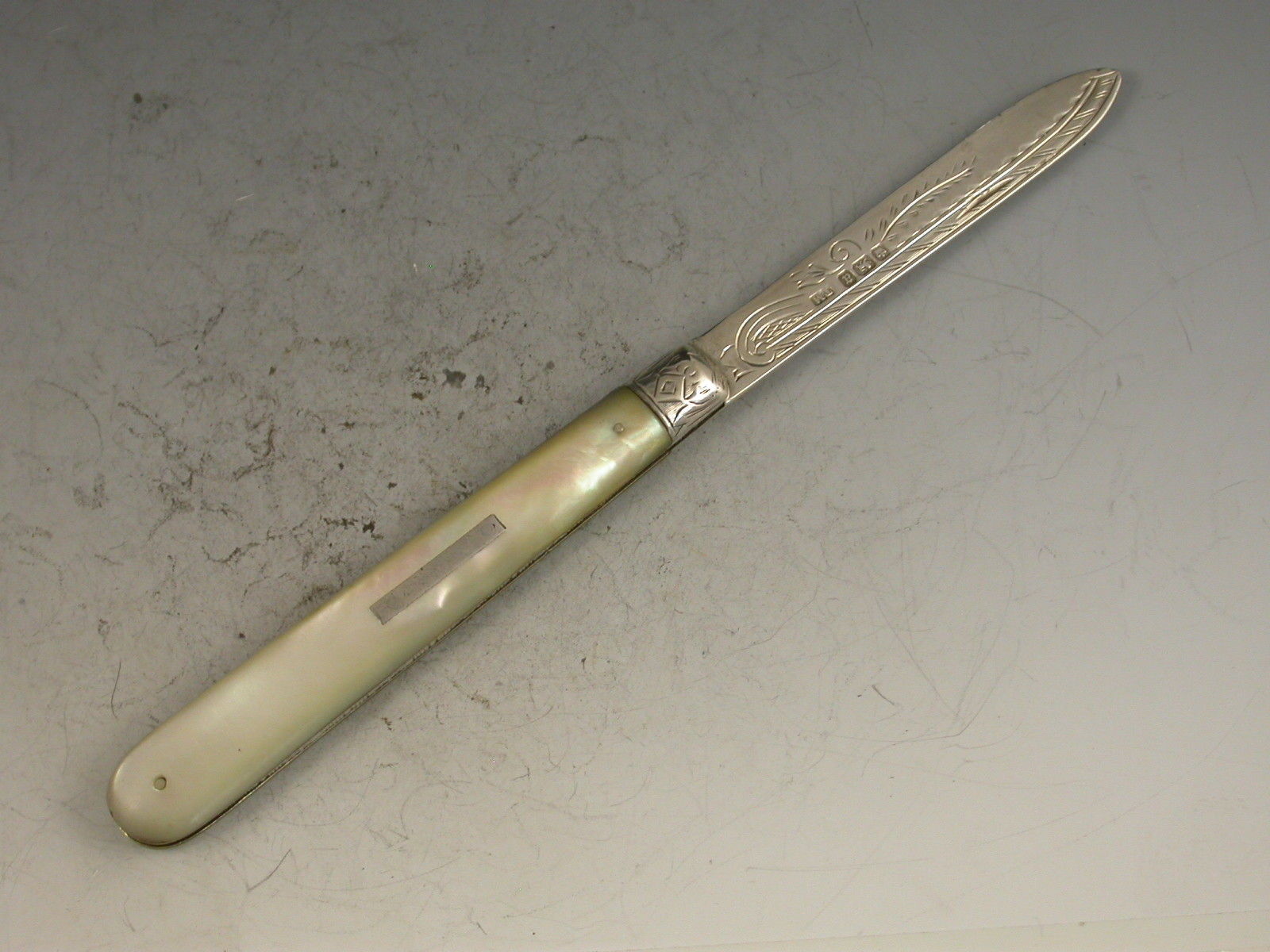 Victorian cased silver and mother of pearl folding Fruit Knife, with plain mother of pearl handles inset with a vacant rectangular silver cartouche, the blade with engraved decoration in the Georgian style.