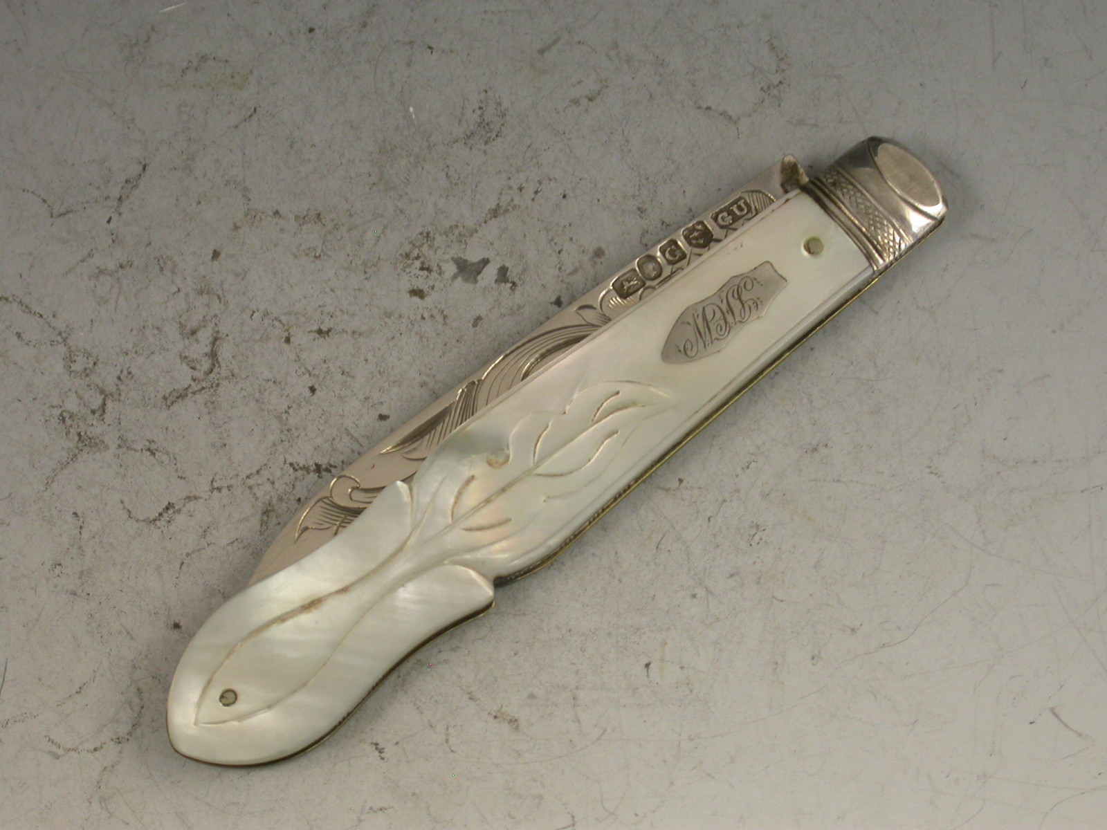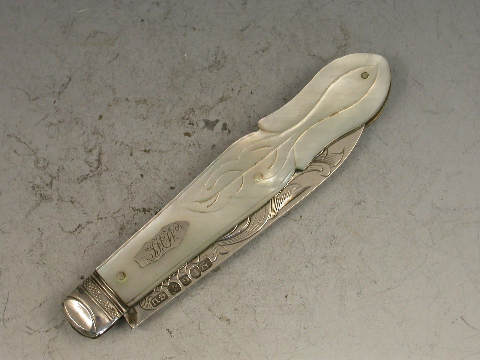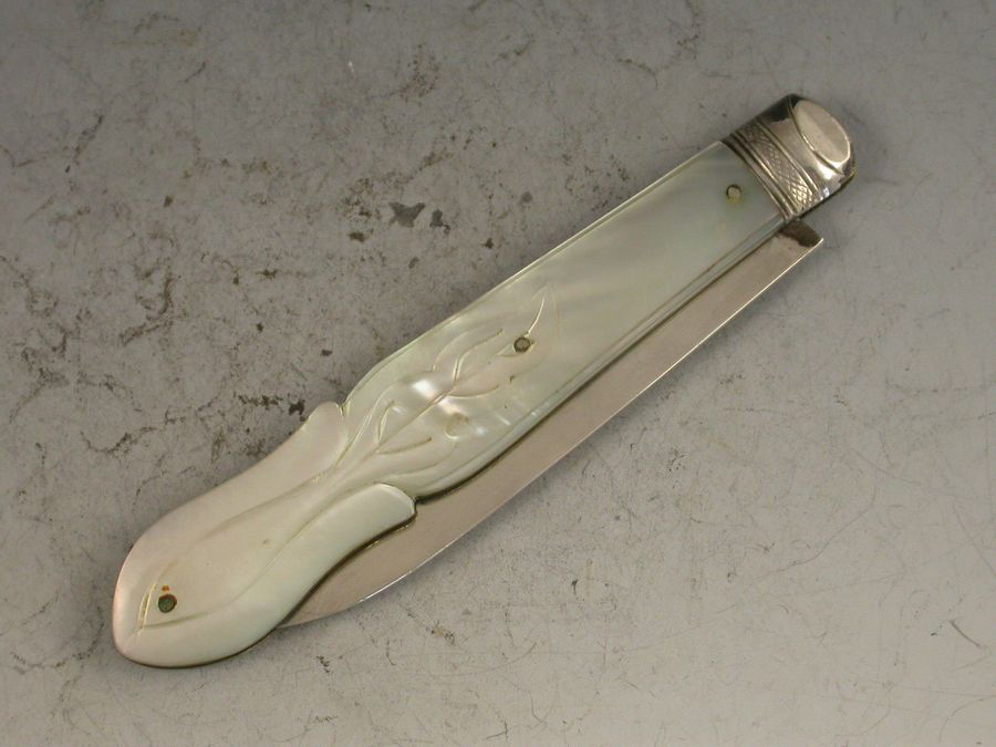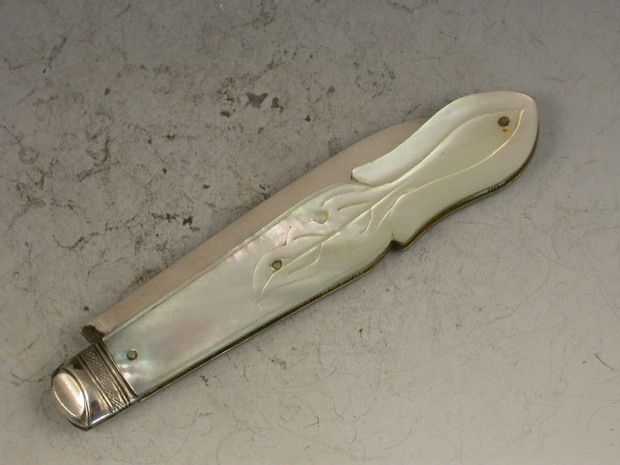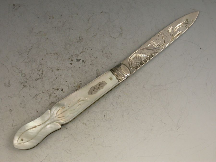 A good Victorian silver and mother of pearl folding Fruit Knife, the shaped mother of pearl handles engraved with foliate devices and inset with a shaped silver cartouche, the silver blade engraved with a foliate scroll.