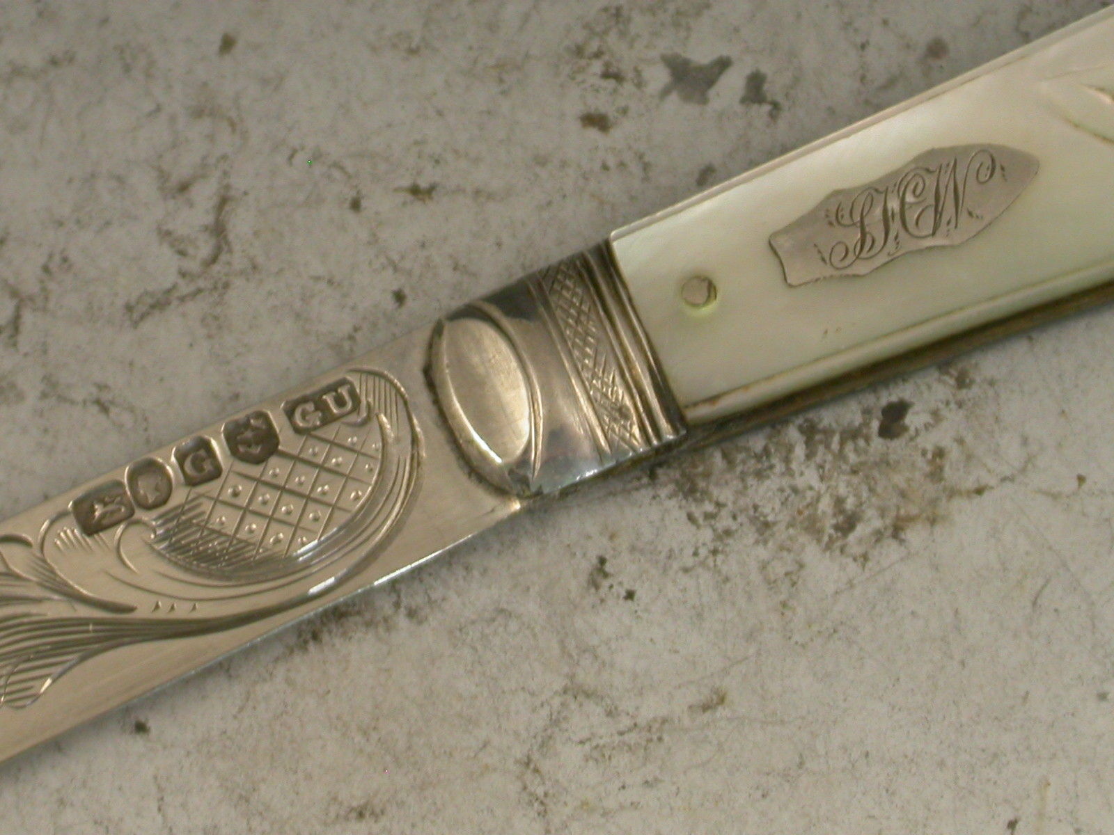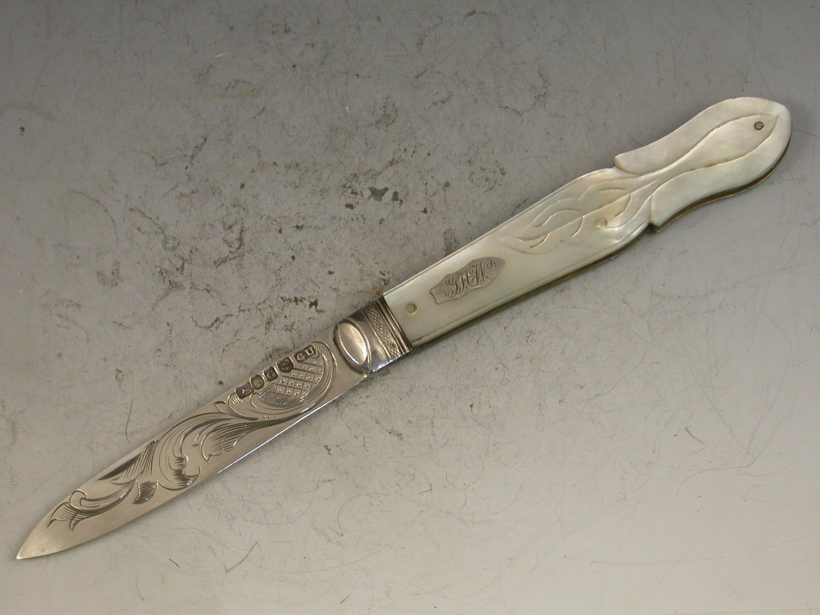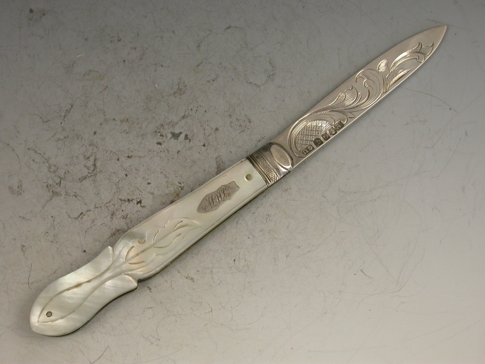 A good Victorian silver and mother of pearl folding Fruit Knife, the shaped mother of pearl handles engraved with foliate devices and inset with a shaped silver cartouche, the silver blade engraved with a foliate scroll.