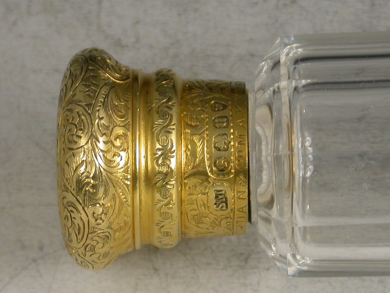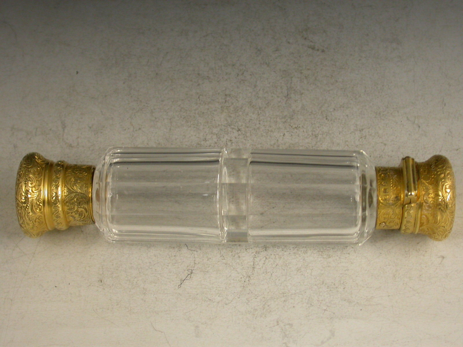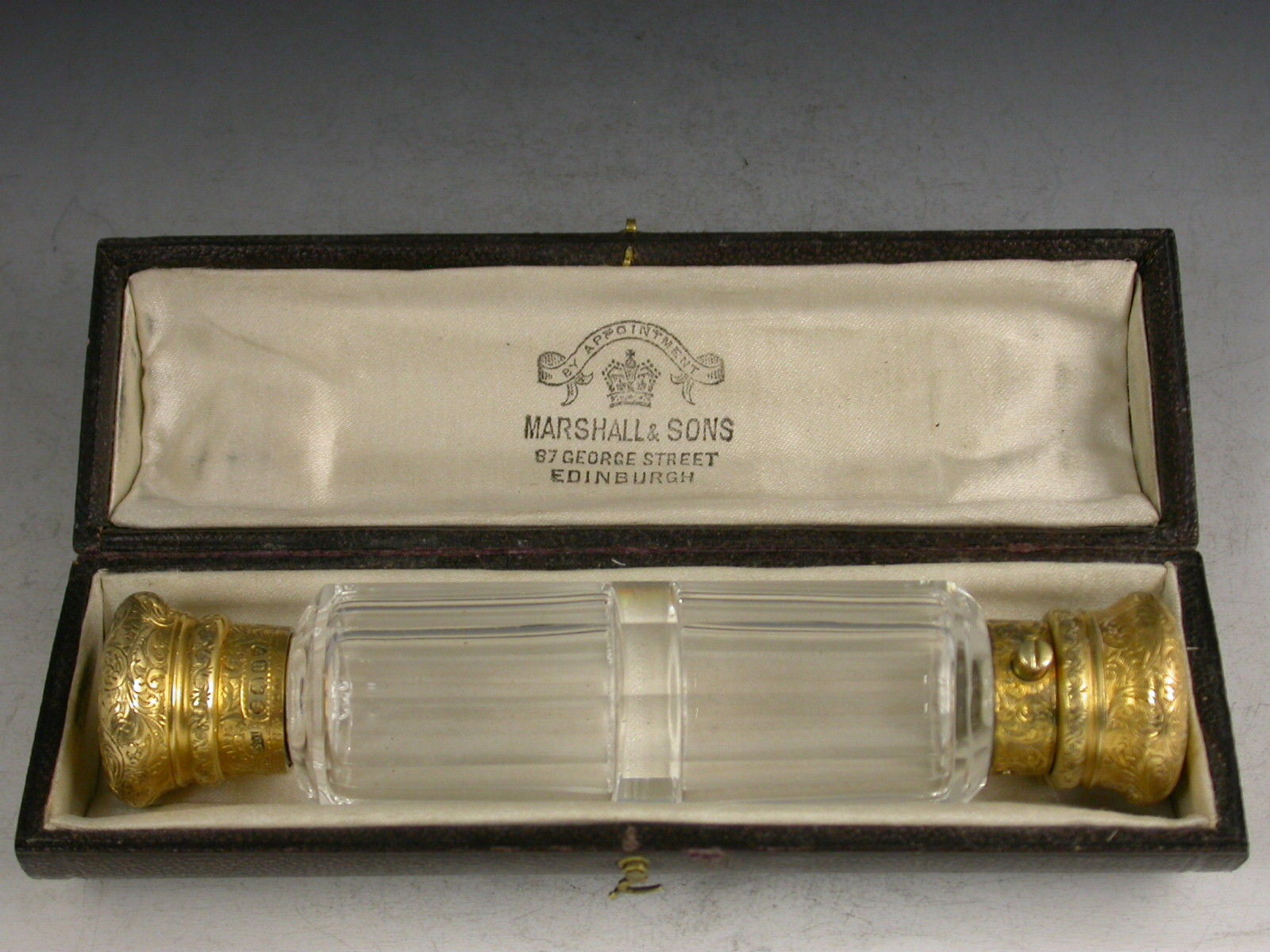 A fine quality Victorian silver gilt mounted double ended faceted clear glass Scent Bottle, one end with screw-off cover, the other with sprung hinged lid, both lids engraved with foliate scroll decoration and fully hallmarked. Complete with original tubular leather case with retailers badge for Marshall & Sons of Edinburgh.
