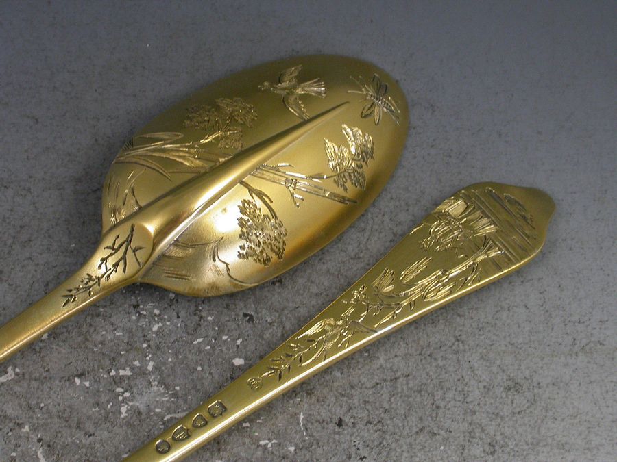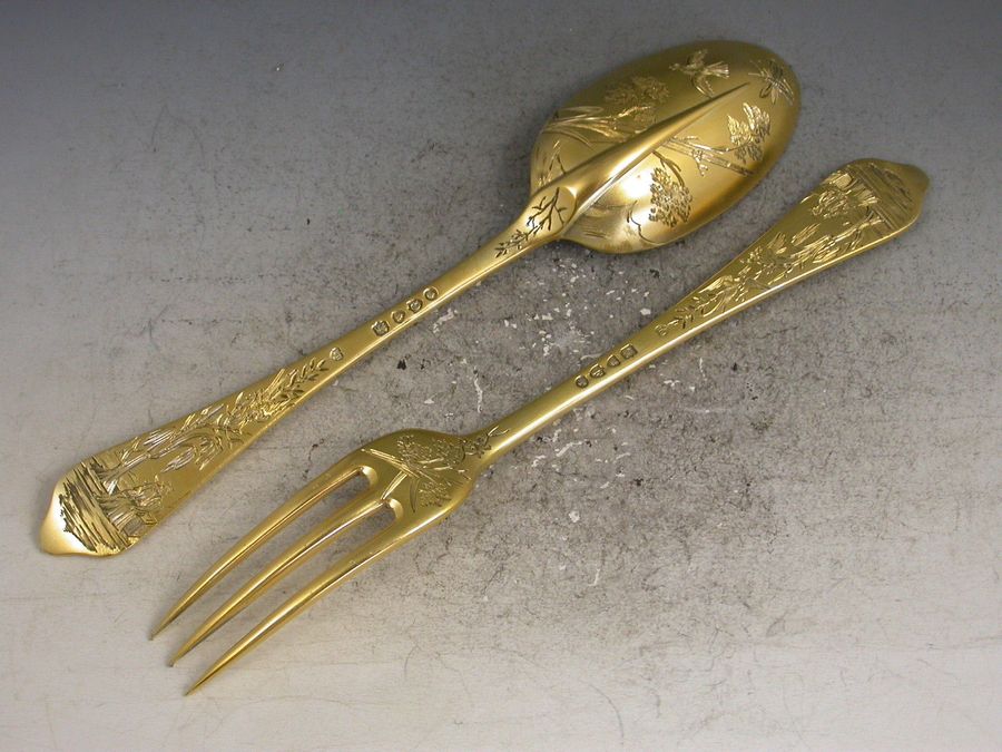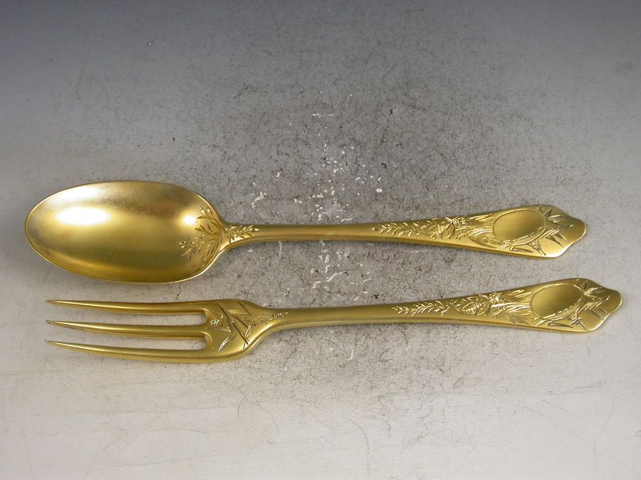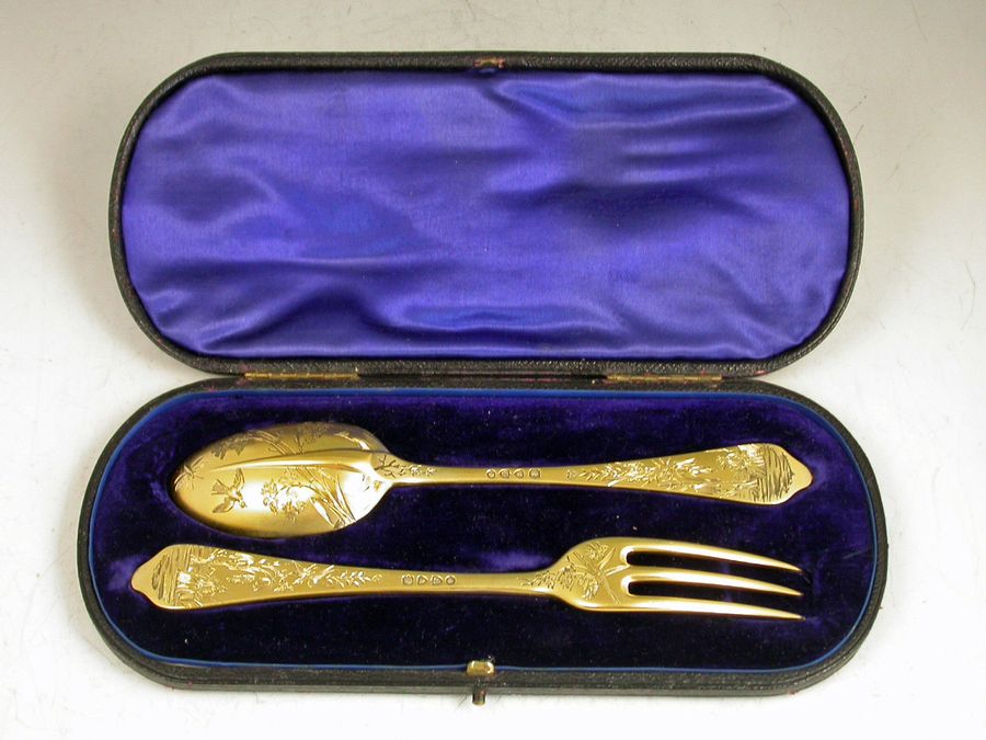 An extremely fine quality cased pair of Victorian silver gilt dognose pattern Christening Spoon and Fork with thick matt gilding and engraved with aesthetic style decoration including Oriental figures, birds and insects.