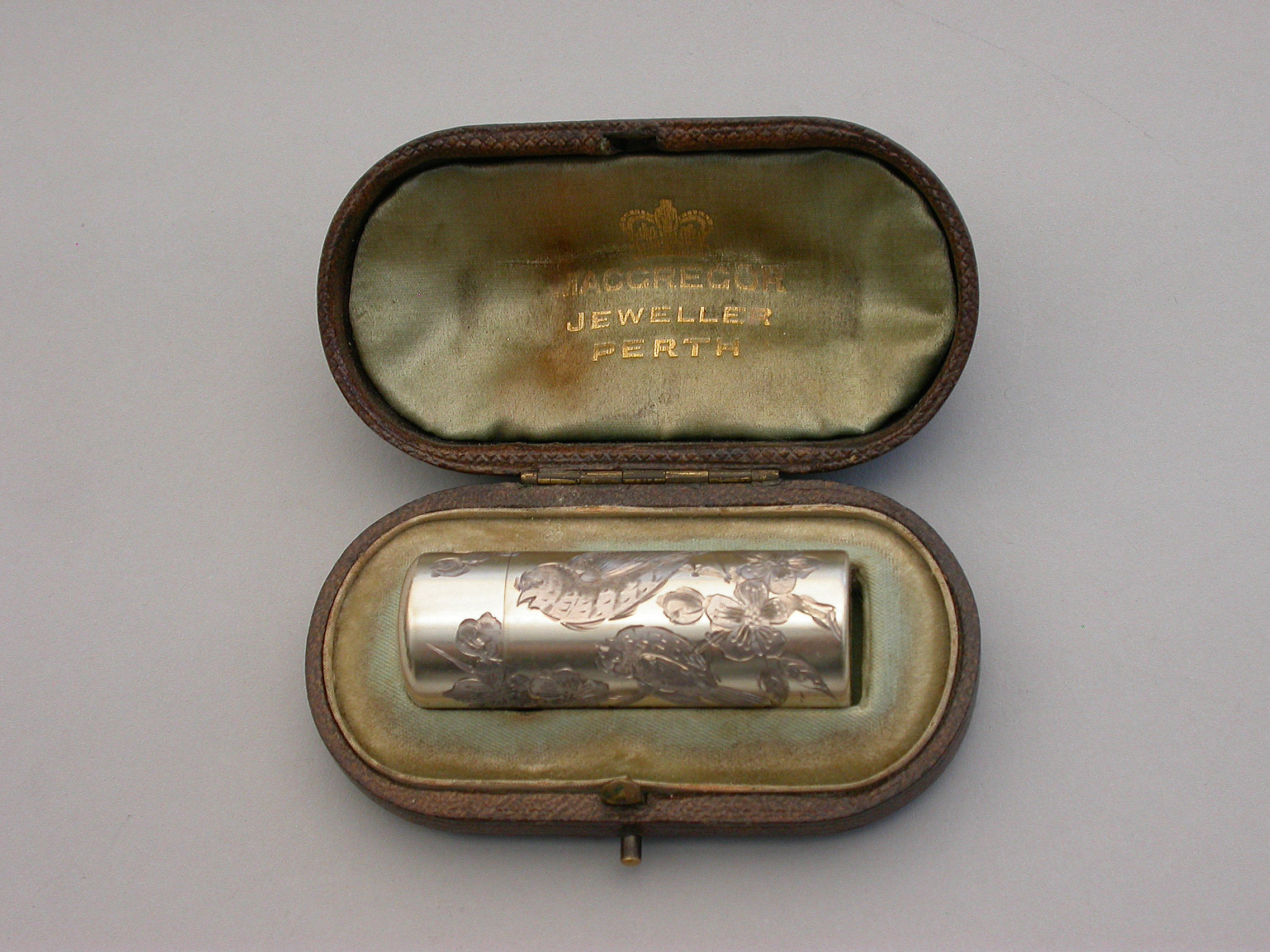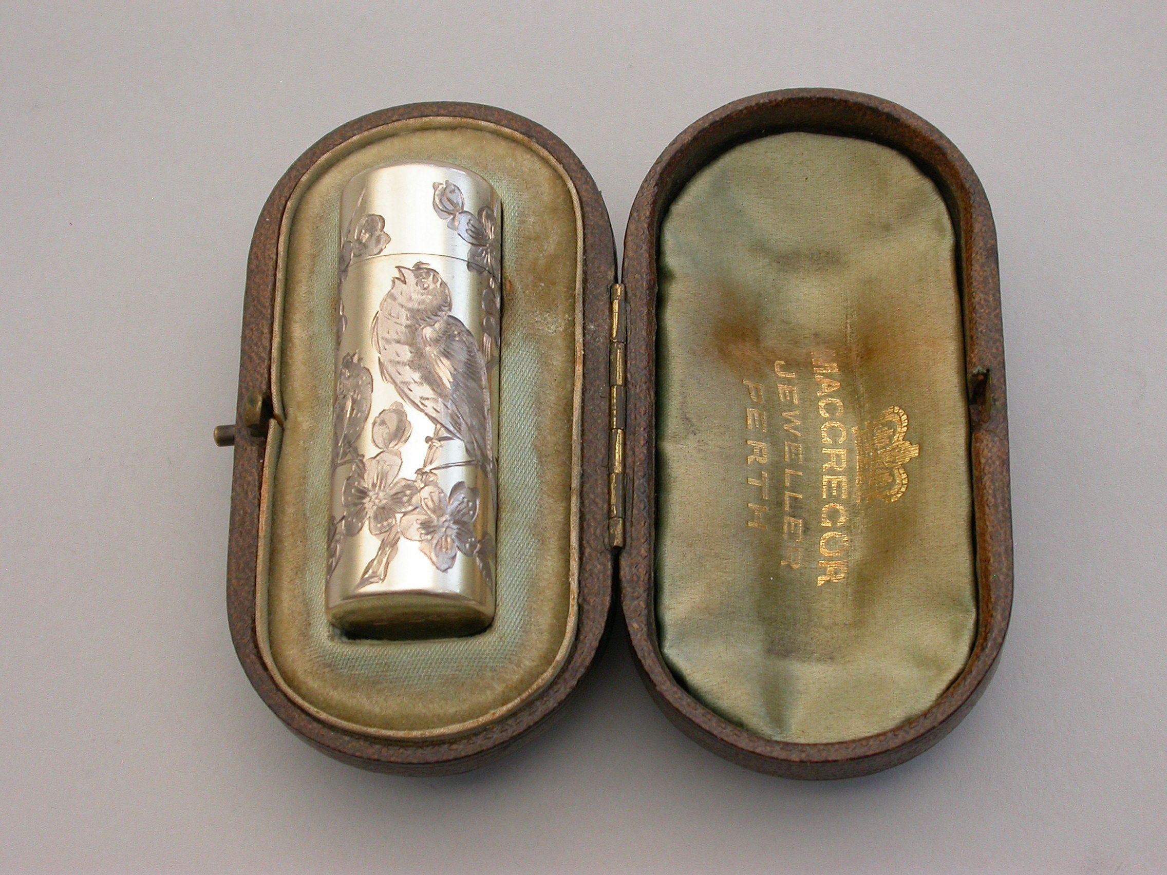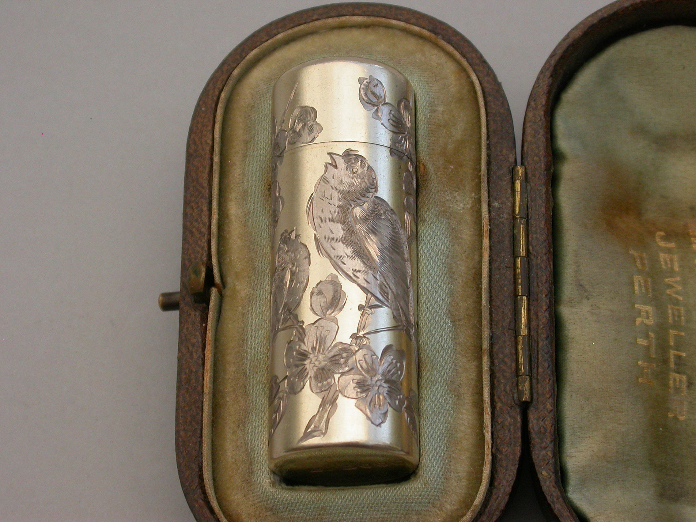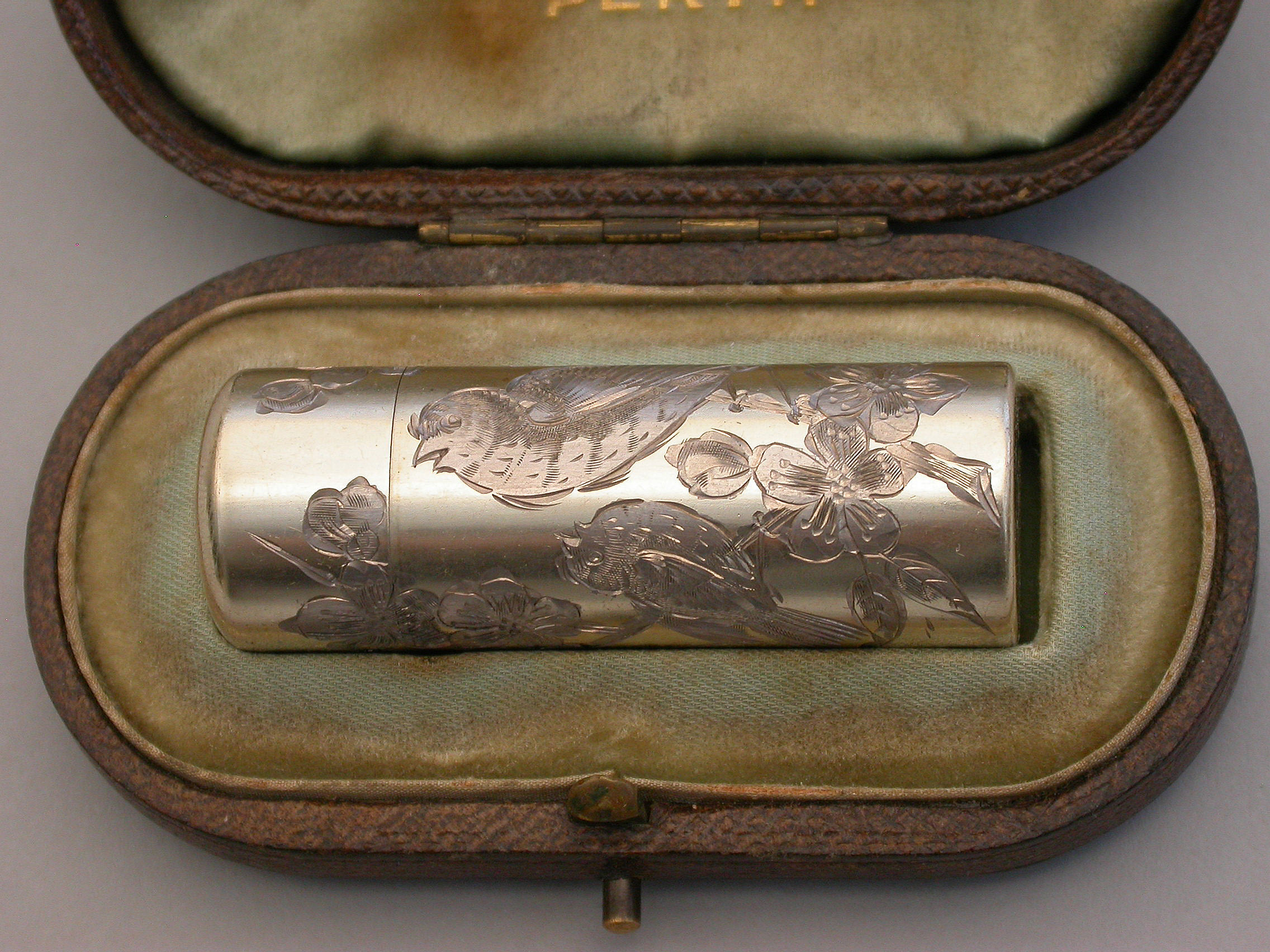 Victorian Cased Silver Gilt Engraved Scent Bottle - 'Birds & Insects'