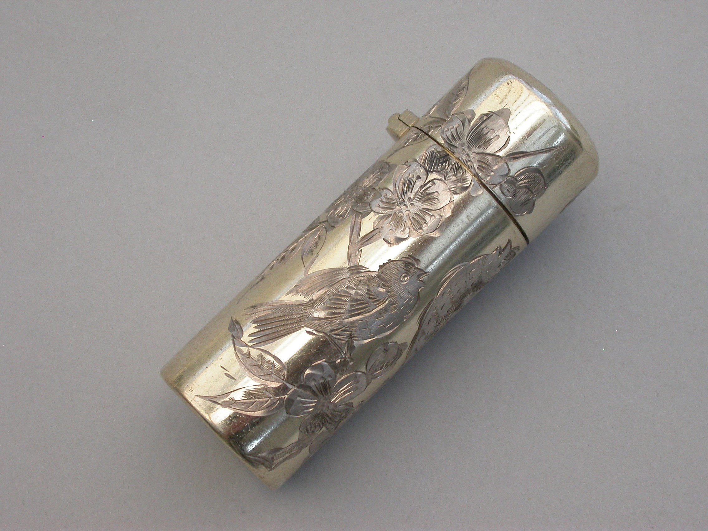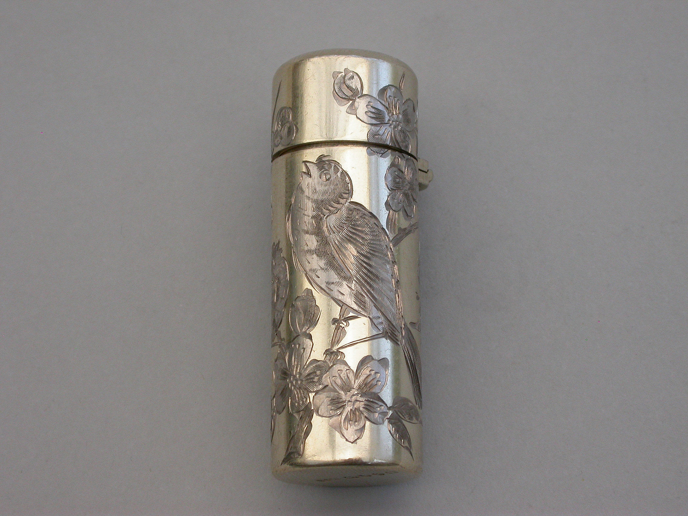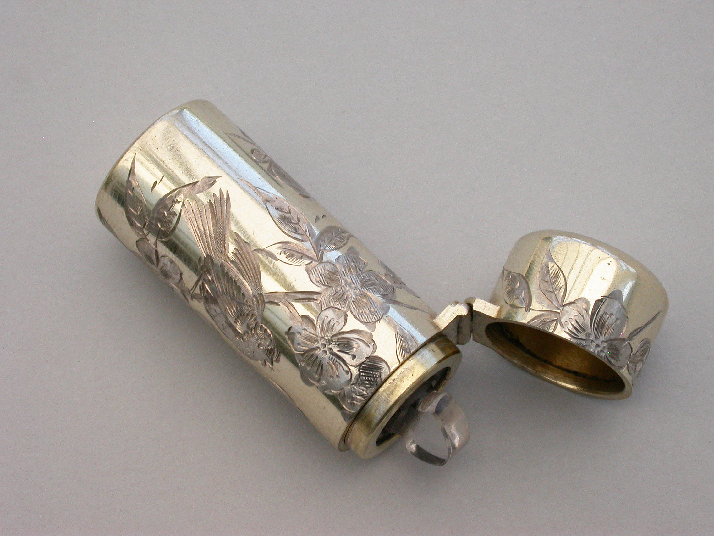 A good quality Victorian silver gilt Scent Bottle of cylindrical form with hinged lid and glass stopper, the body engraved in the Aesthetic style with birds and insects amongst foliage. The lid engraved with contemporary initials. silver gilt interior.
