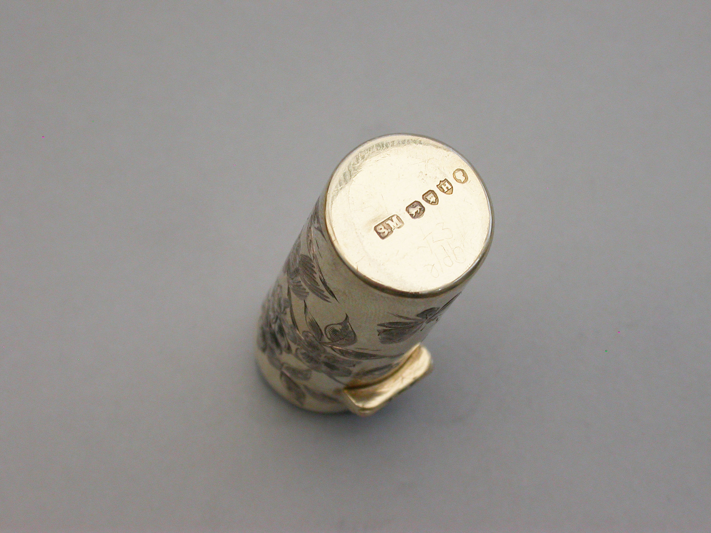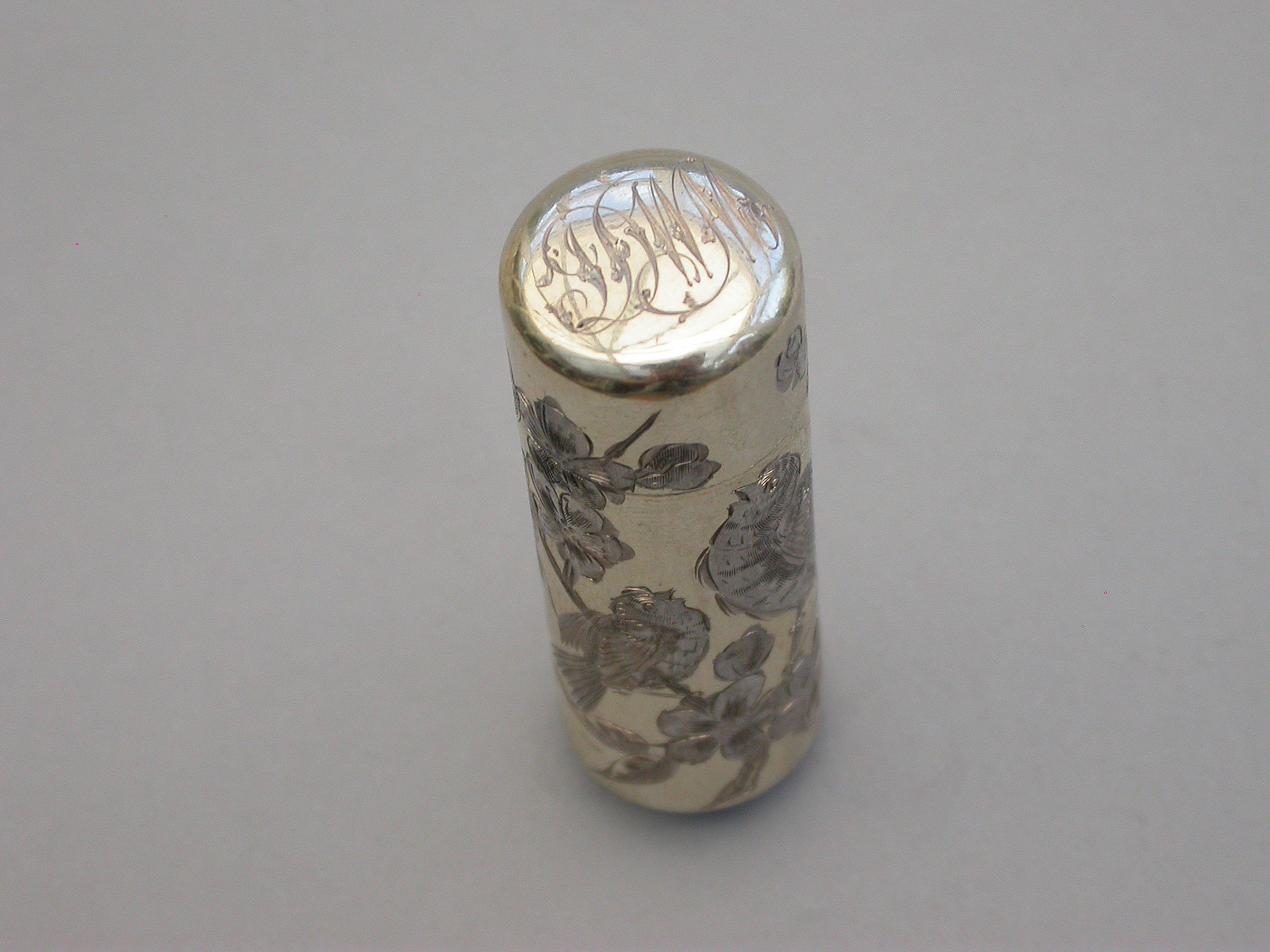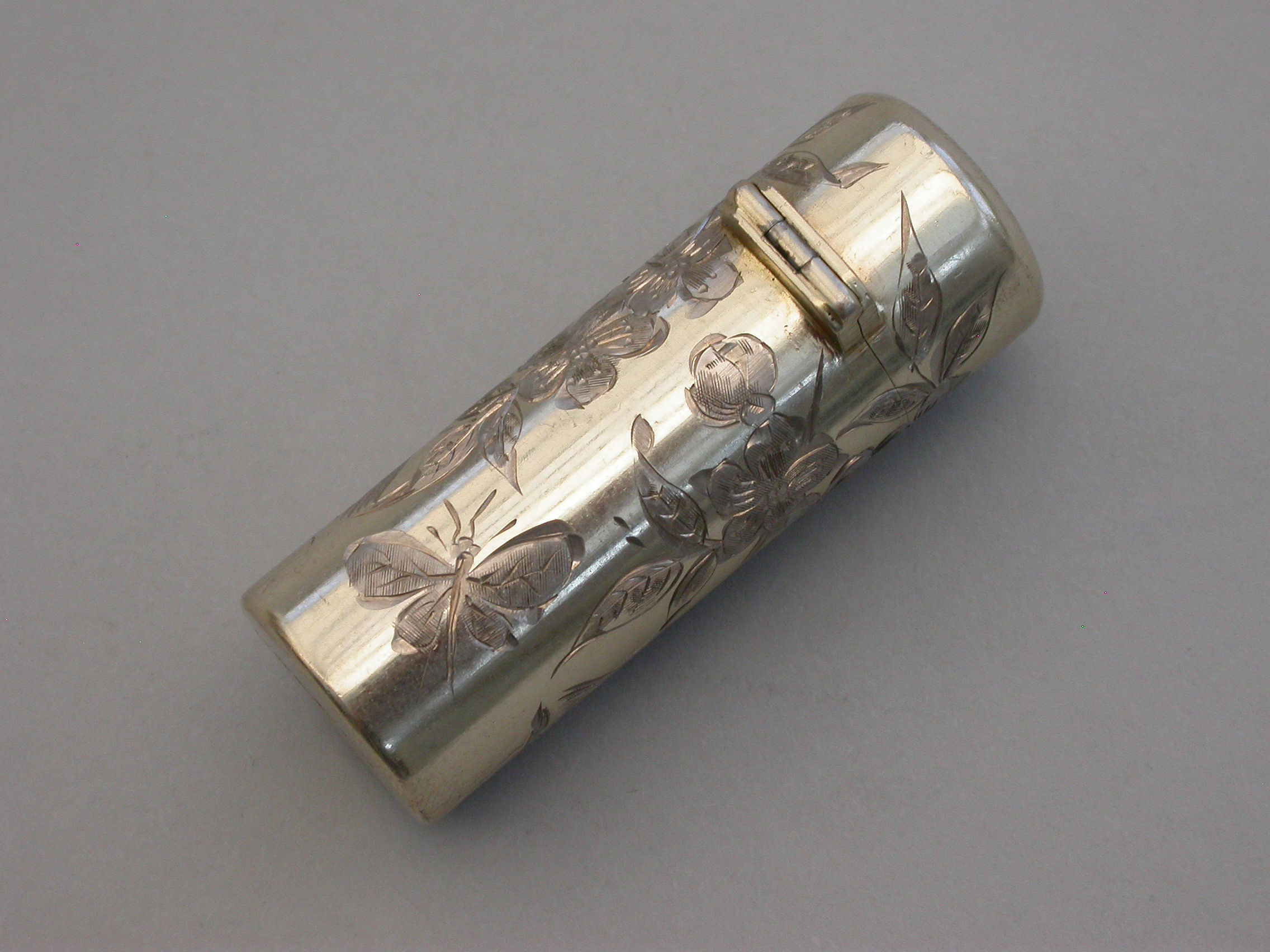 A good quality Victorian silver gilt Scent Bottle of cylindrical form with hinged lid and glass stopper, the body engraved in the Aesthetic style with birds and insects amongst foliage. The lid engraved with contemporary initials. silver gilt interior.