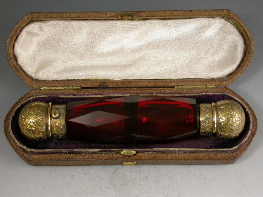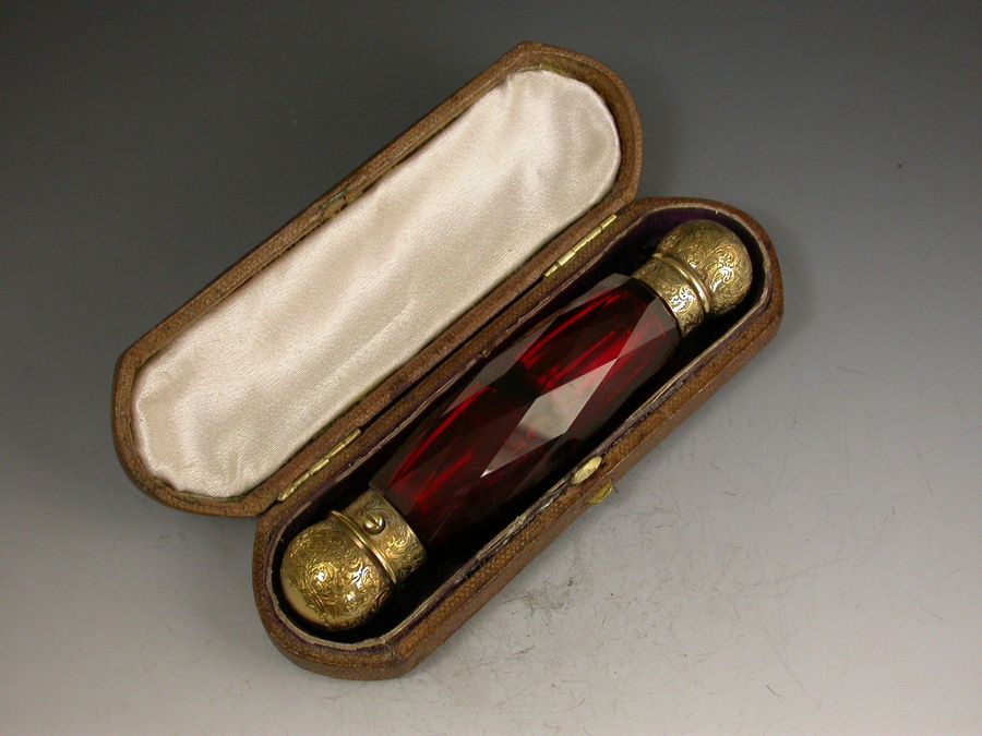Victorian Cased Silver Gilt Mounted Double Ended Ruby Glass Scent Bottle