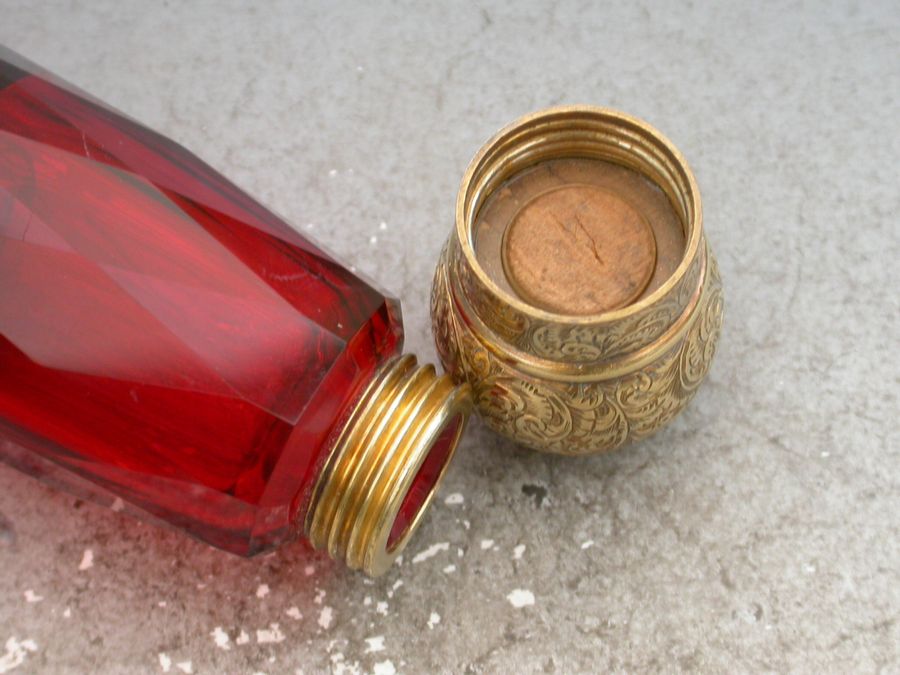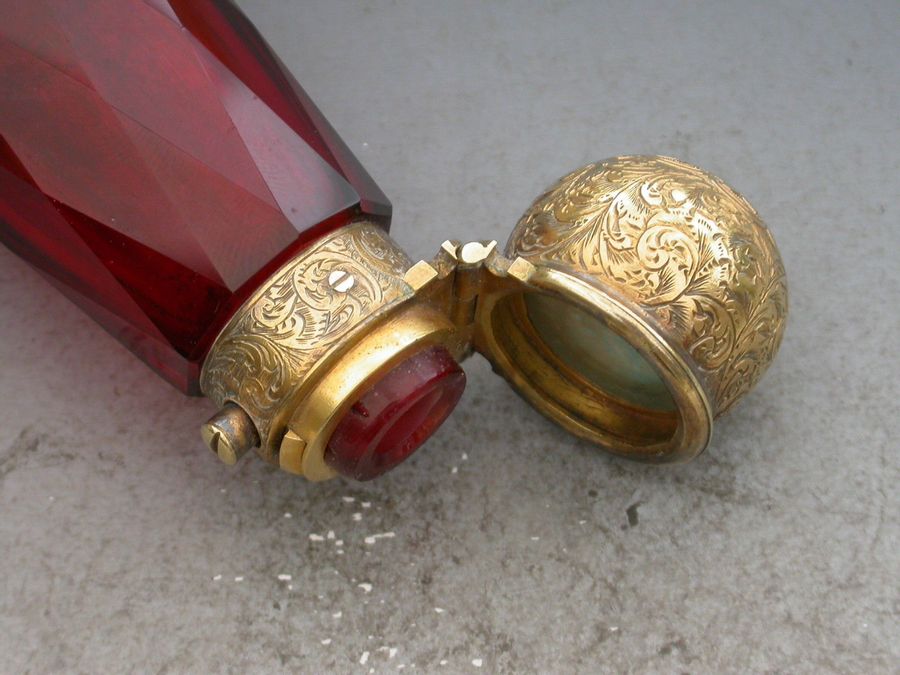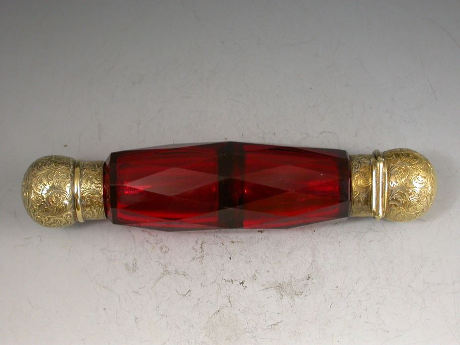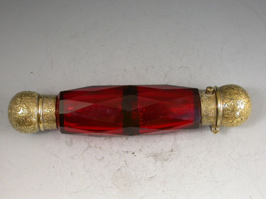 A good Victorian silver gilt mounted ruby glass double ended Scent Bottle with faceted glass body, one end with sprung hinged silver gilt lid sealed with glass covered metal plate, the other with screw off cap sealed with internal cork.