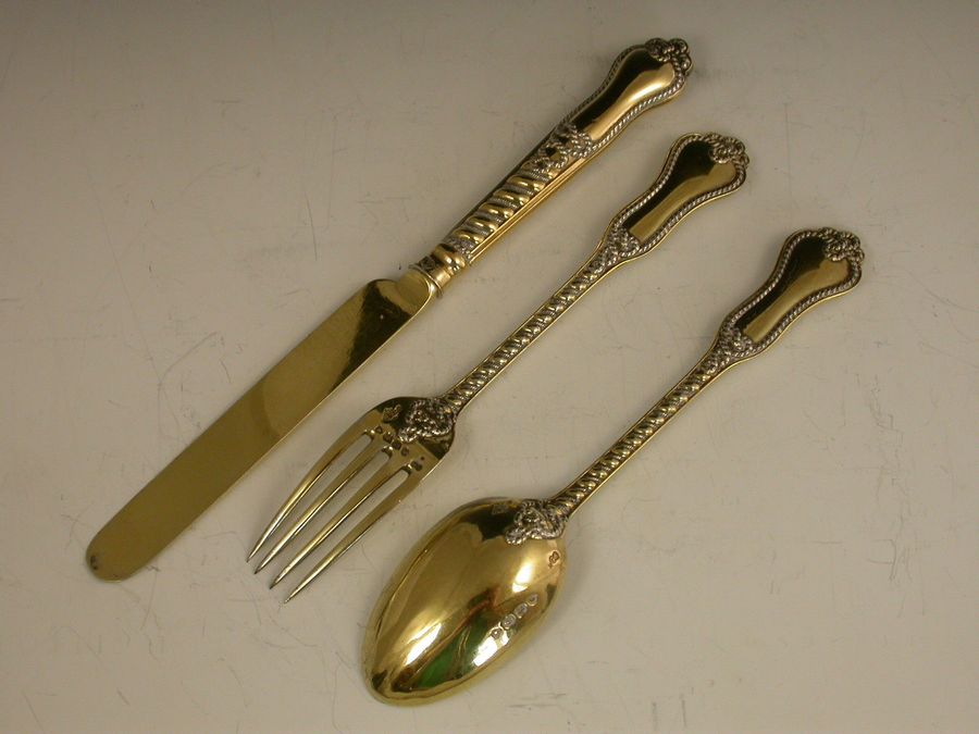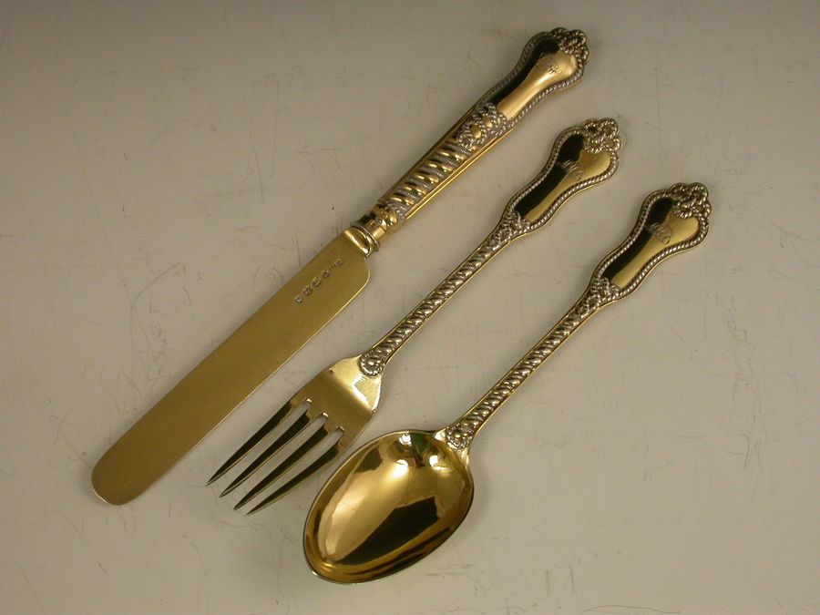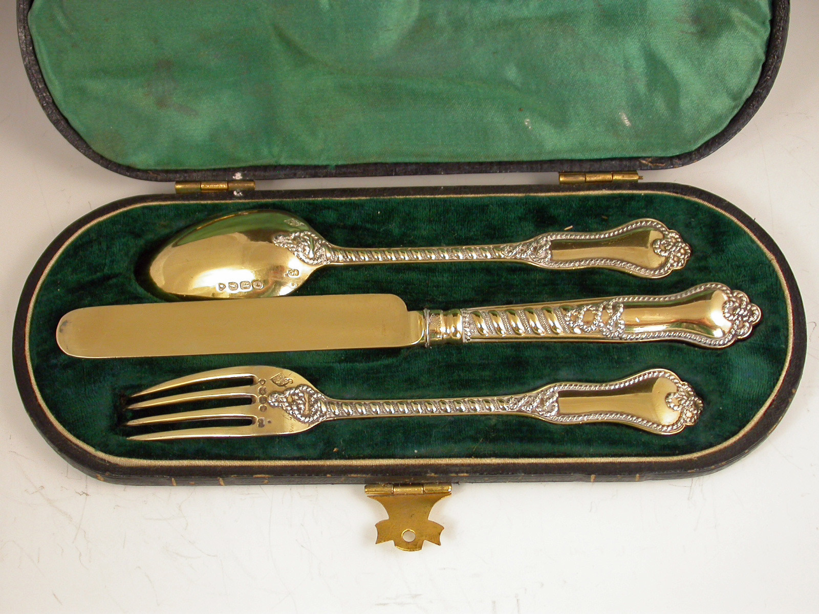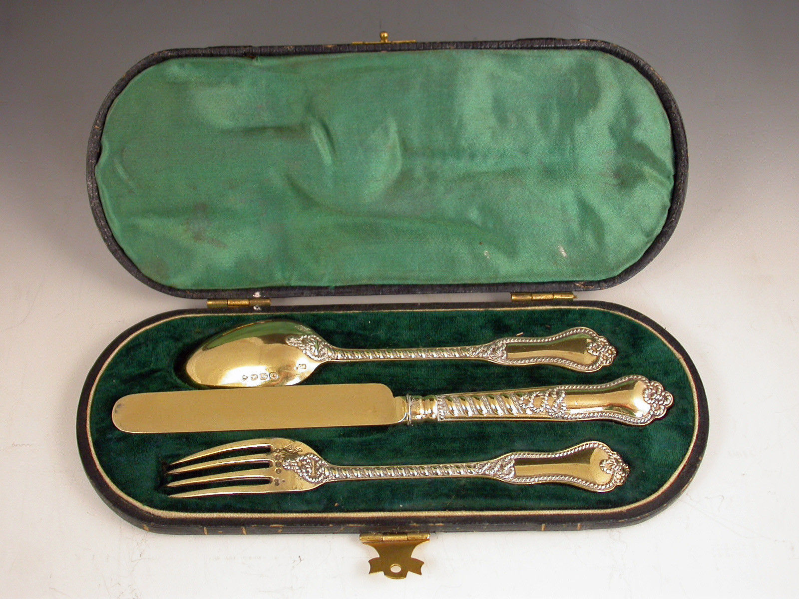 A rare and very fine quality Victorian cased silver gilt three piece Christening Set in Napier pattern. Complete with original silk and velvet lined fitted leather case with gilt metal mounts.