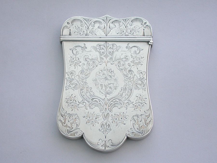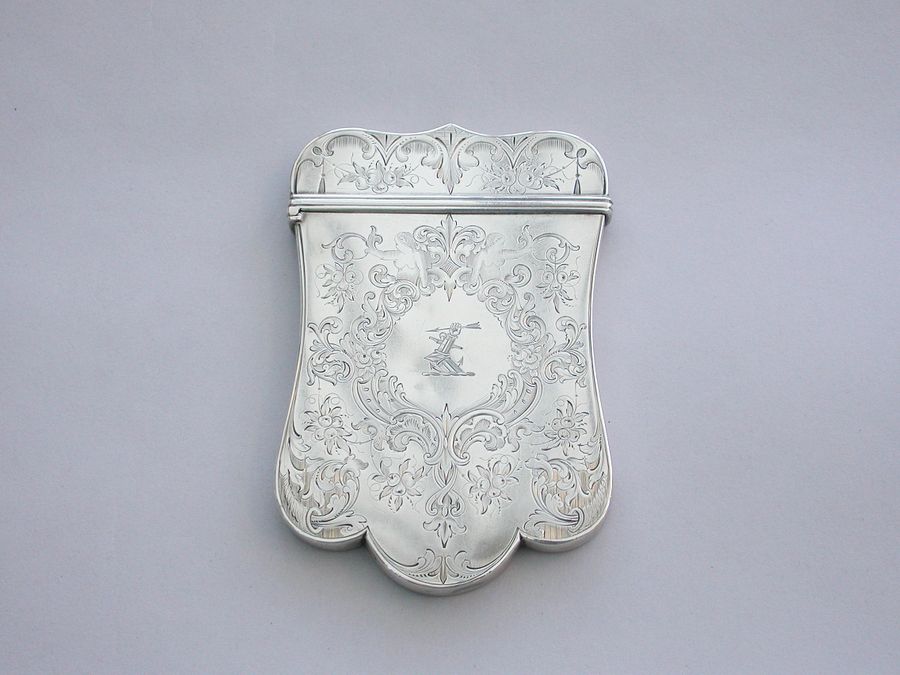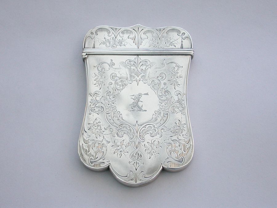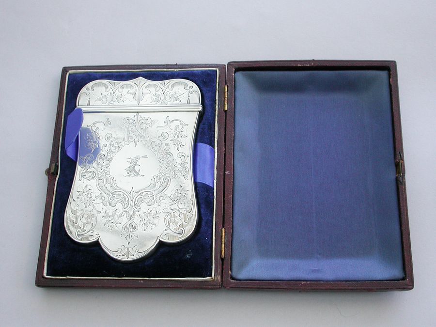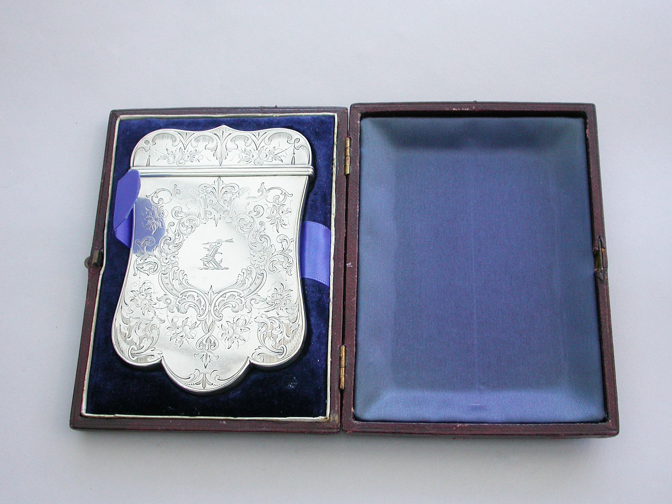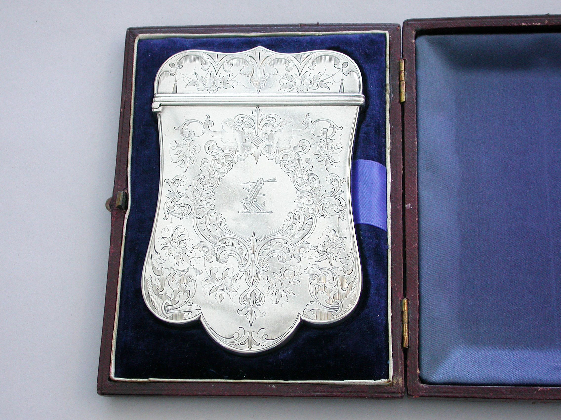 A good quality mid Victorian silver Card Case of unusual tongue shape, both sides very finely engraved with foliate scrolls, sprays of flowers, fruit and naked cherubs. A shaped cartouche to the front engraved with the armorial crest of the Fletcher family. Hinged lid and gilded interior. Complete with original silk and velvet lined fitted leather case.