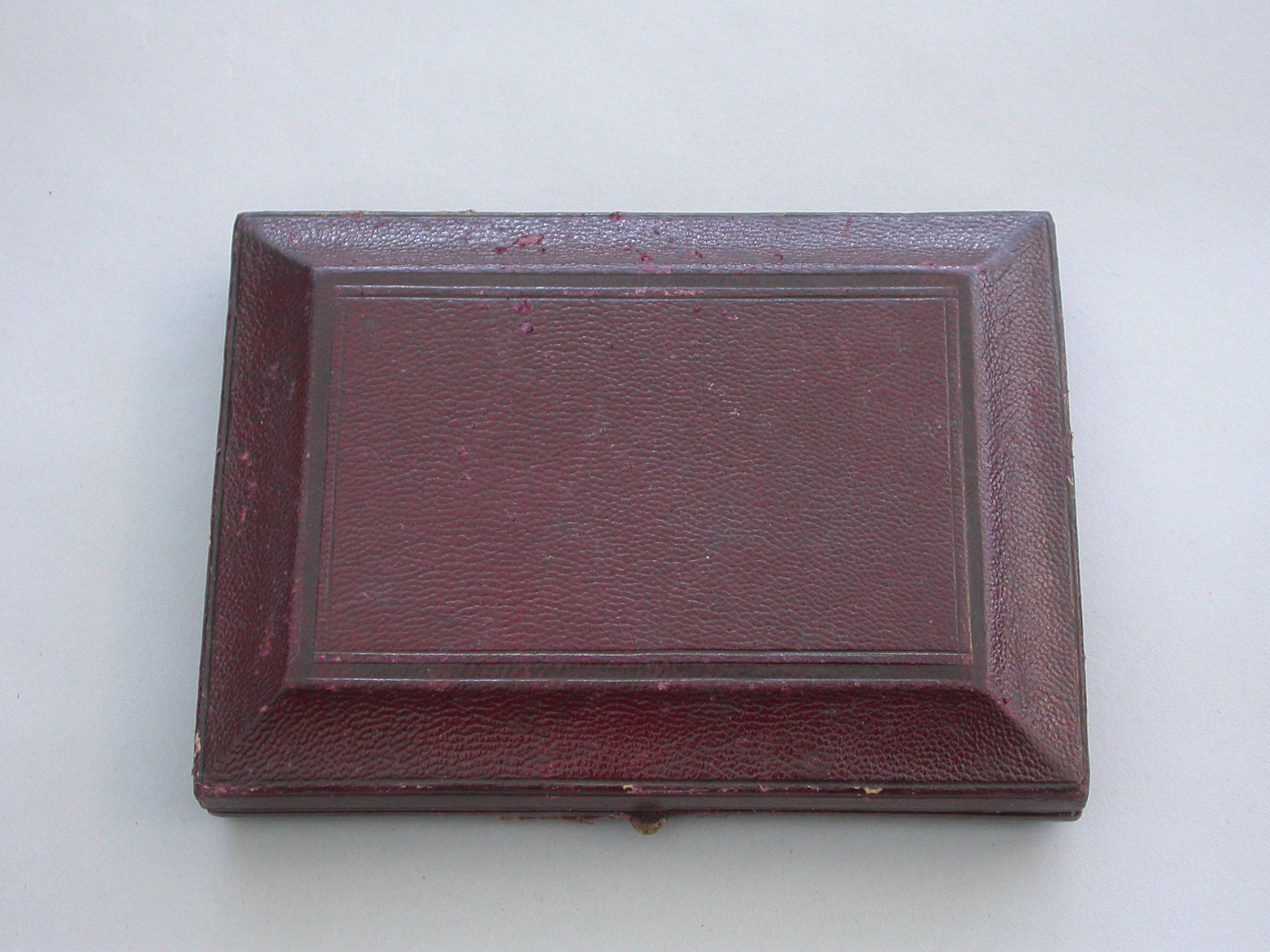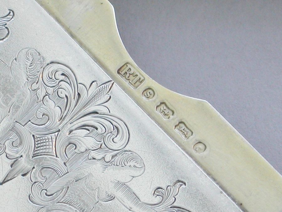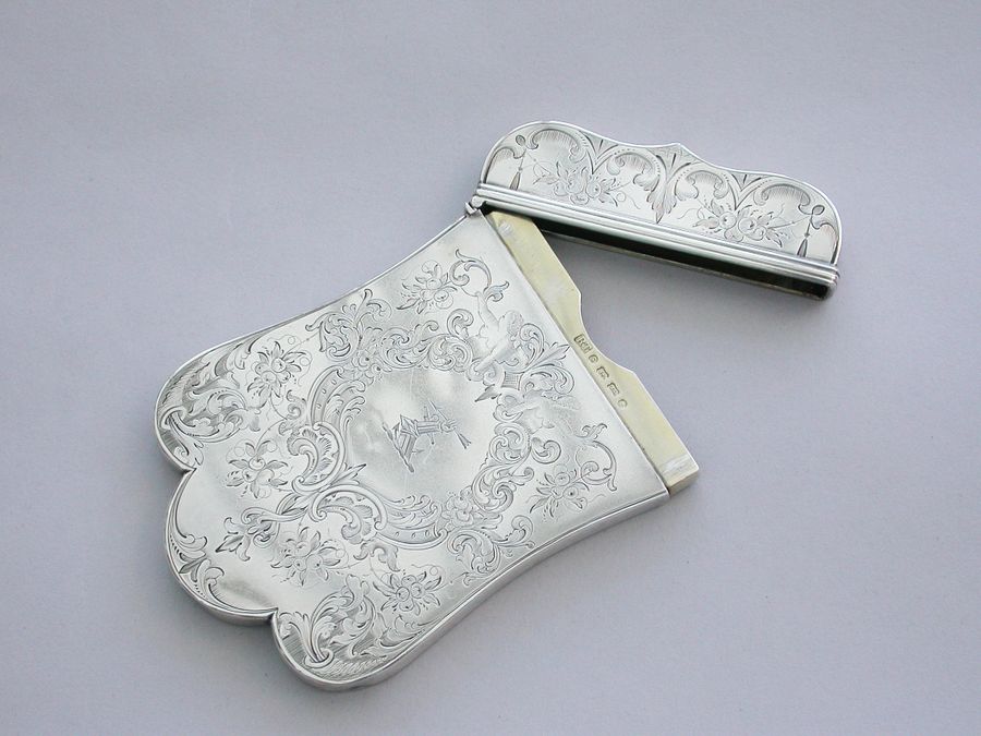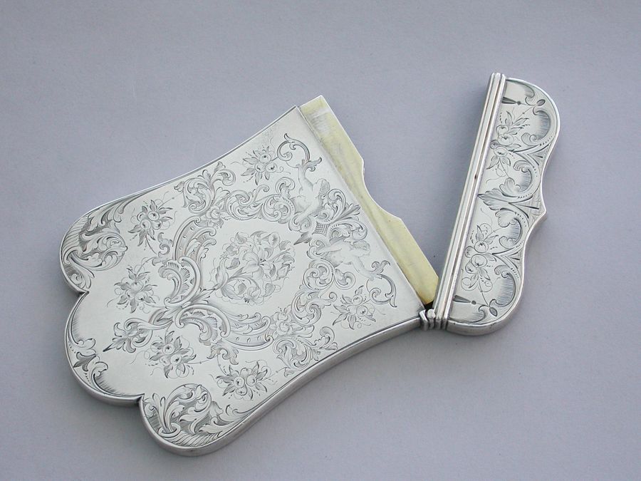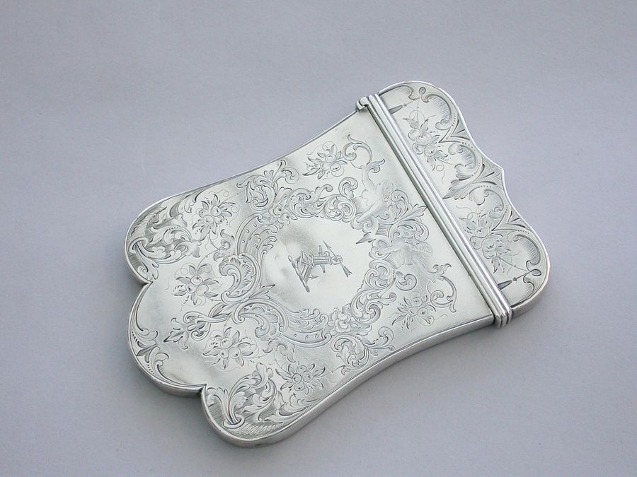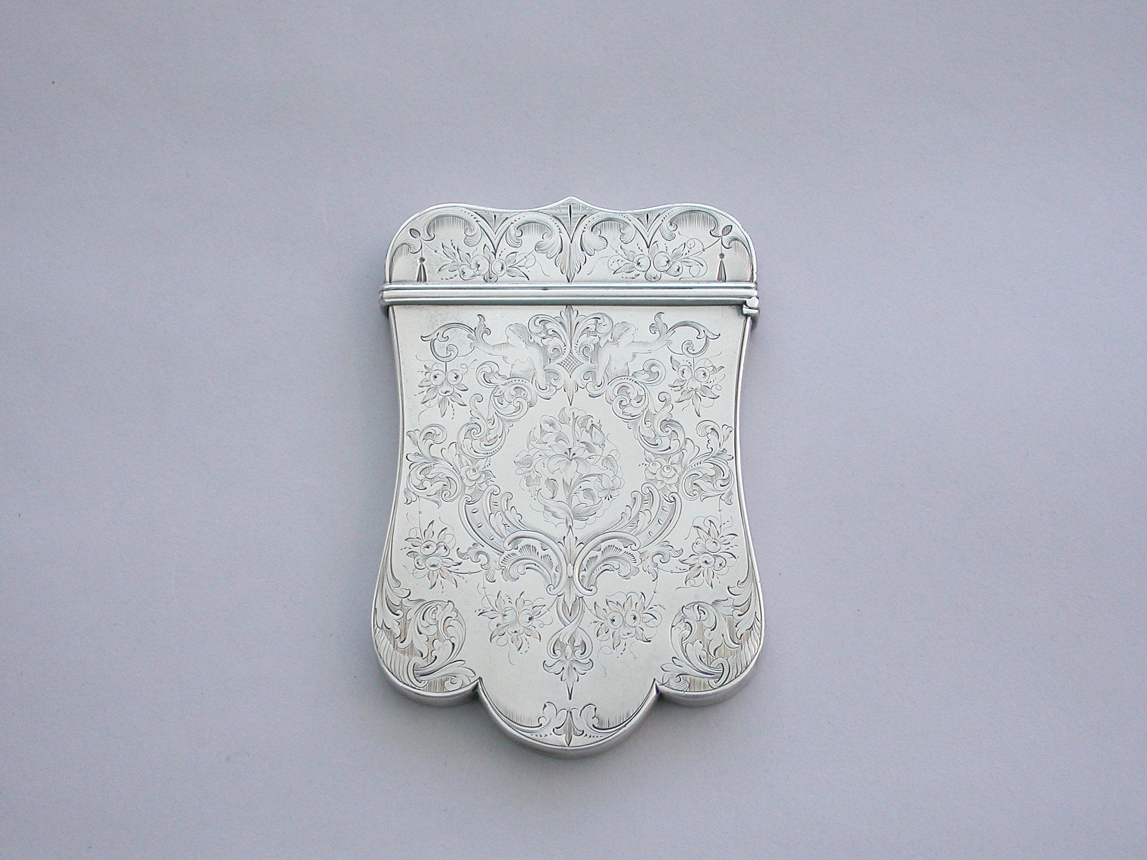 A good quality mid Victorian silver Card Case of unusual tongue shape, both sides very finely engraved with foliate scrolls, sprays of flowers, fruit and naked cherubs. A shaped cartouche to the front engraved with the armorial crest of the Fletcher family. Hinged lid and gilded interior. Complete with original silk and velvet lined fitted leather case.