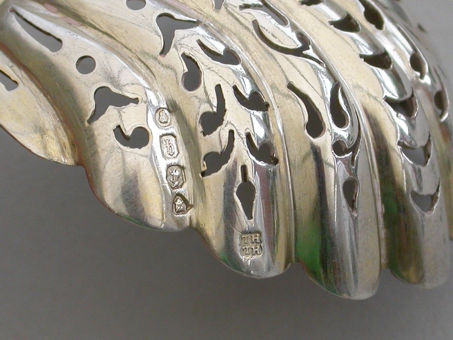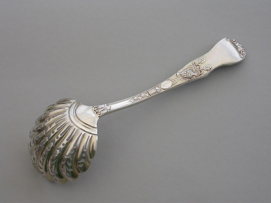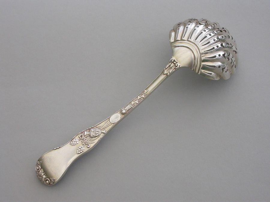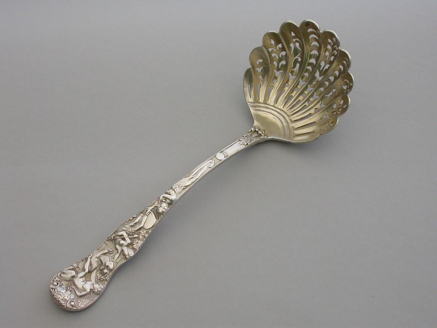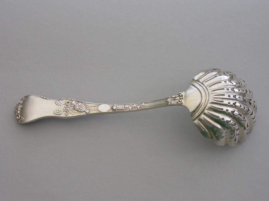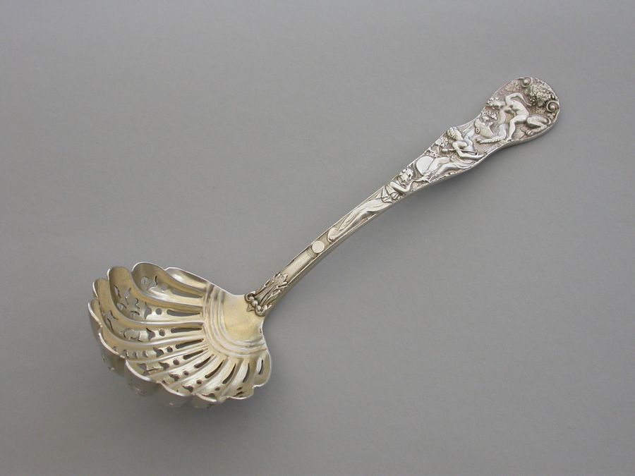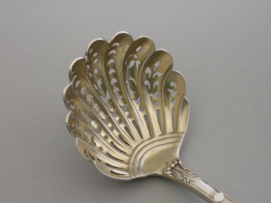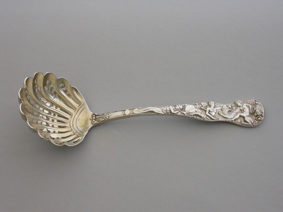 A fine quality Victorian cast silver Sugar Sifter Ladle in ""Bacchanalian"" pattern, with lightly gilded pierced fluted shell shaped bowl.