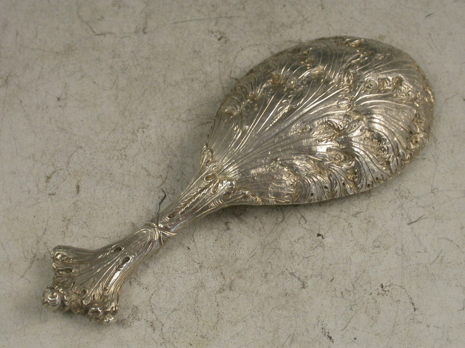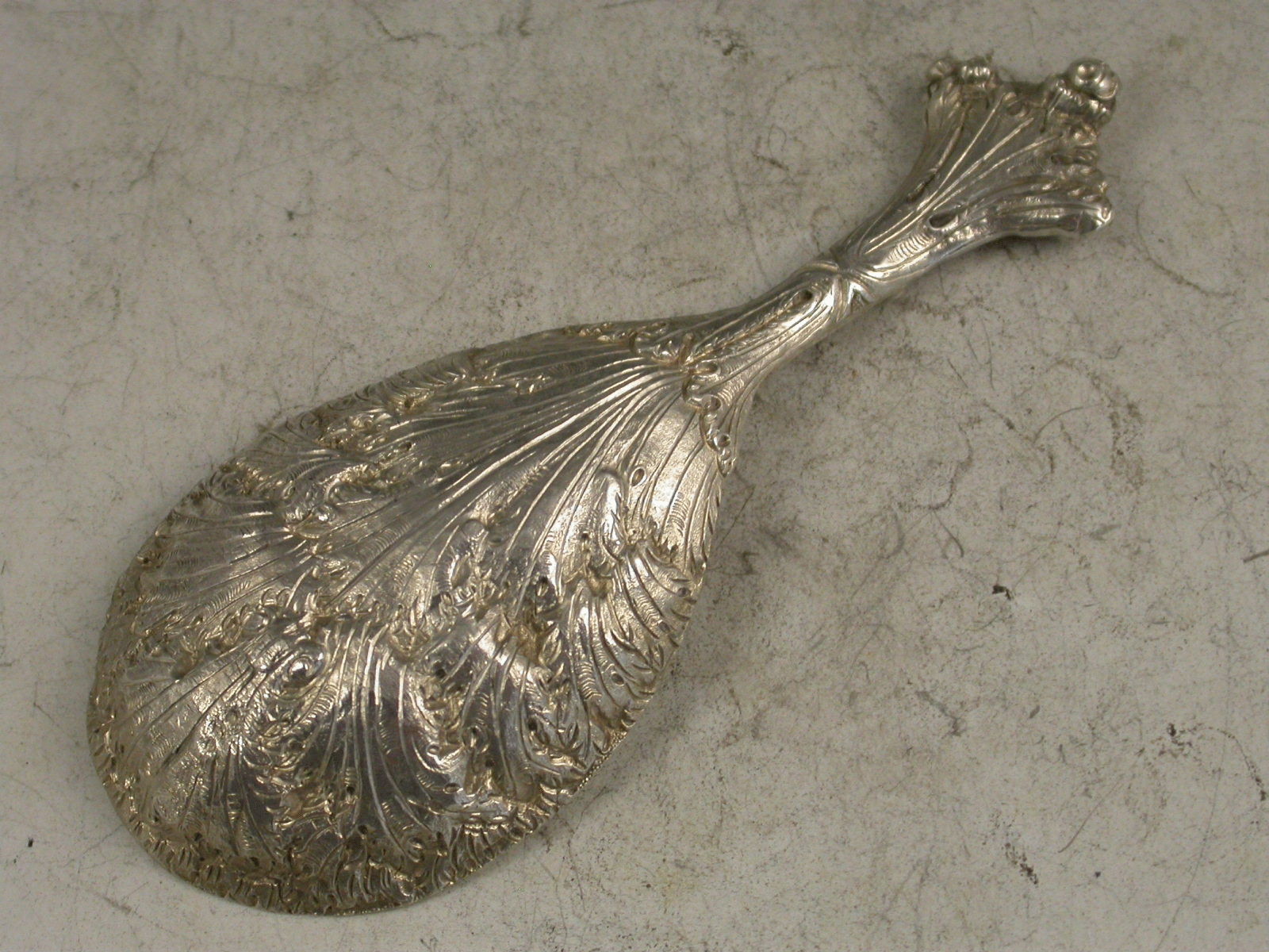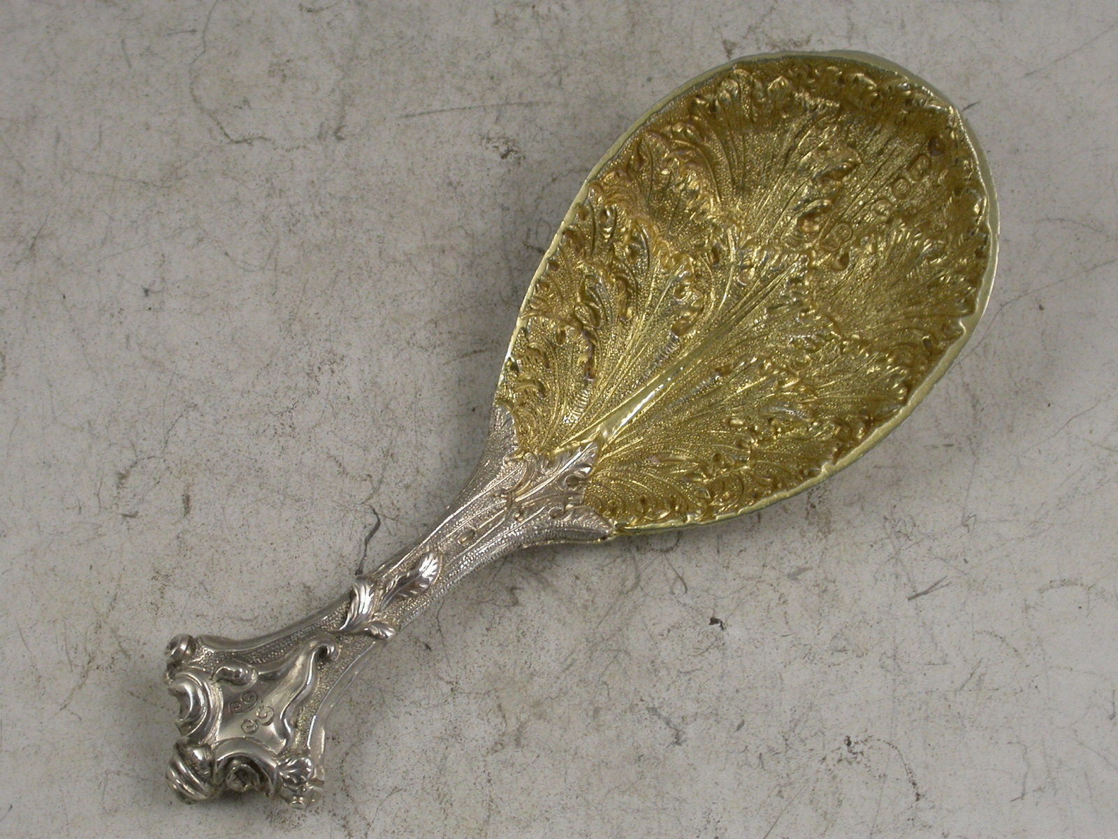 A good quality Victorian cast silver Caddy Spoon with silver gilt bowl and matted acanthus leaf decoration. The initials EC engraved to a cartouche on the tri-lobed handle.