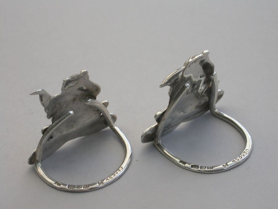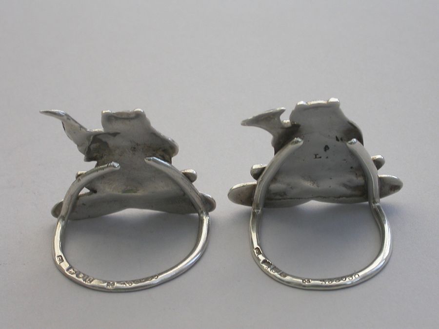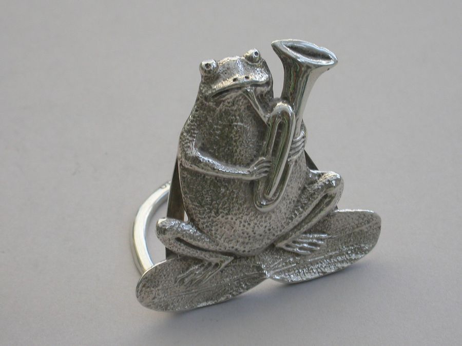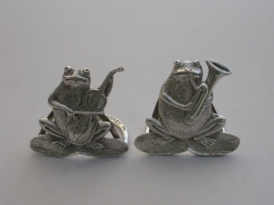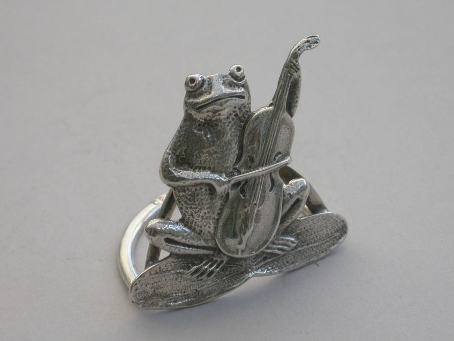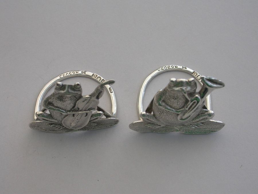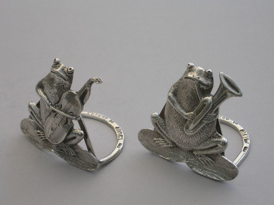 A fine quality and rare pair of Victorian cast silver Menu Holders, made in the form of Frogs playing musical instruments, seated on lily pads. 'D' shaped supports and stands.